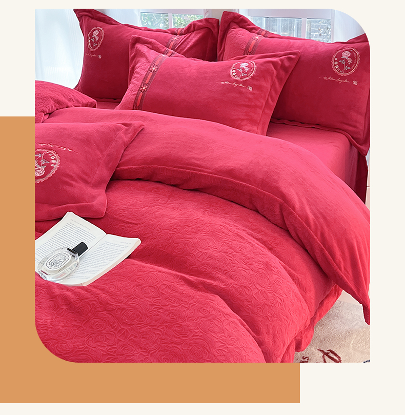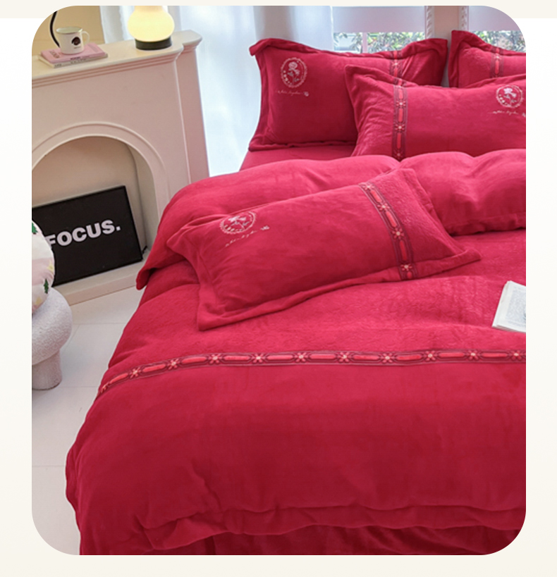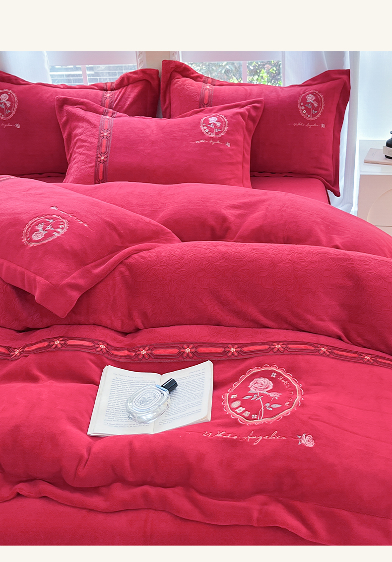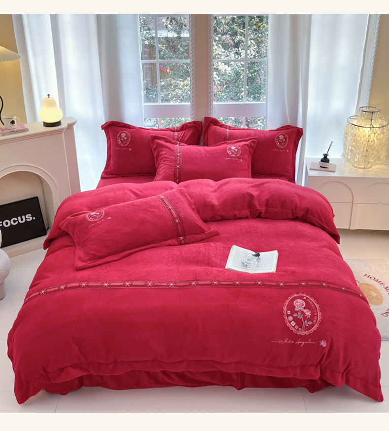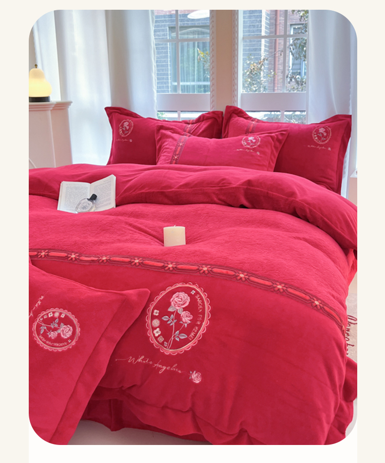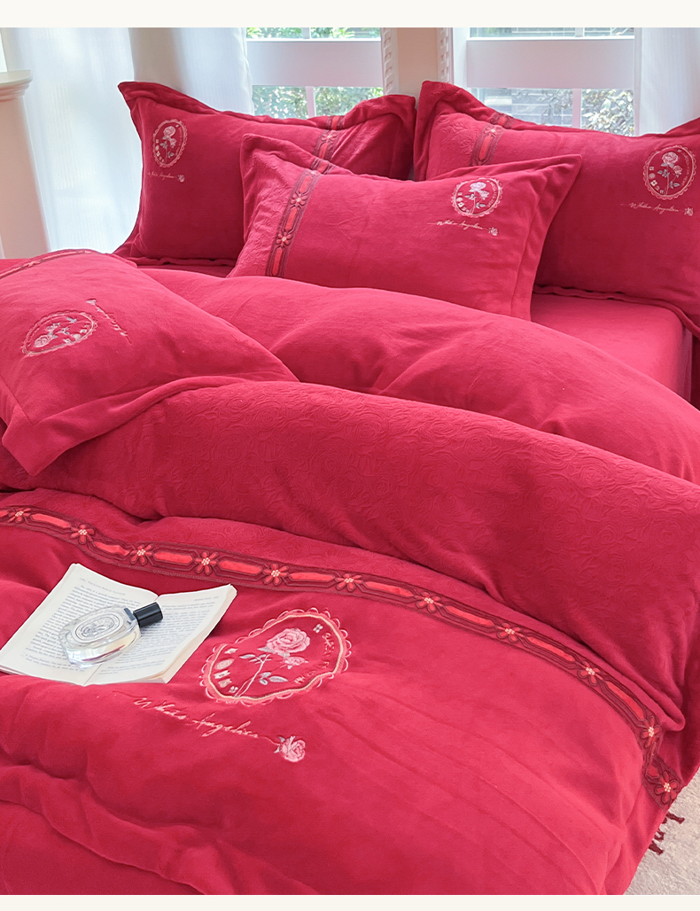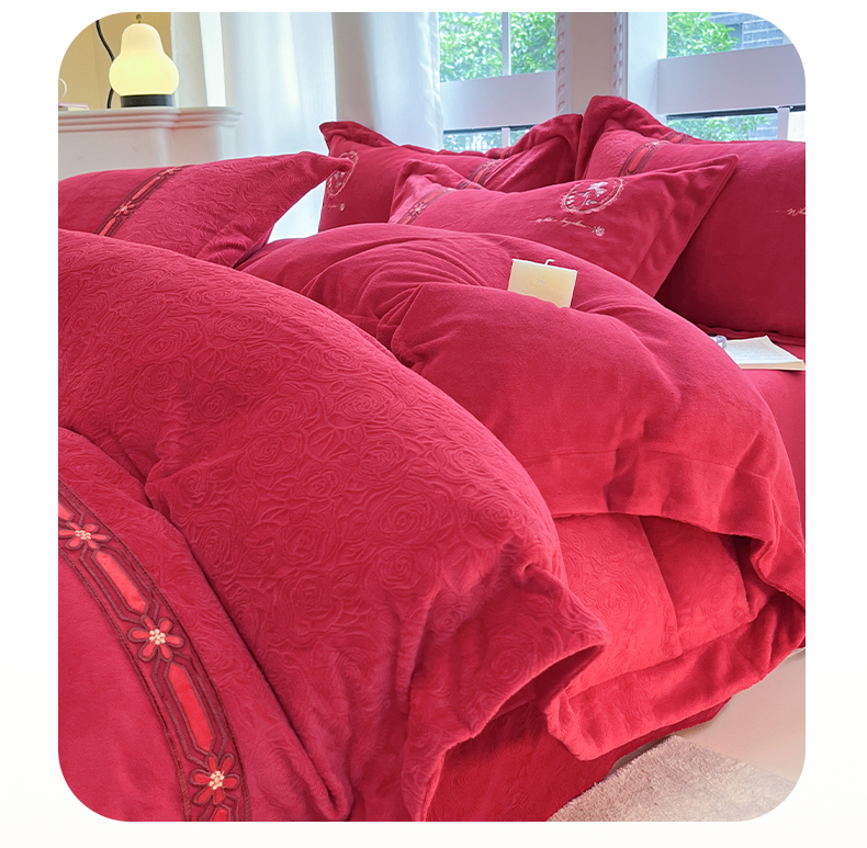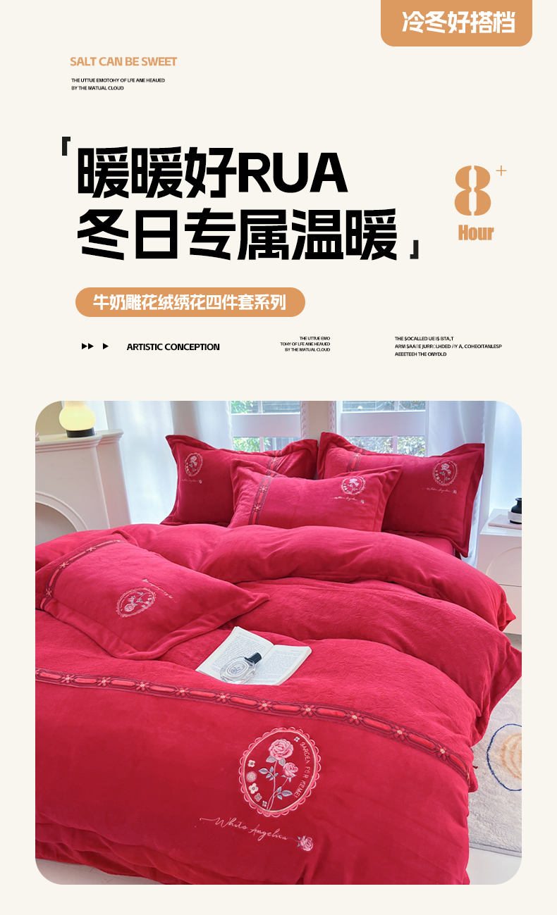 艾唯希家纺 2024新款牛奶雕花绒绣花工艺四件套系列 玫瑰的故事-红