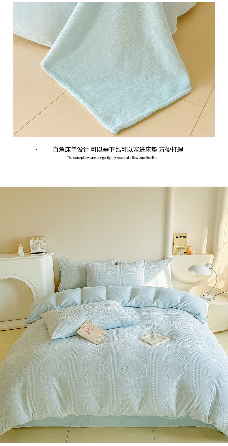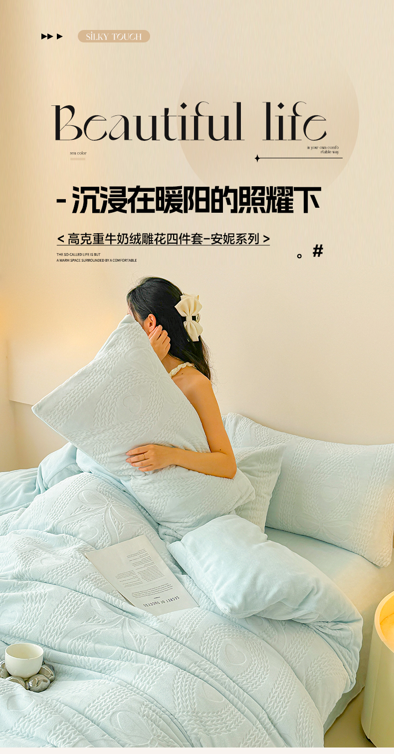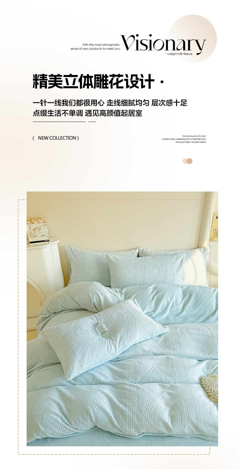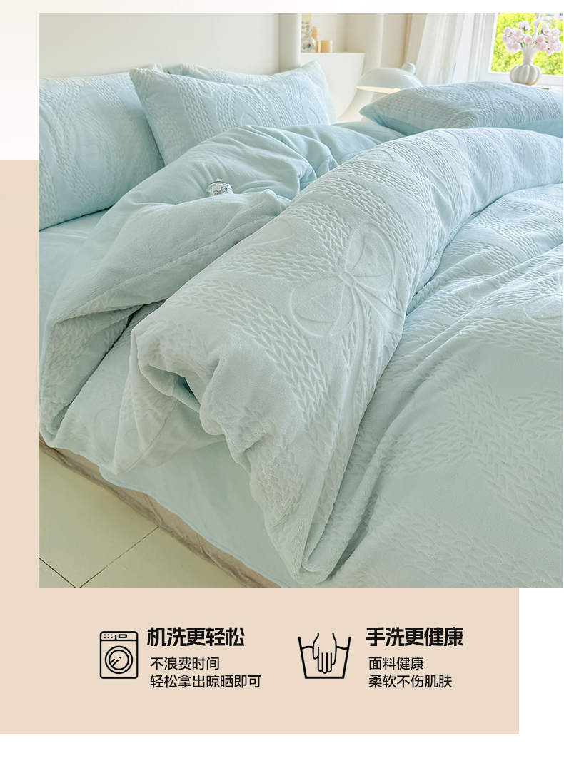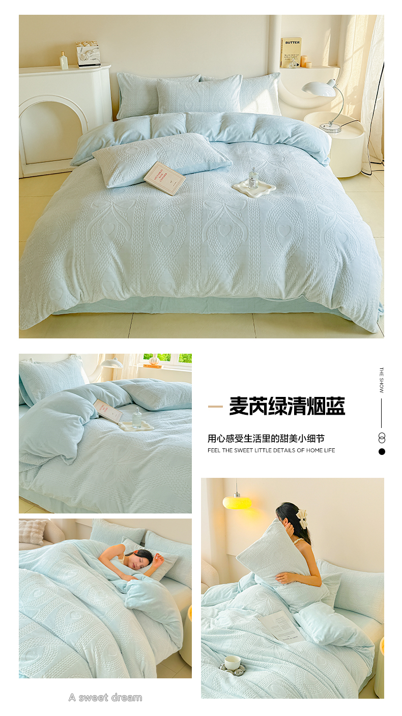 当前位置: 91家纺网 > 商品网购 > 床品套件 > 四件套 > 牛奶绒四件套 > 莱登卡奴 2024新款高克重牛奶绒雕花四件套-安妮系列 麦芮绿清烟蓝