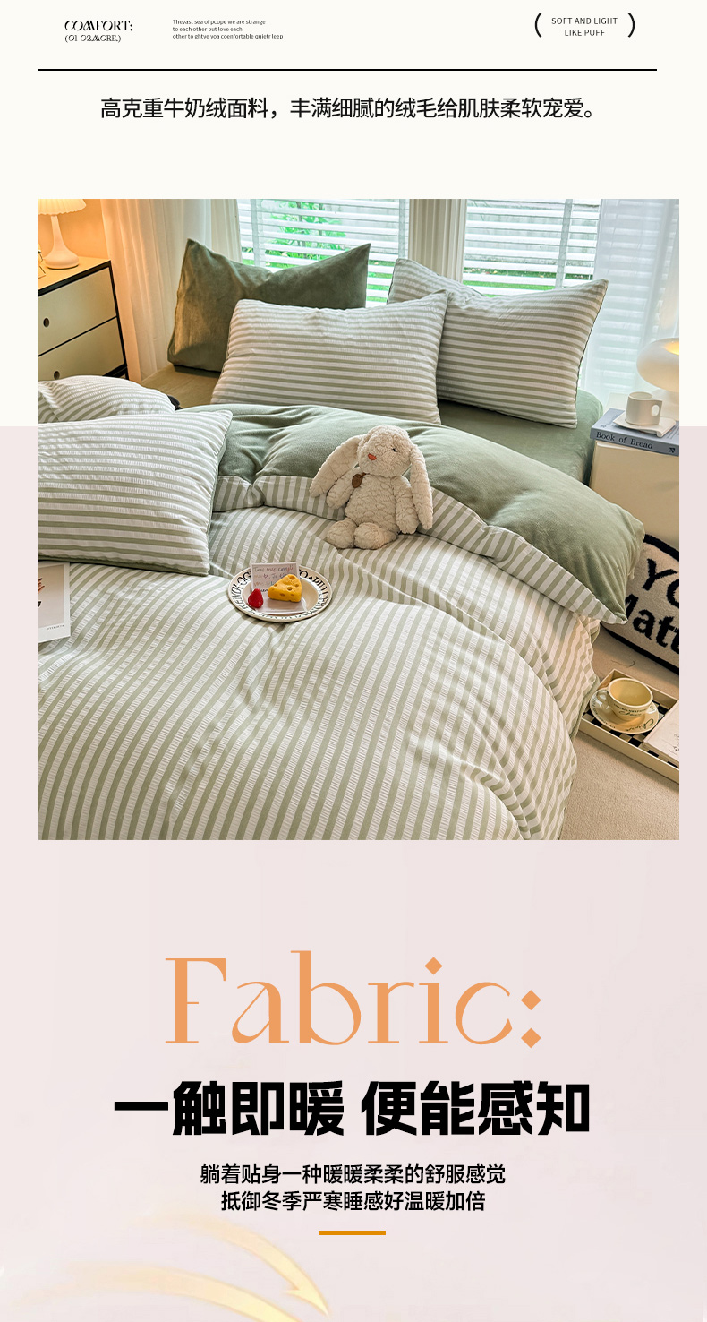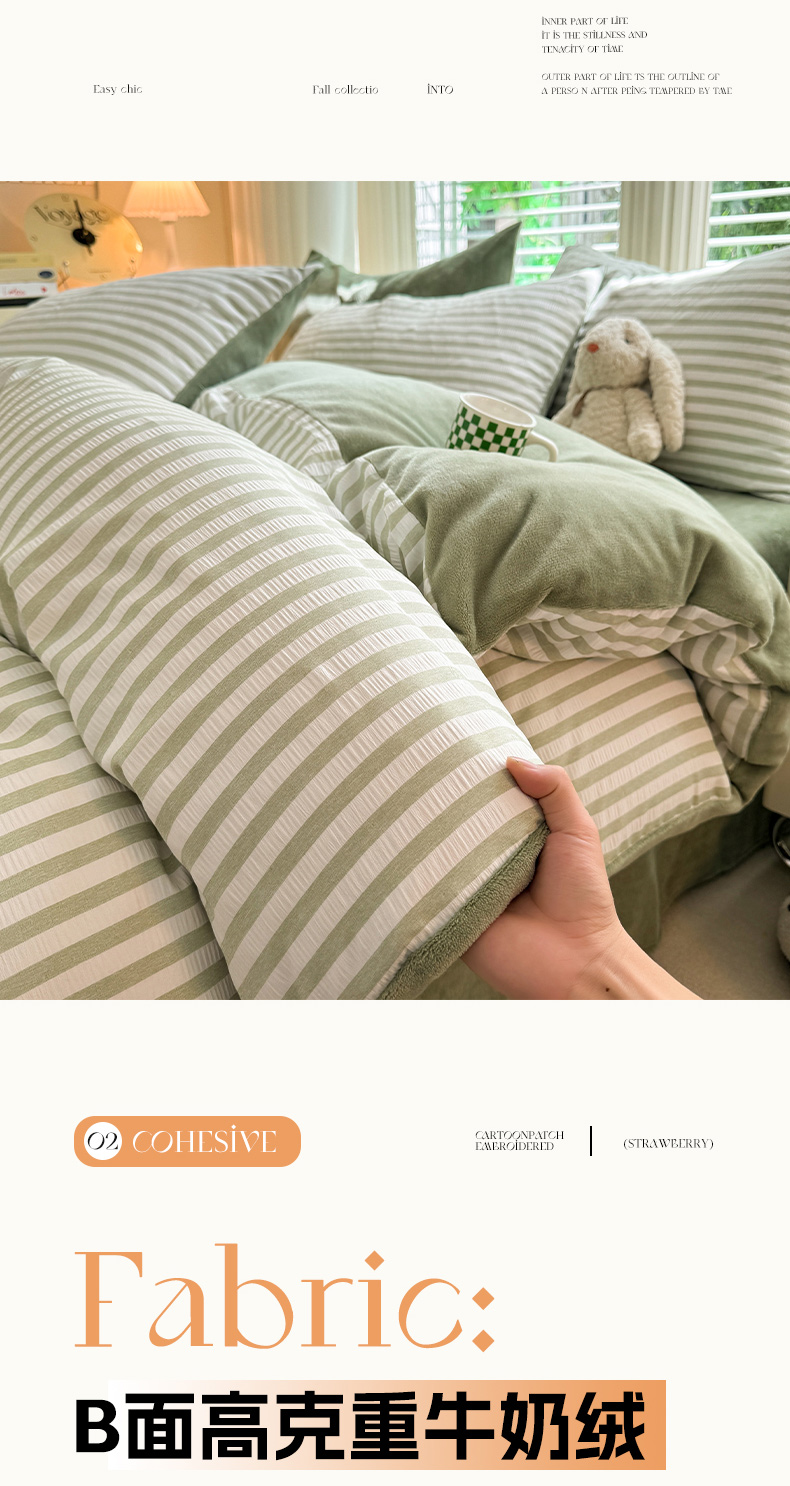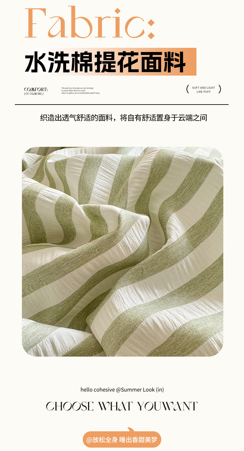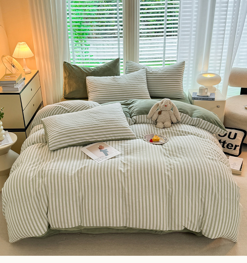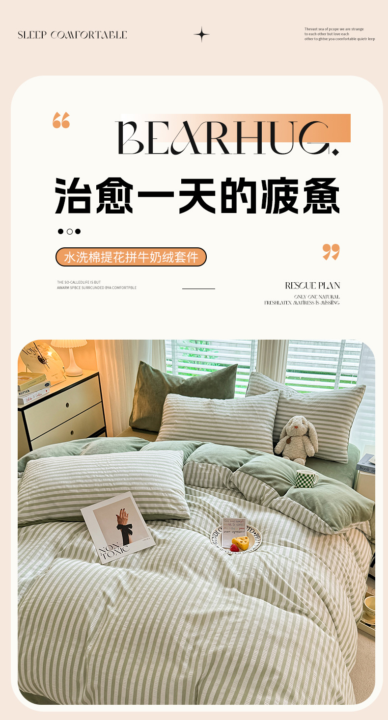 当前位置: 91家纺网 > 商品网购 > 床品套件 > 四件套 > 牛奶绒四件套 > 恩和 2024新款水洗棉提花拼牛奶绒套件 绿白条