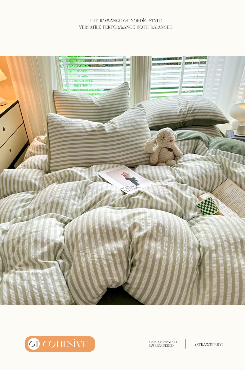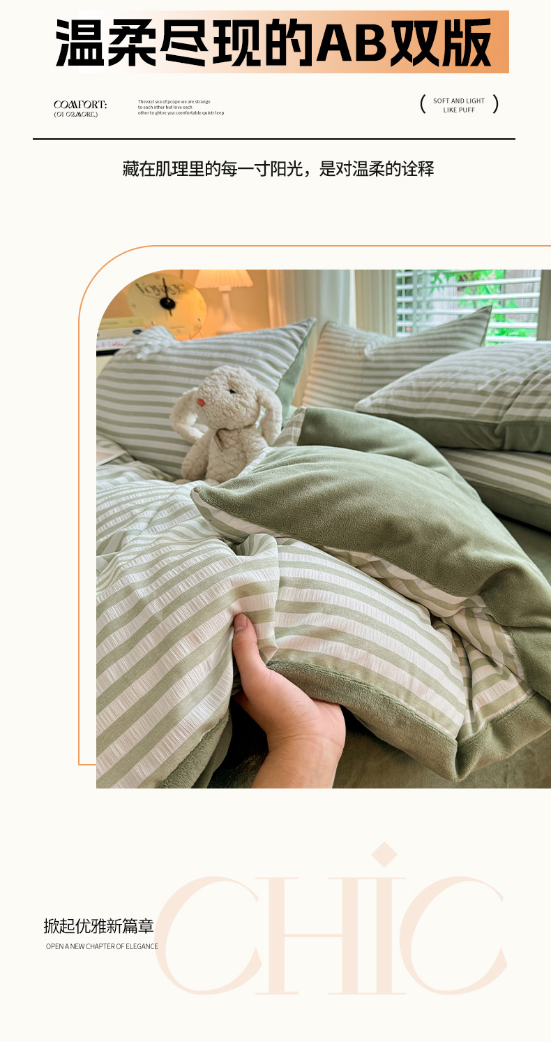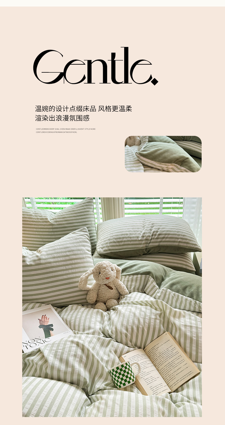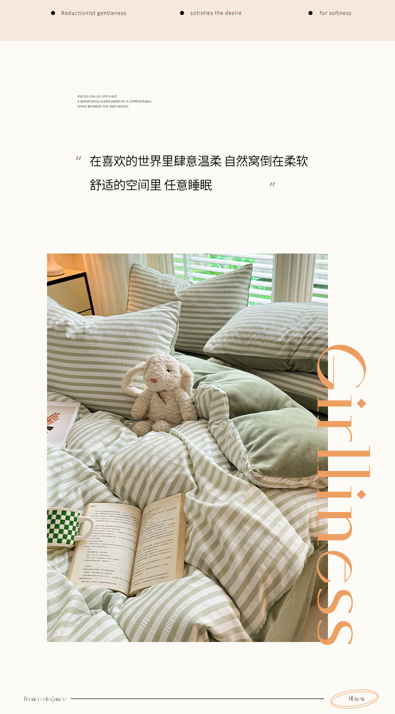 当前位置: 91家纺网 > 商品网购 > 床品套件 > 四件套 > 牛奶绒四件套 > 恩和 2024新款水洗棉提花拼牛奶绒套件 绿白条