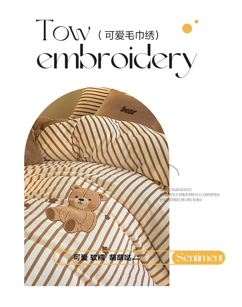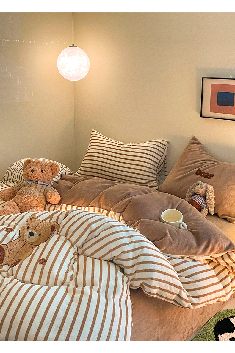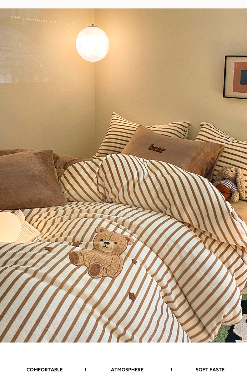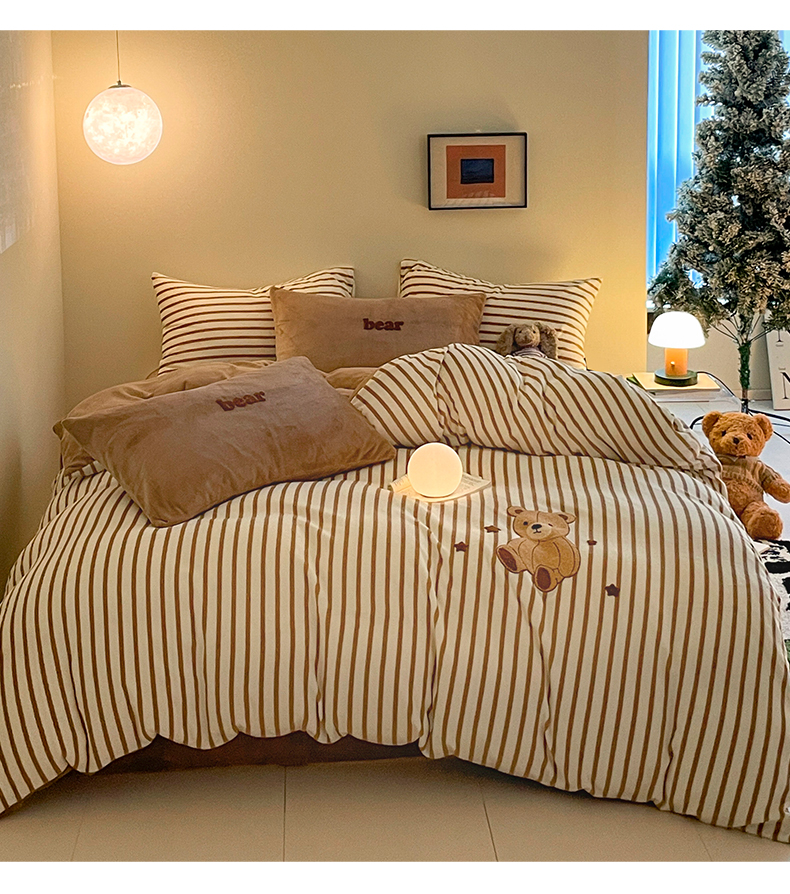 如一 2024新款元素毛巾绣条纹牛奶绒四件套 抱抱熊
