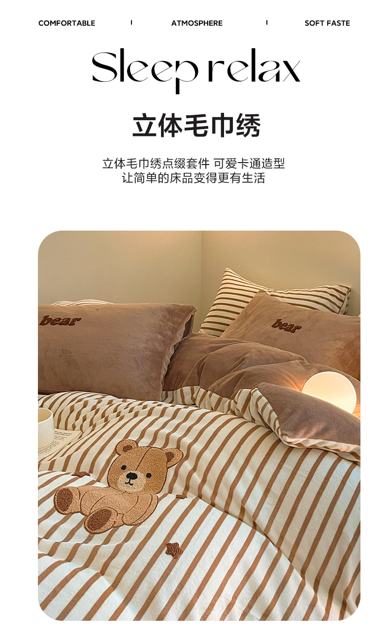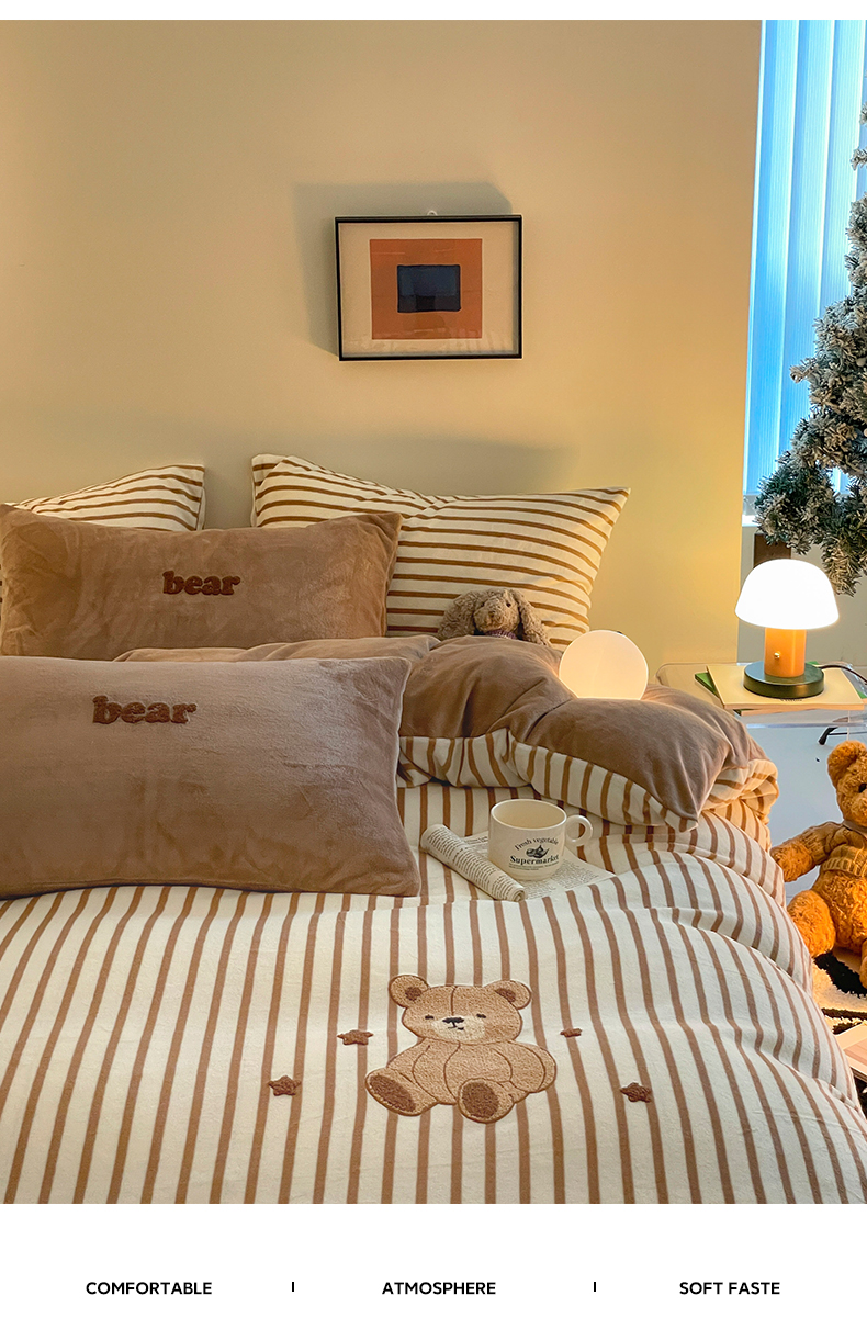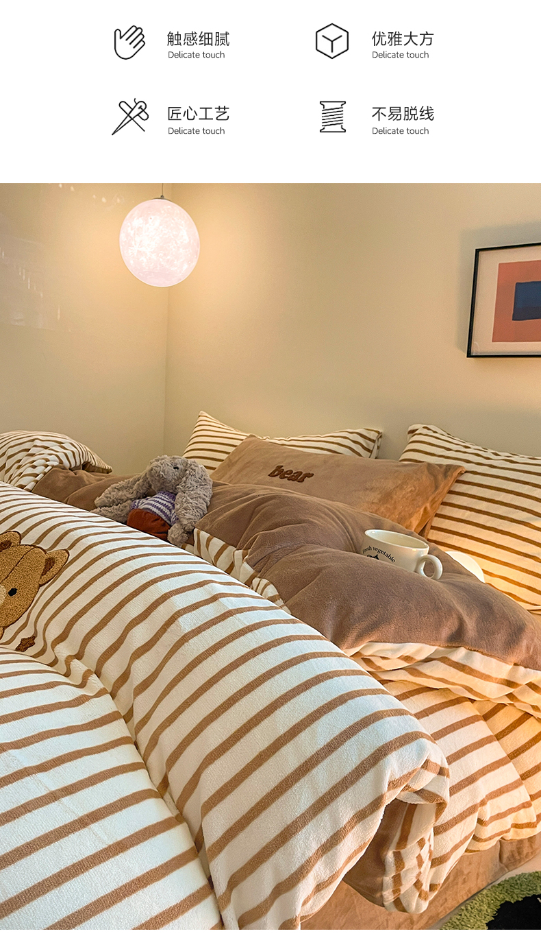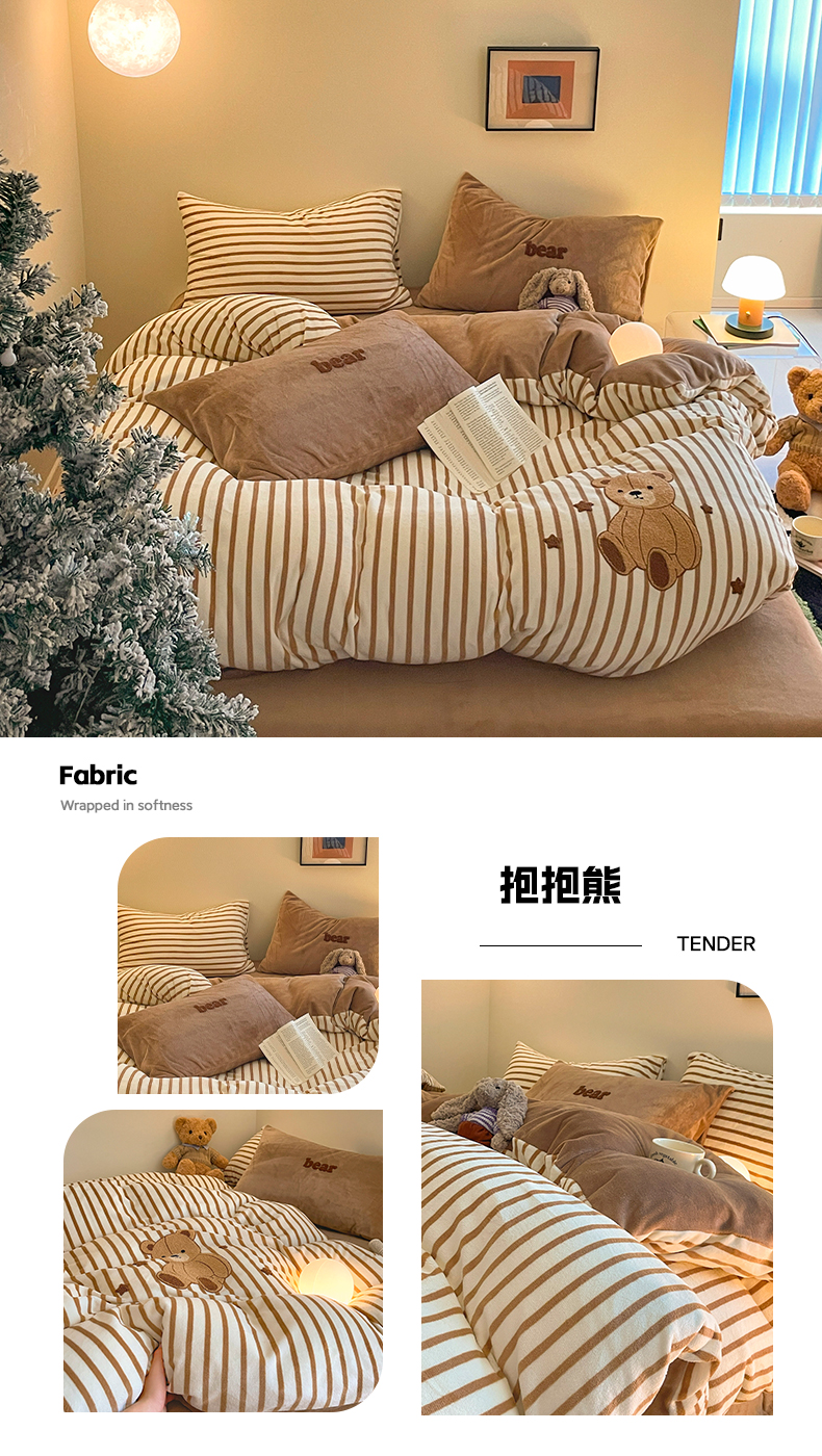 商品名称:如一 2024新款元素毛巾绣条纹牛奶绒四件套 抱抱熊