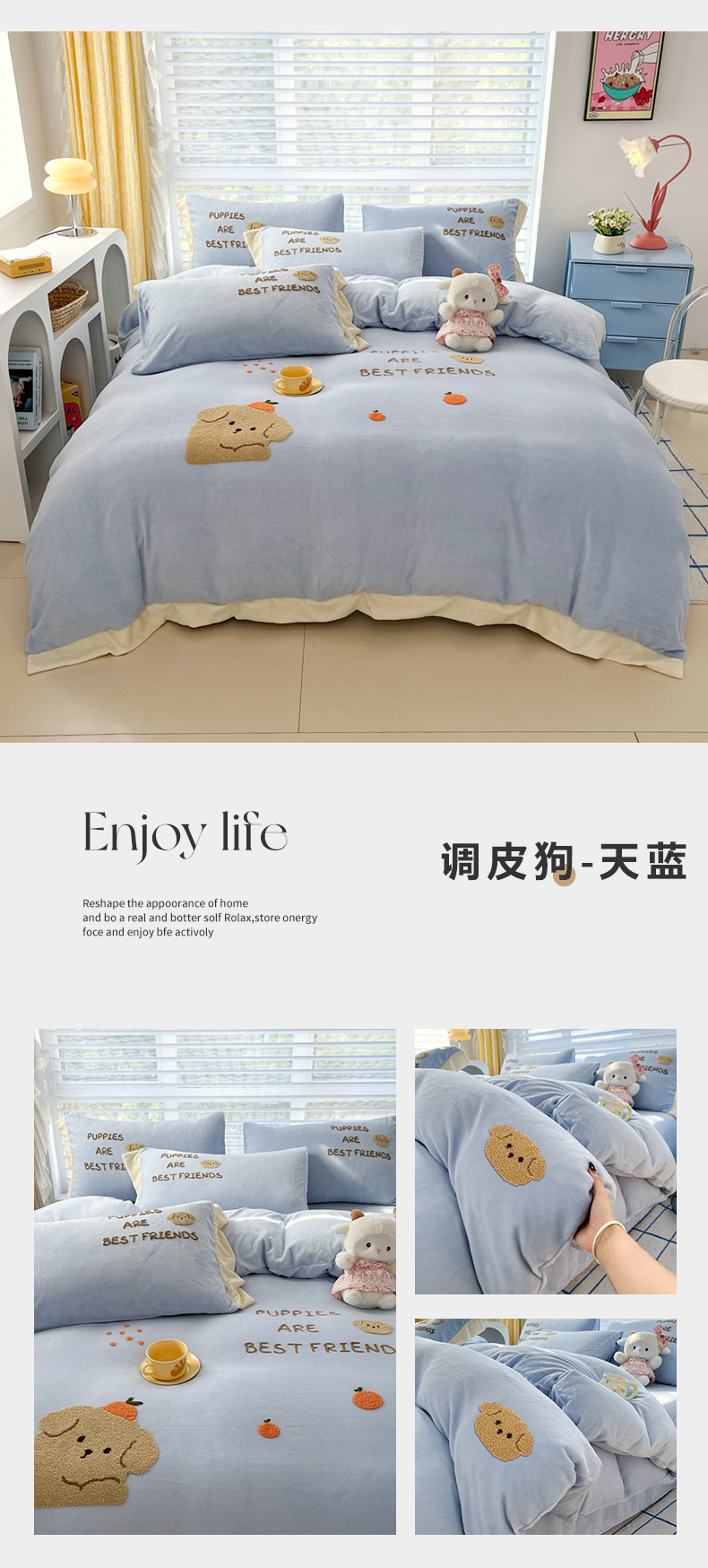 商品名称:眷恋家纺 2024新款牛奶绒毛巾绣宽边四件套-调皮狗系列 调皮狗-天蓝