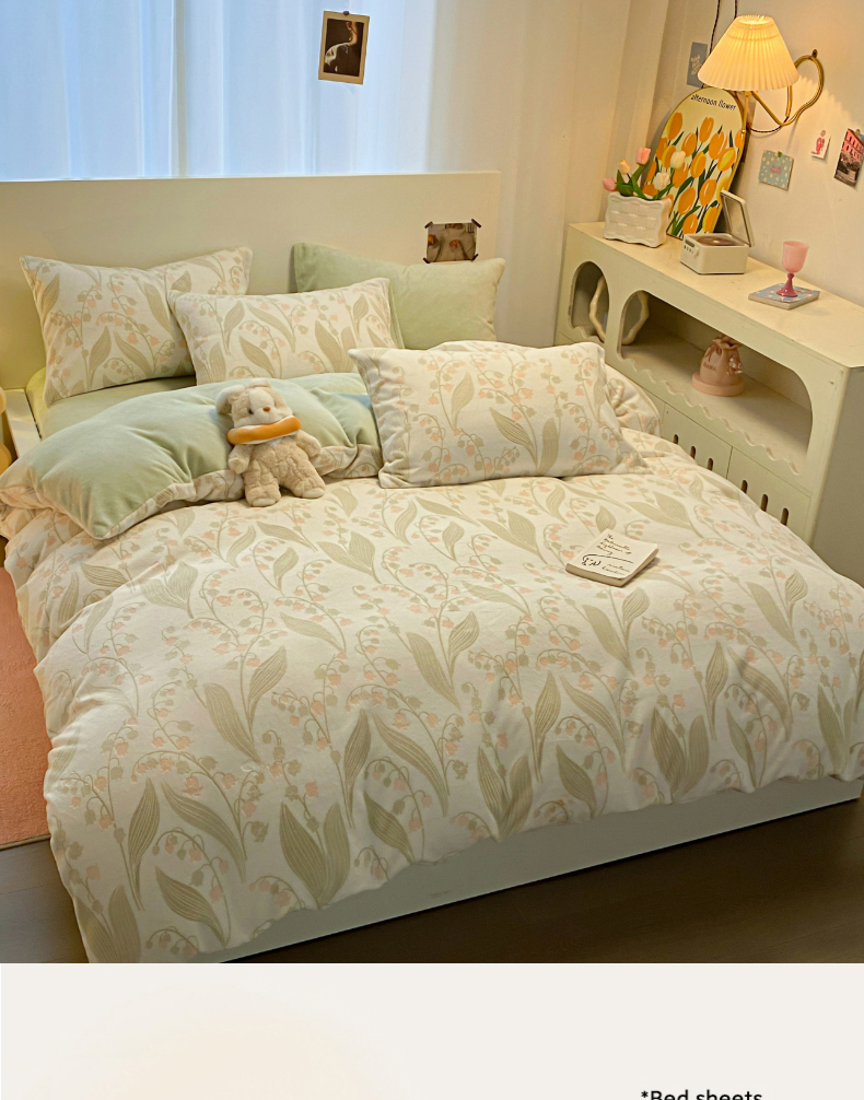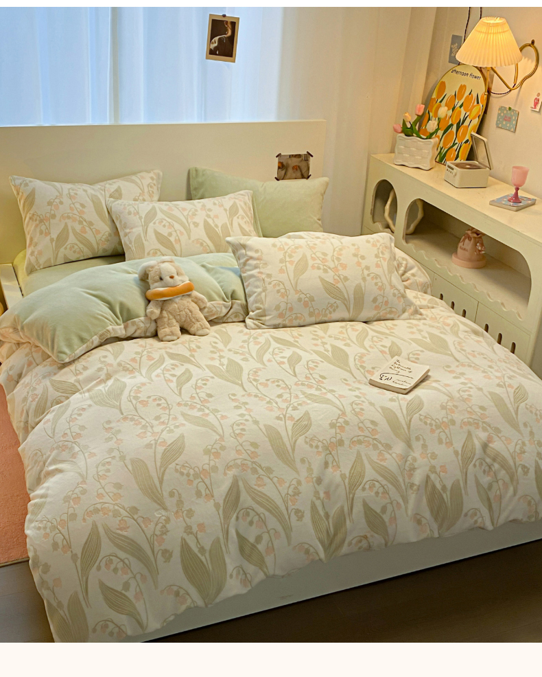呗旺鹿 2024新款高克重着色烂花雕花牛奶绒轻奢四件套 春日铃兰清新绿