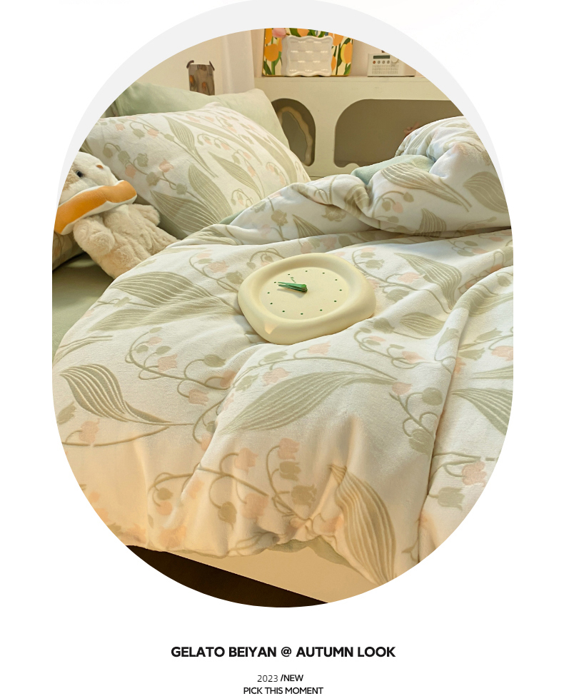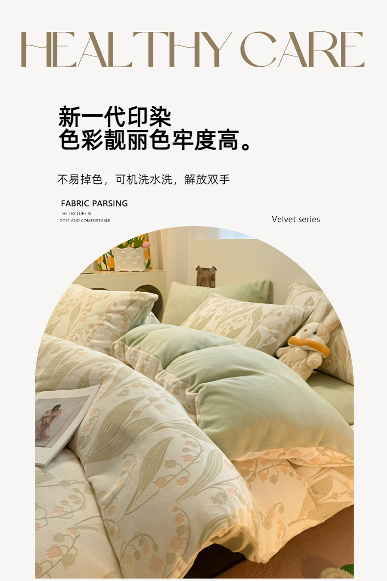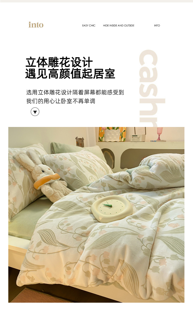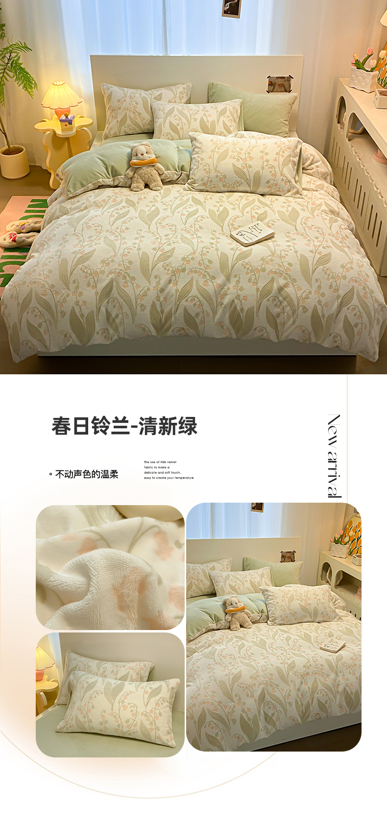 商品名称:呗旺鹿 2024新款高克重着色烂花雕花牛奶绒轻奢四件套 春日铃兰清新绿