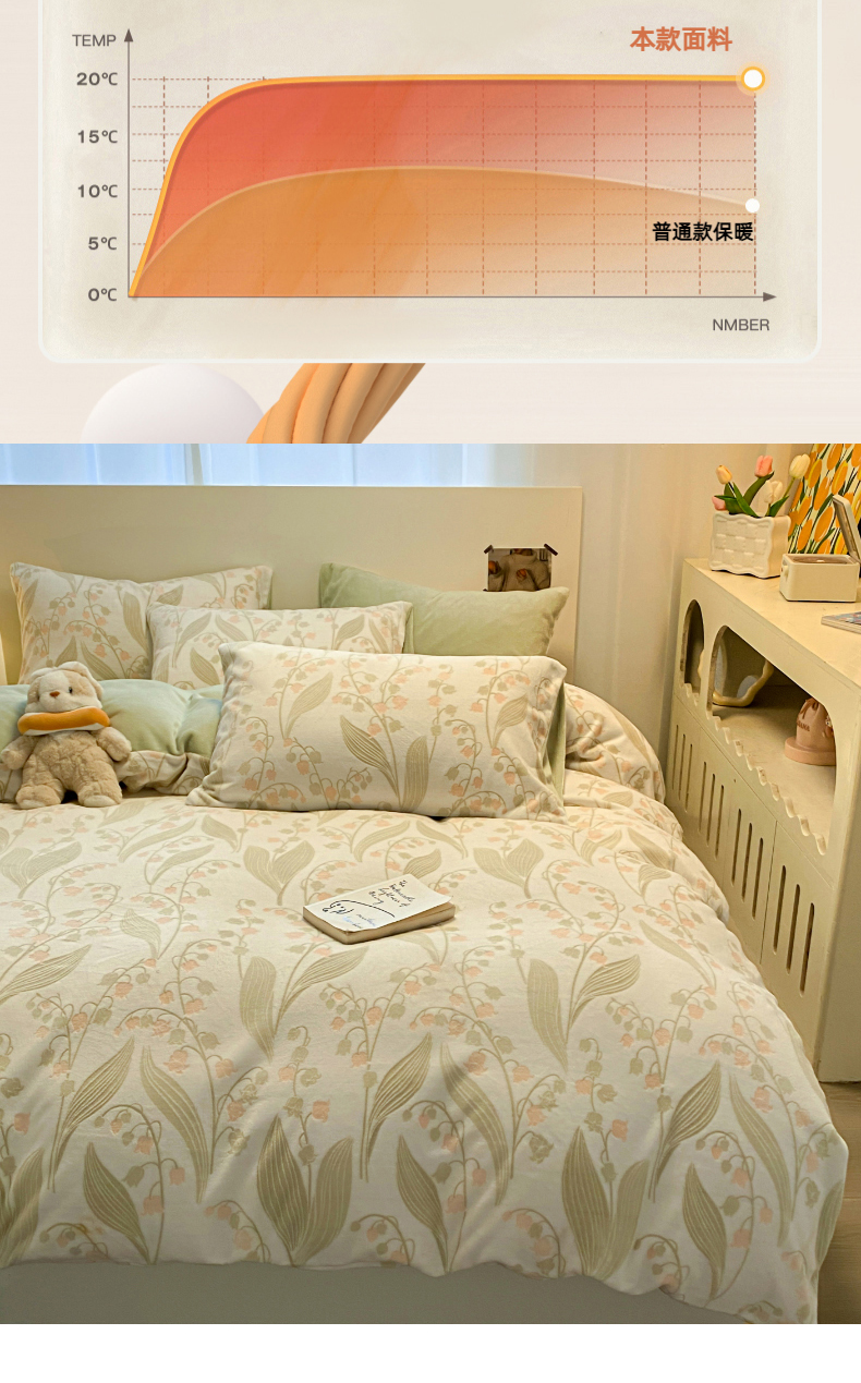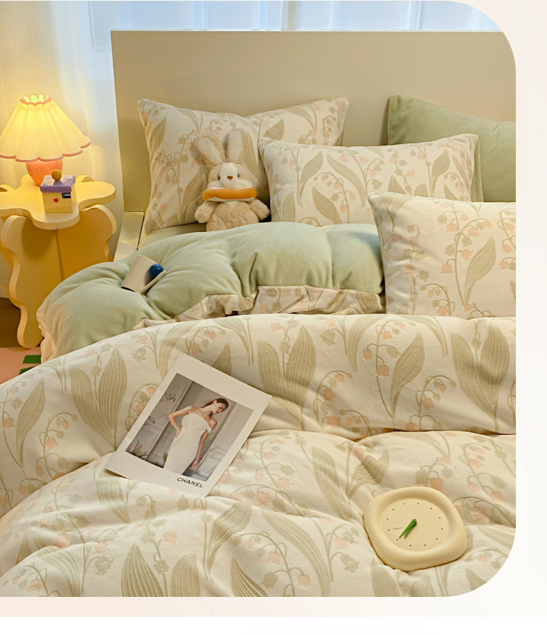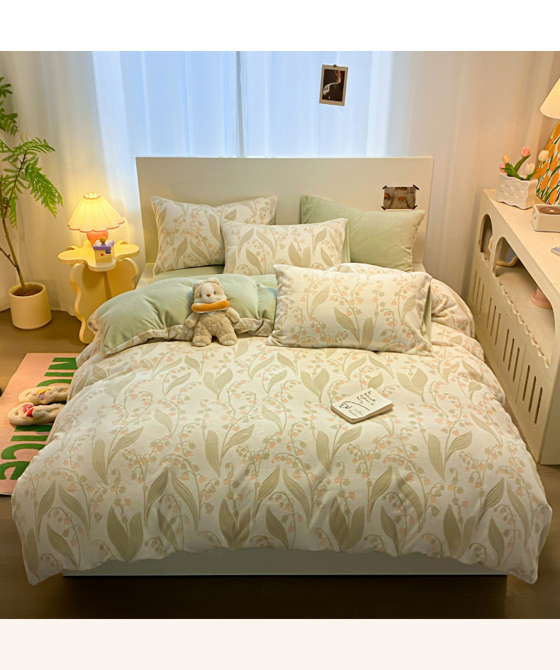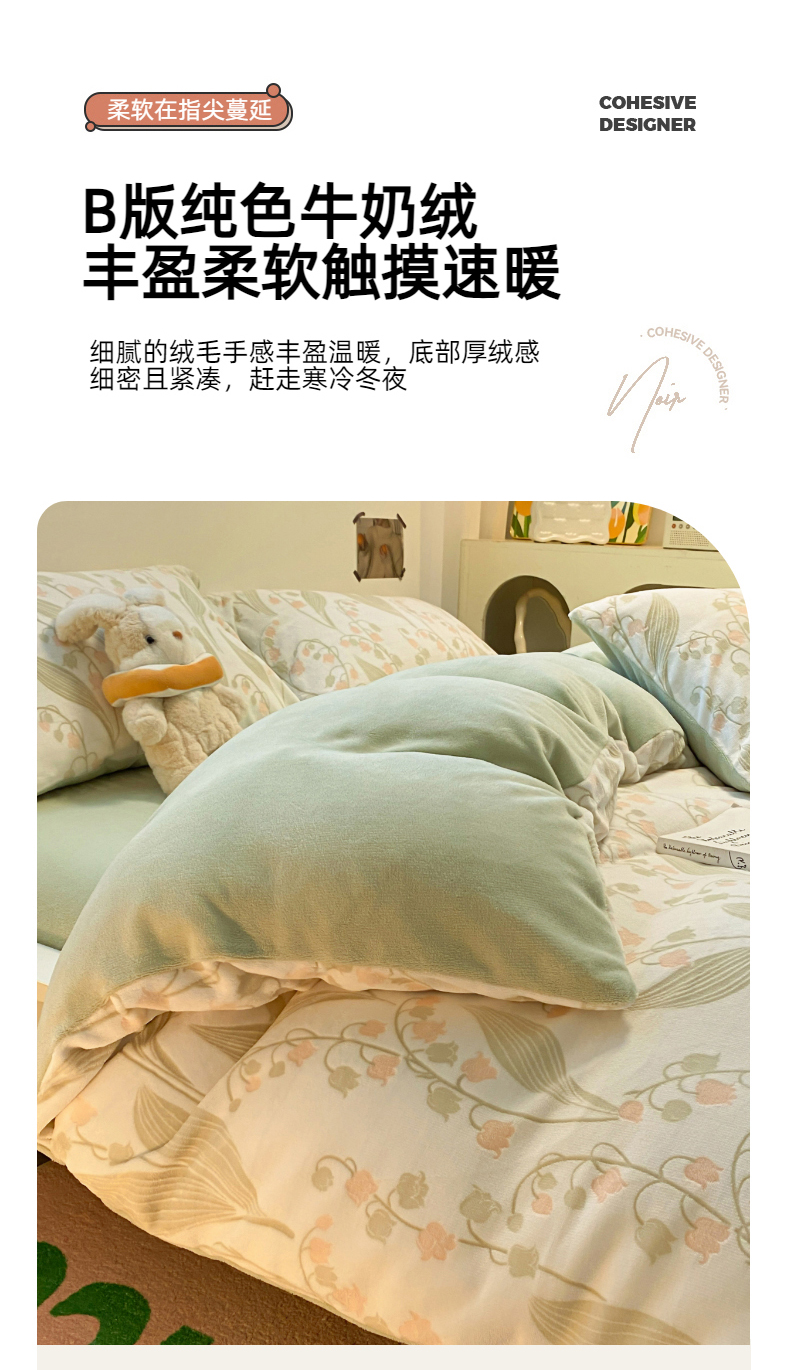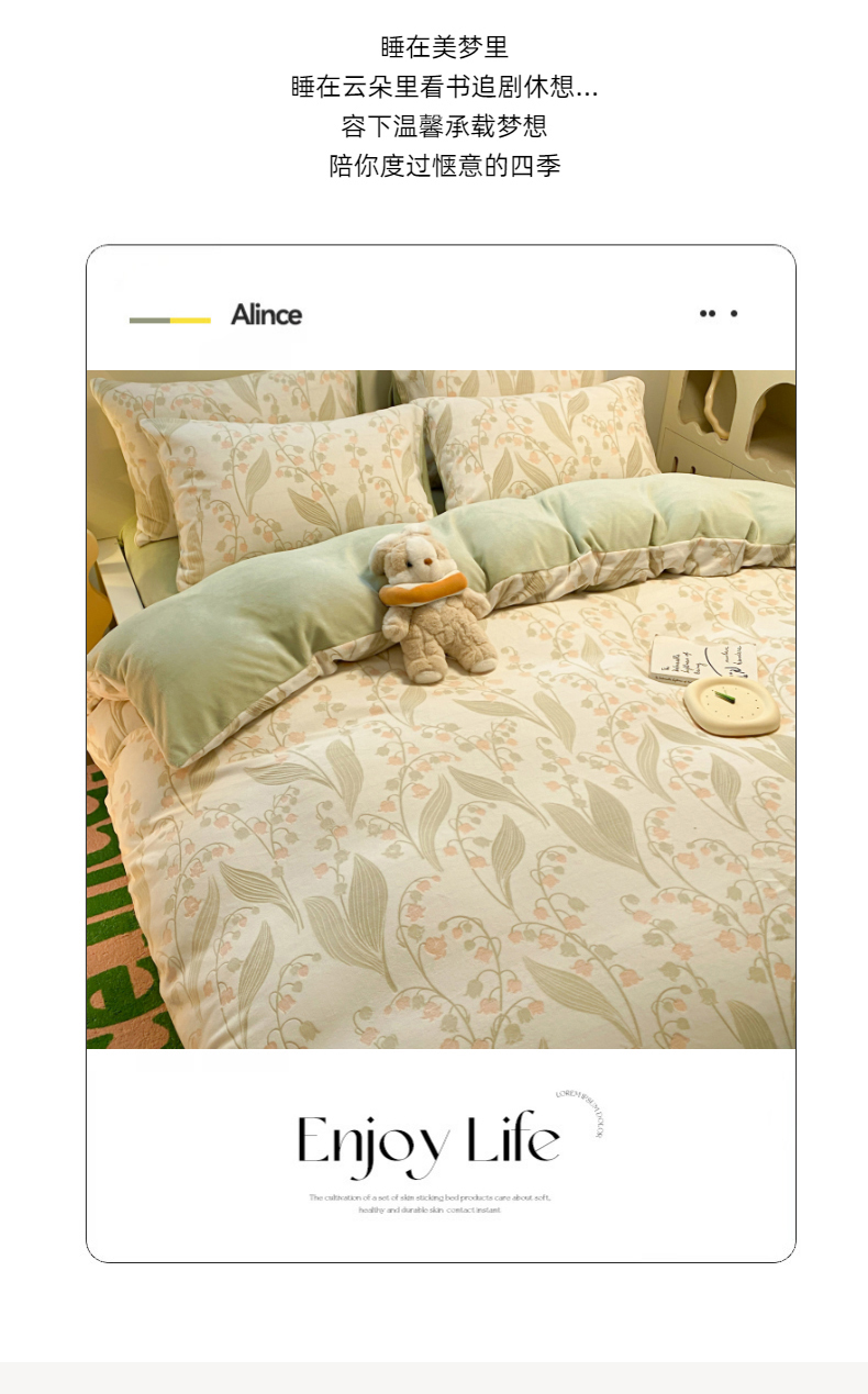 商品名称:呗旺鹿 2024新款高克重着色烂花雕花牛奶绒轻奢四件套 春日铃兰清新绿