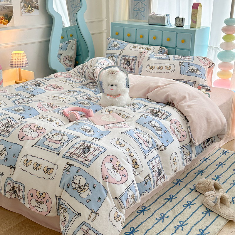 昔可家纺 2024新款印花牛奶绒四件套系列-卡通系列 蓝底小奶狗