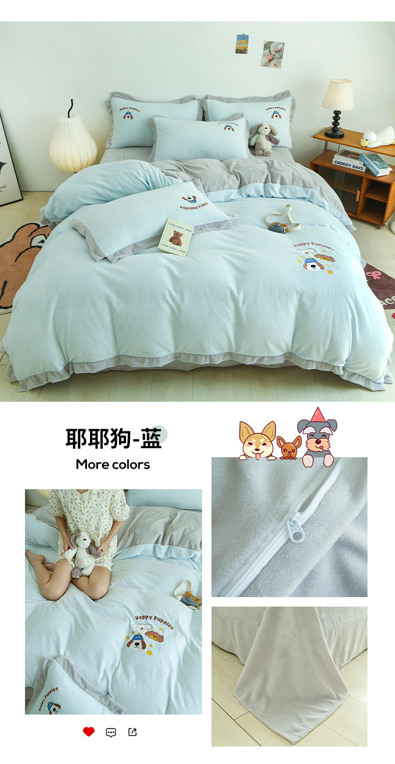 商品名称:大渔生活 2025新款高克重卡通牛奶绒刺绣四件套--耶耶狗 耶耶狗-蓝
