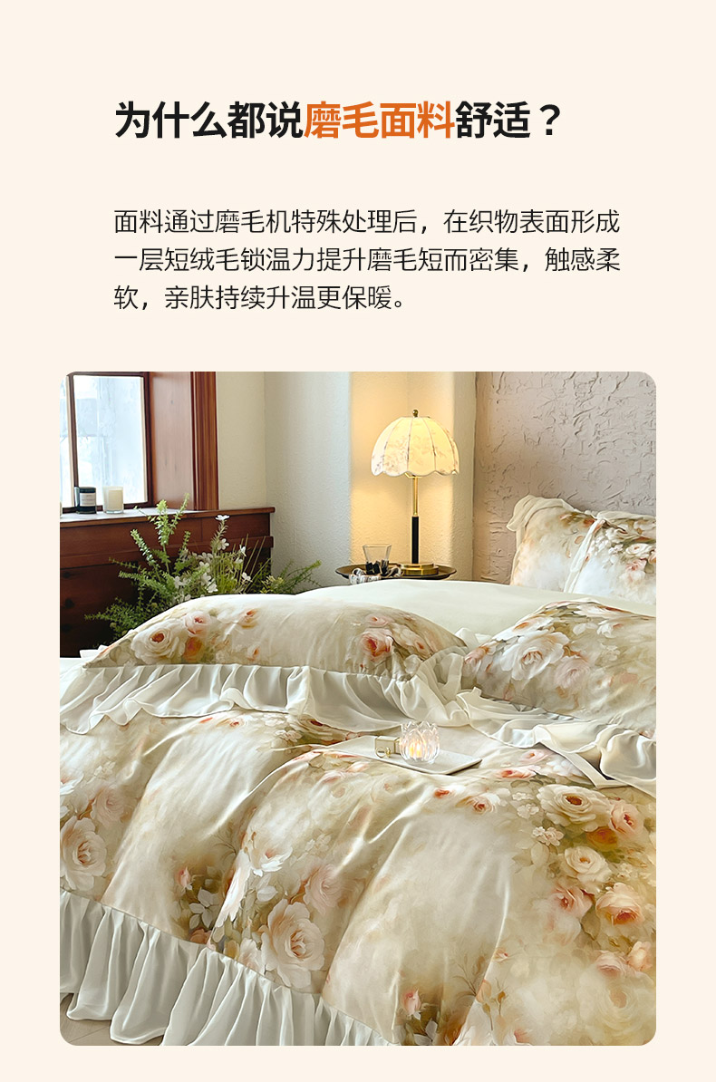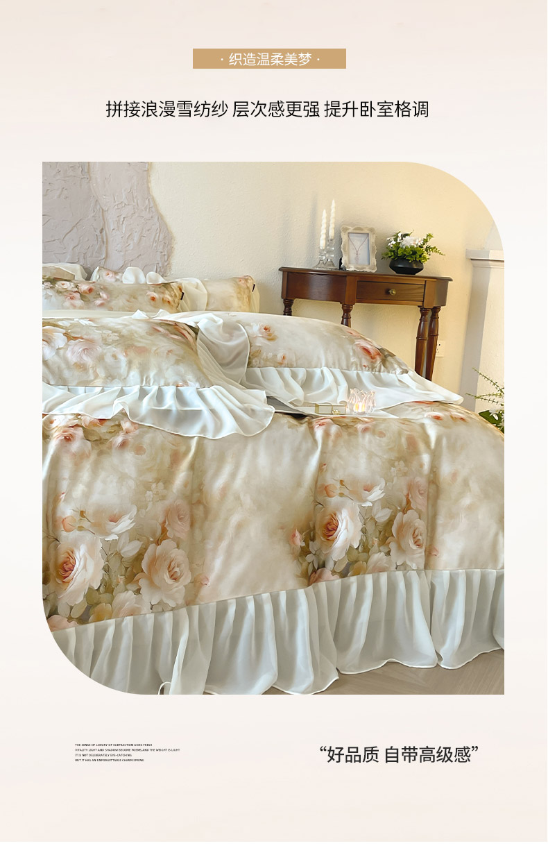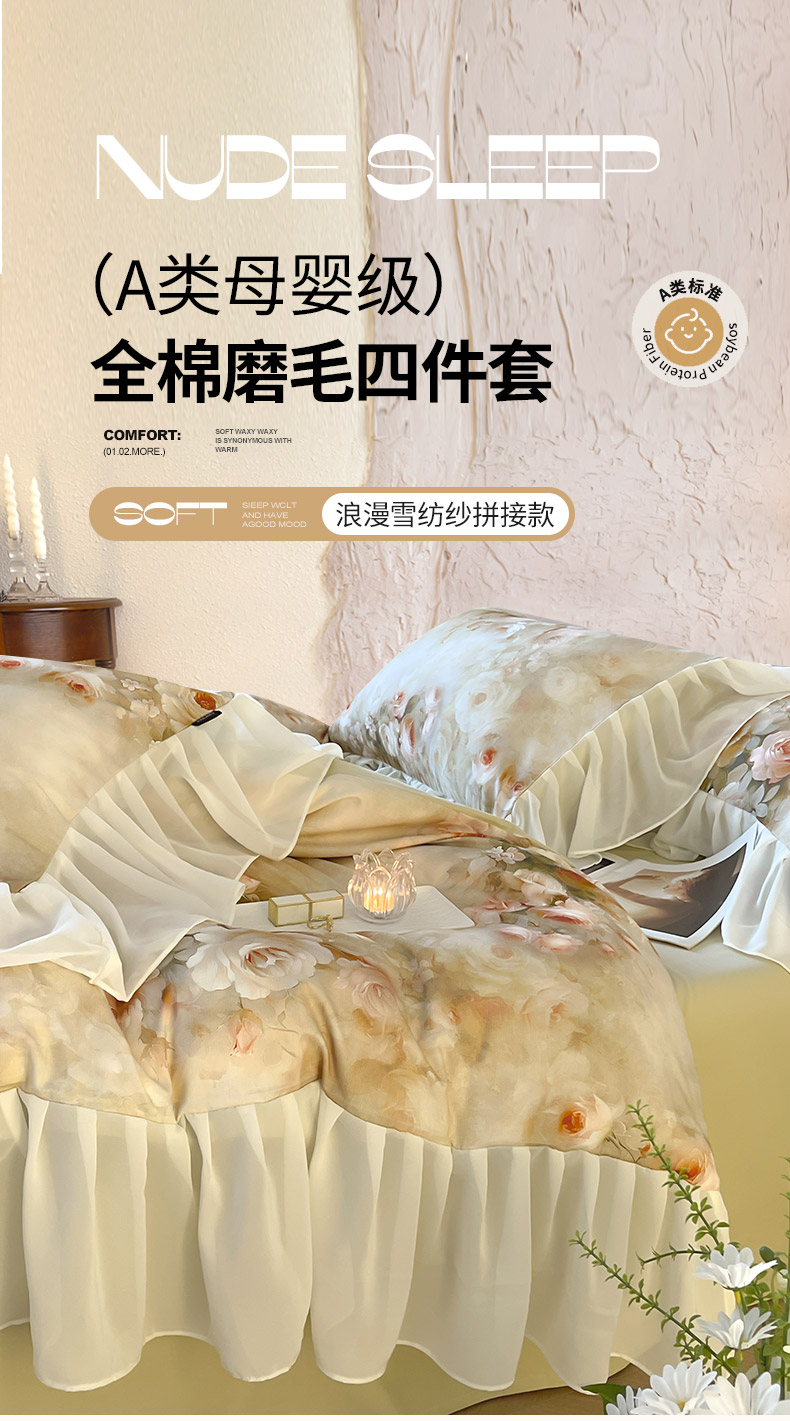 商品名称:A类全工艺全棉磨毛四件套纯棉雪纺纱拼接浪漫法式风加厚保暖床单被套秋冬床上用品 竹叶杏