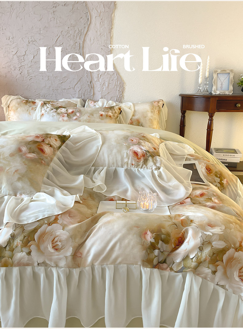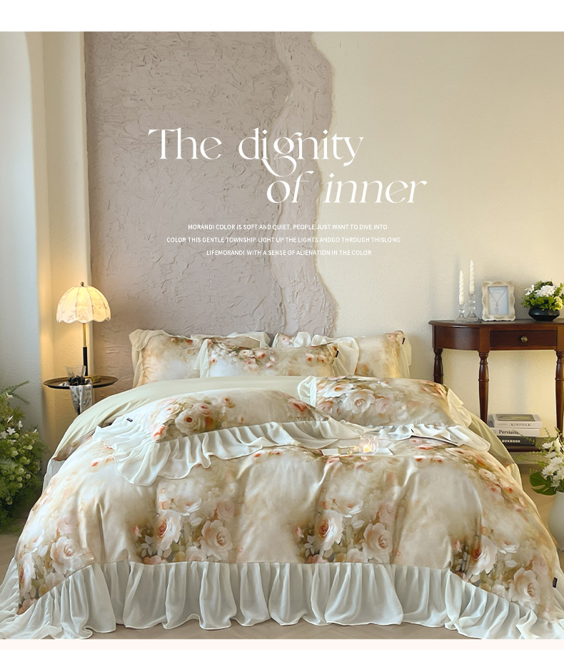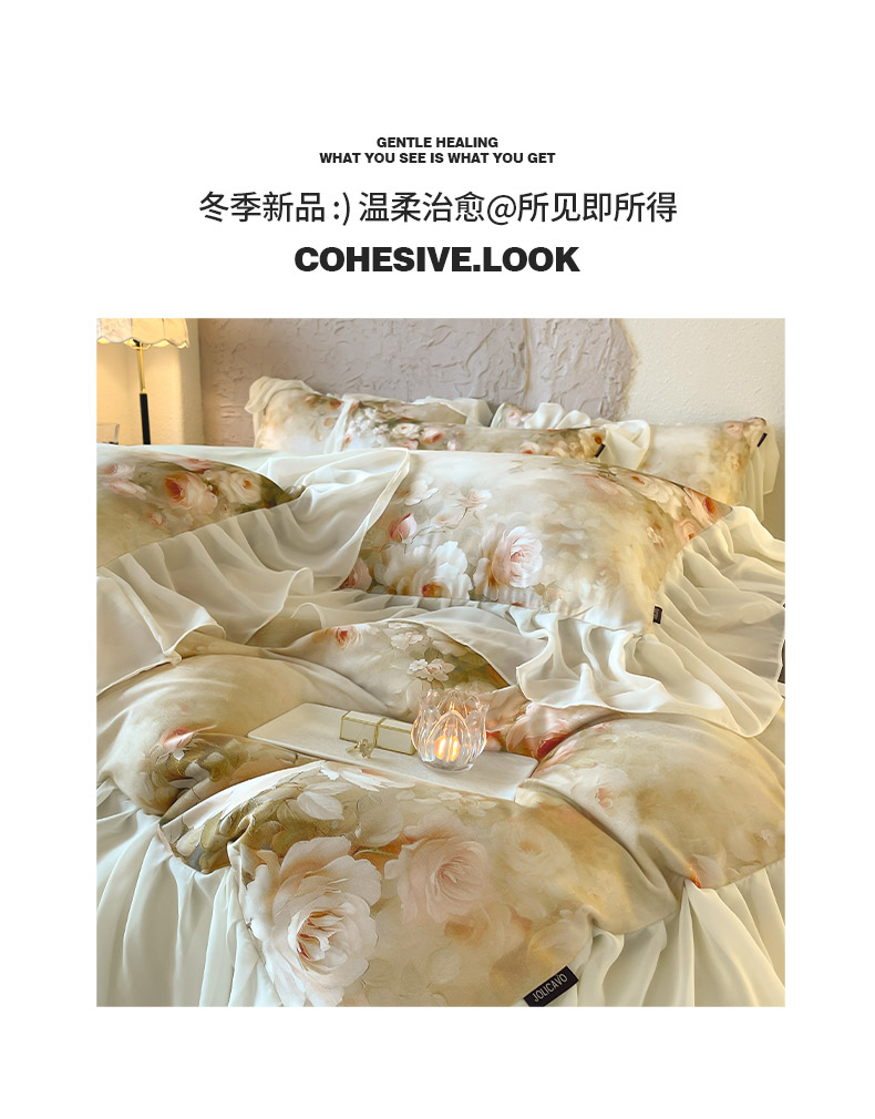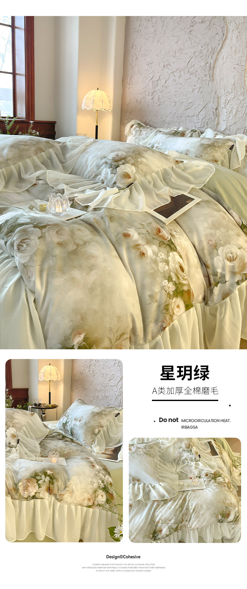 A类全工艺全棉磨毛四件套纯棉雪纺纱拼接浪漫法式风加厚保暖床单被套秋冬床上用品 竹叶杏