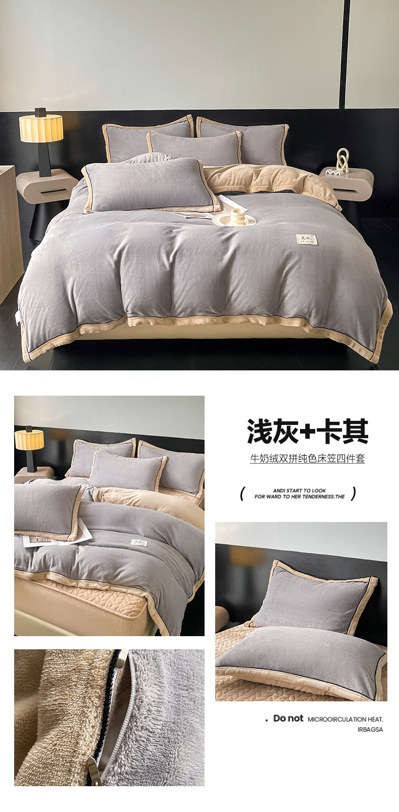 当前位置: 91家纺网 > 商品网购 > 床品套件 > 四件套 > 牛奶绒四件套 > 欧邦 新款纯色双拼牛奶绒夹棉床笠四件套 浅灰+卡其