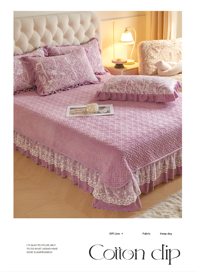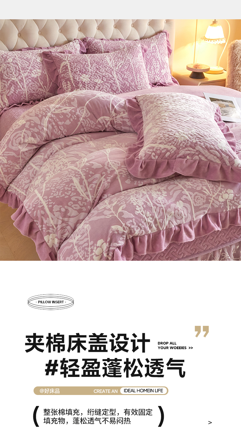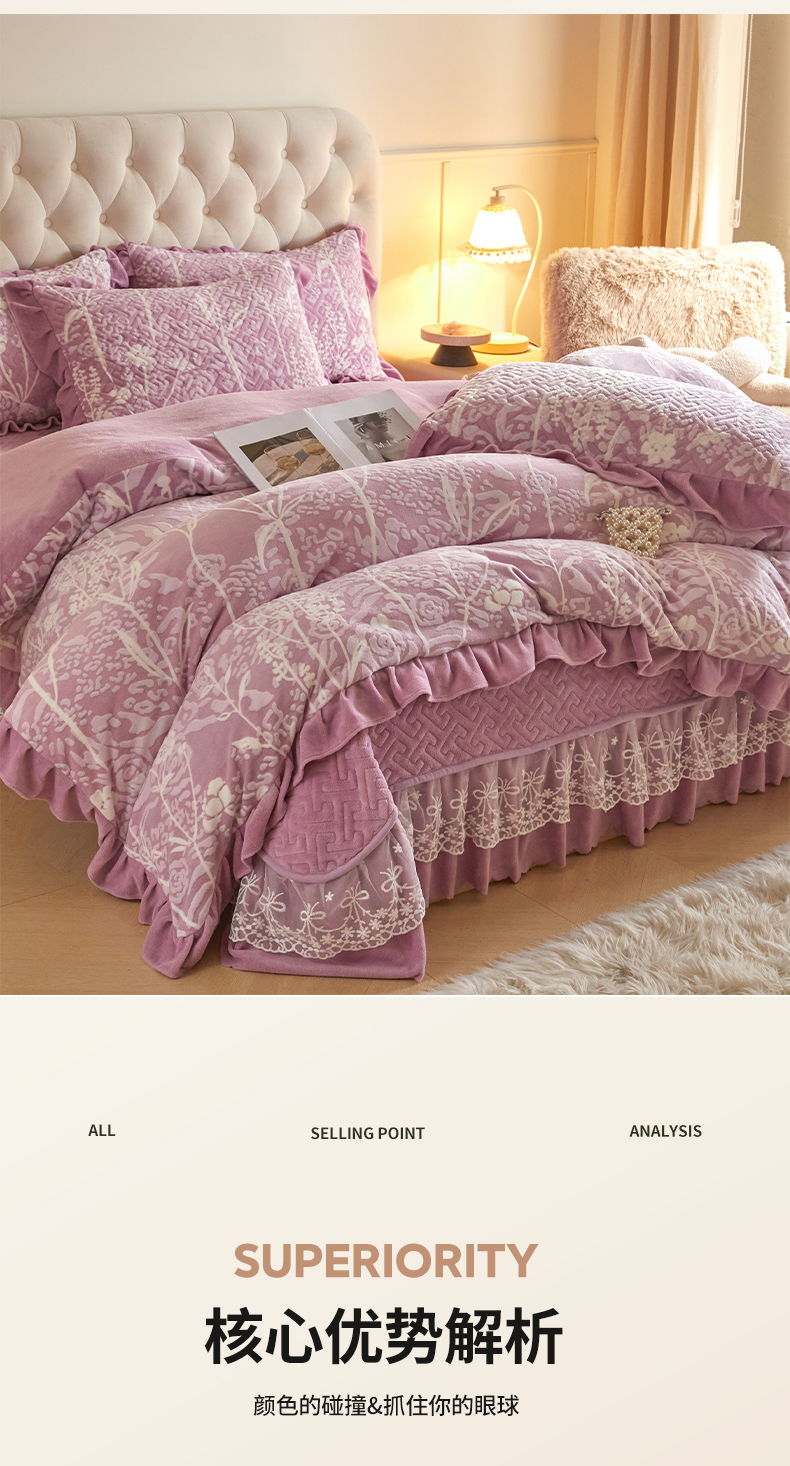 商品名称:畅畅家纺 2024新款11斤高克重新款韩版烂花牛奶绒床盖四件套系列 雾里看花-雪青紫