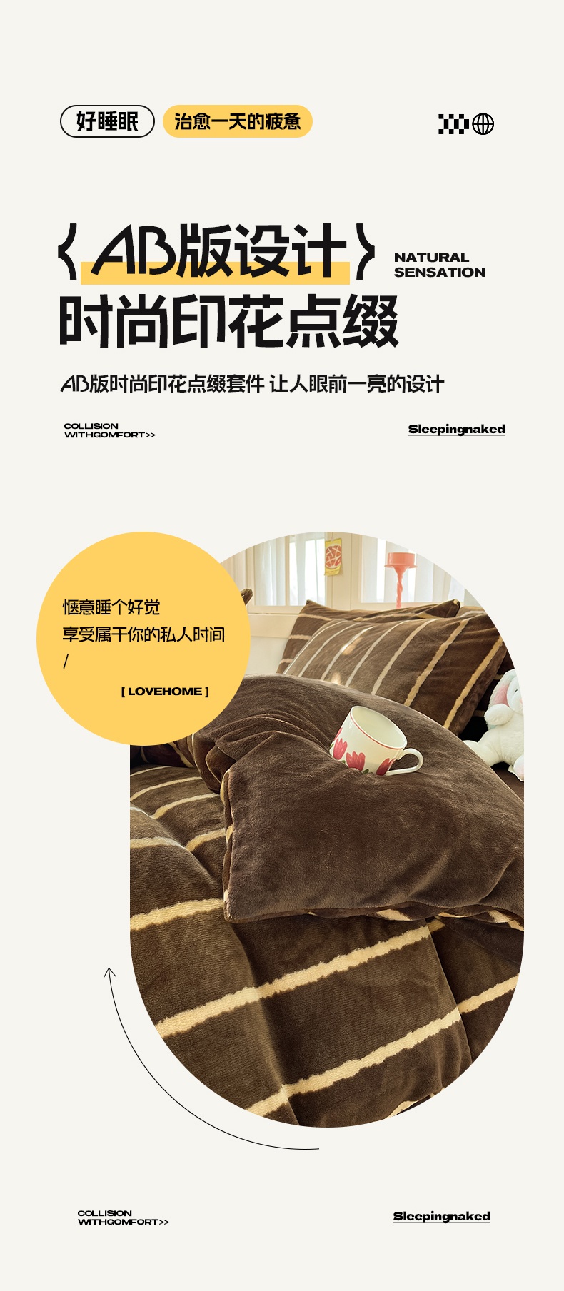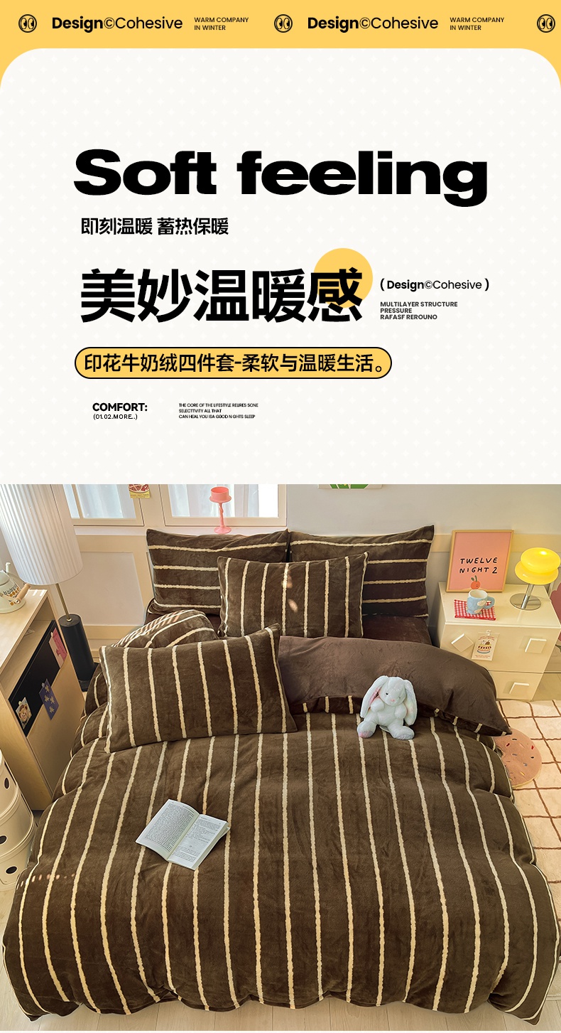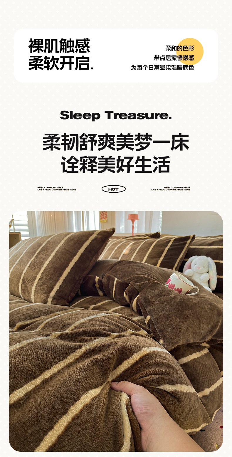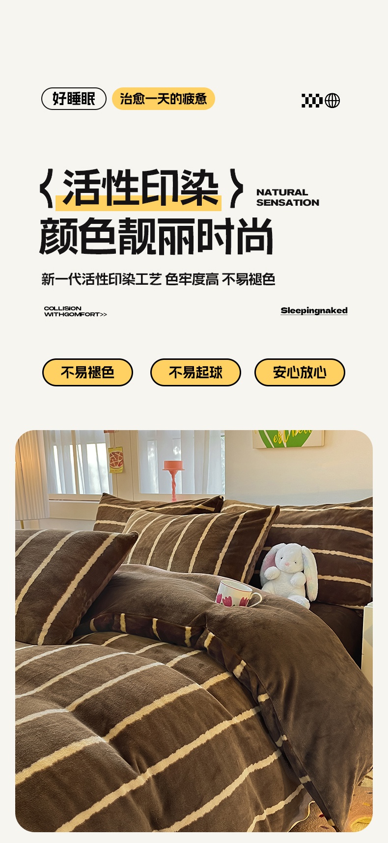 寐眠 2024新款高克重印花牛奶绒四件套条纹风格一 时代咖啡