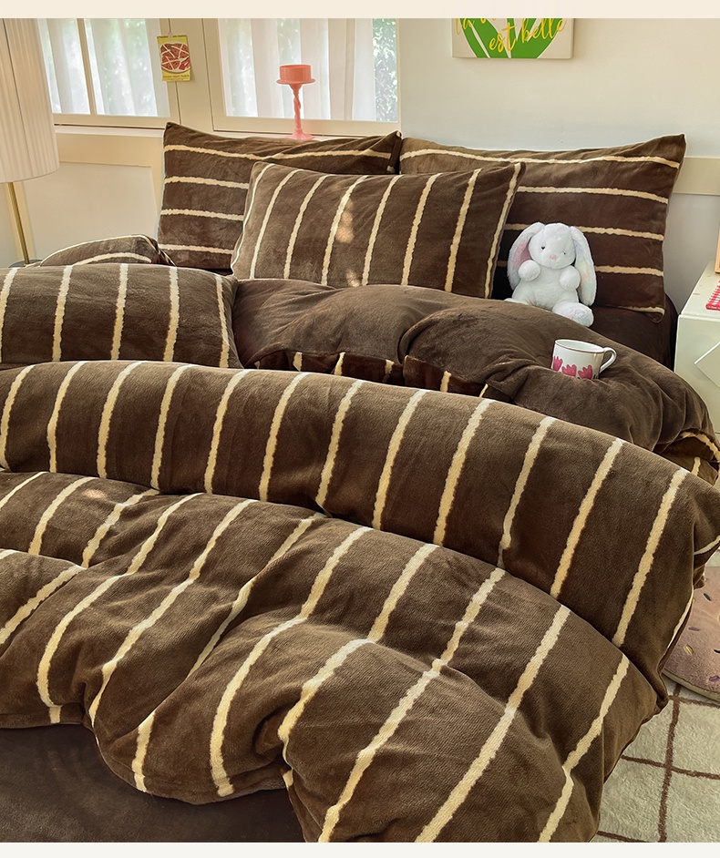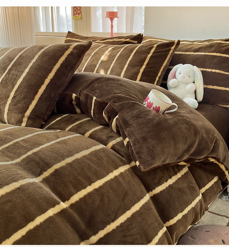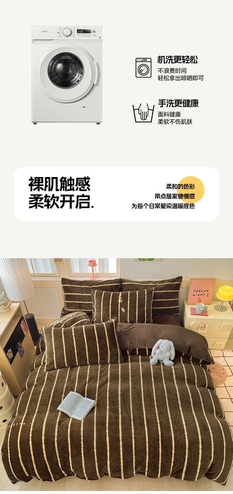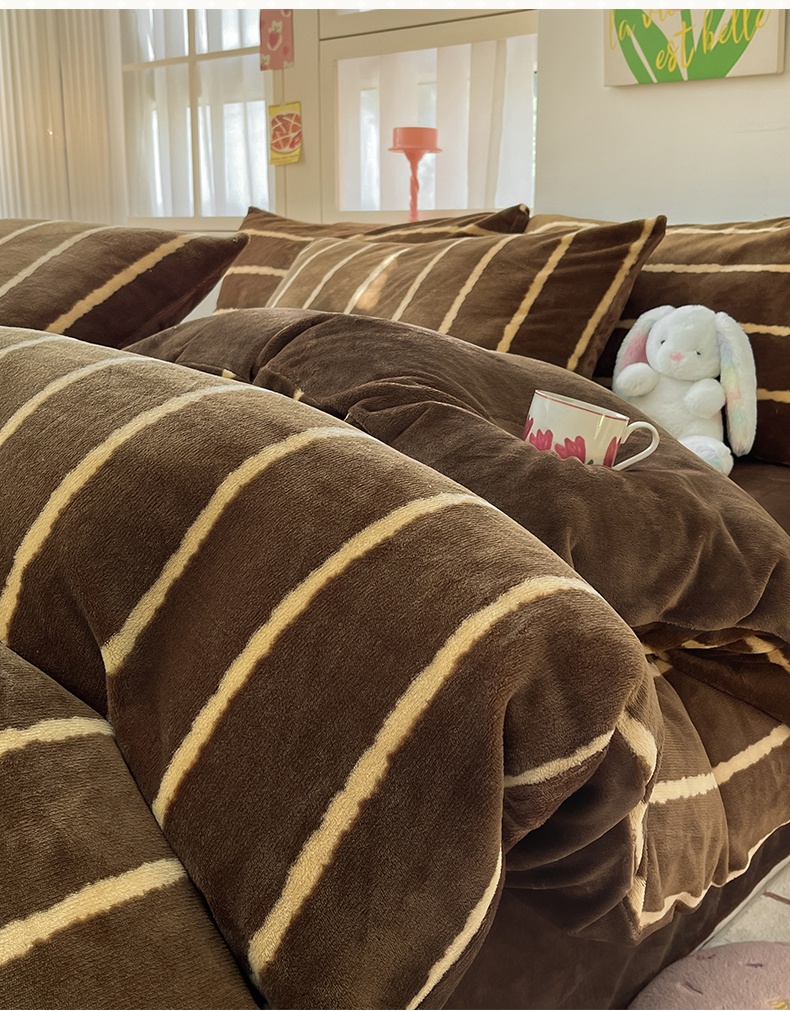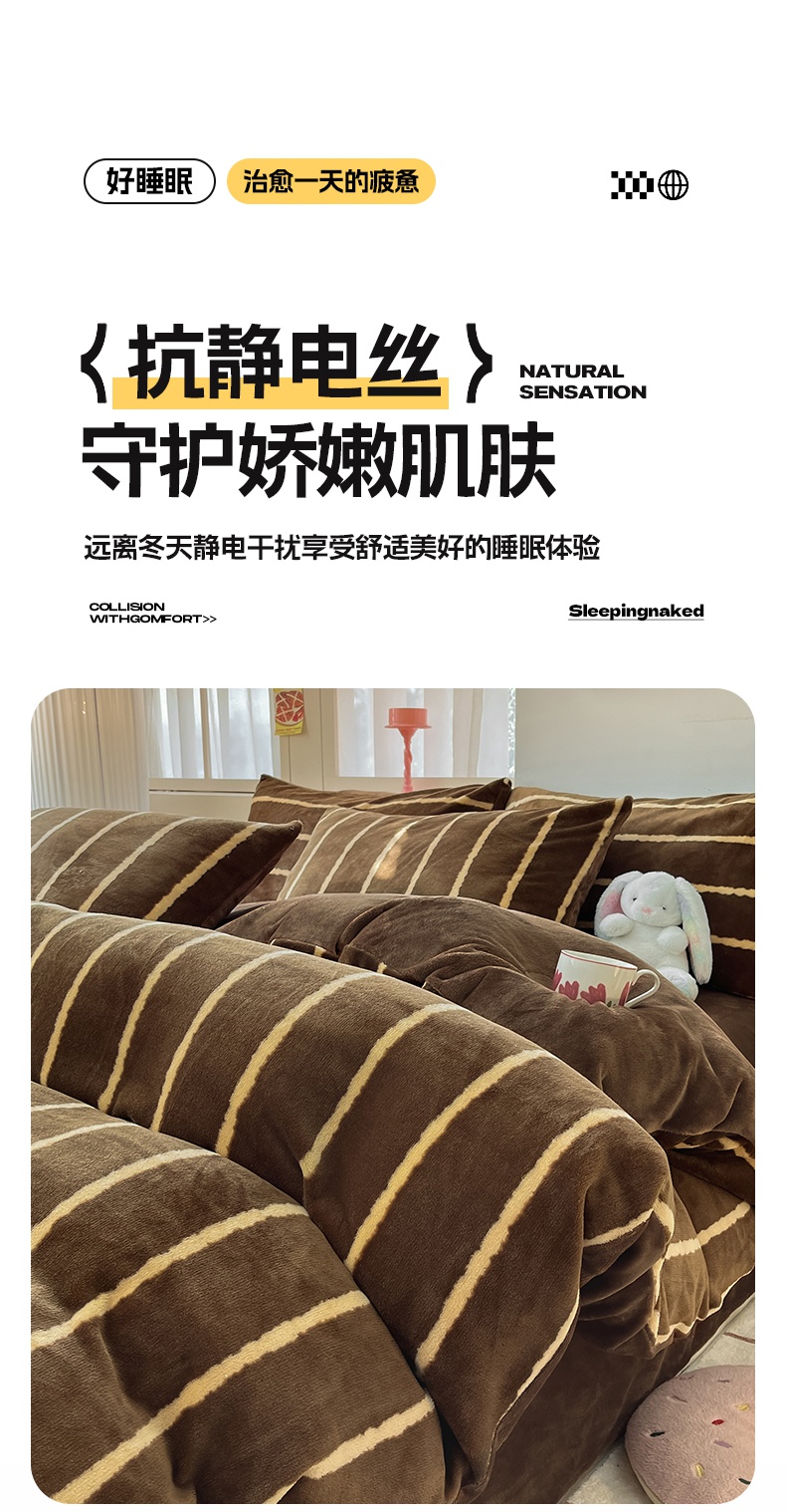 寐眠 2024新款高克重印花牛奶绒四件套条纹风格一 时代咖啡
