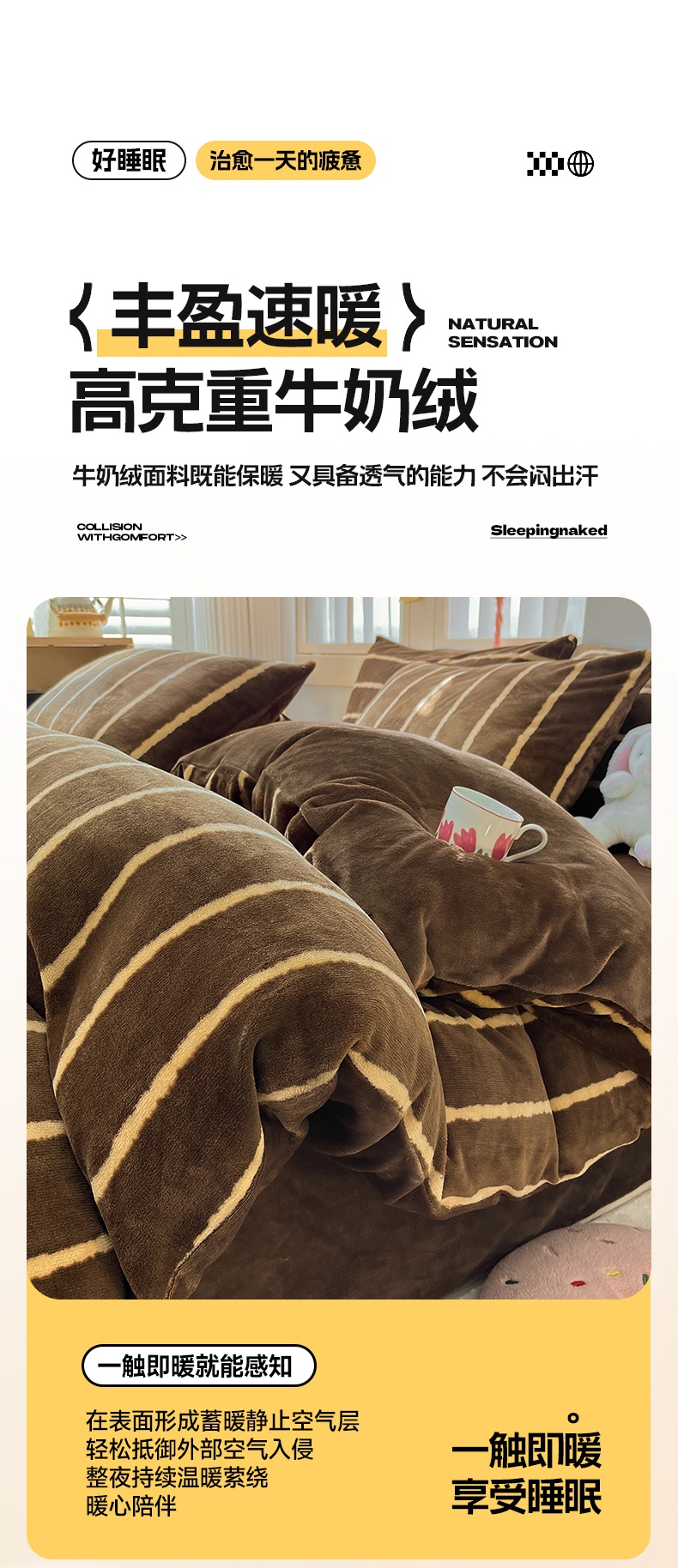 商品名称:寐眠 2024新款高克重印花牛奶绒四件套条纹风格一 时代咖啡