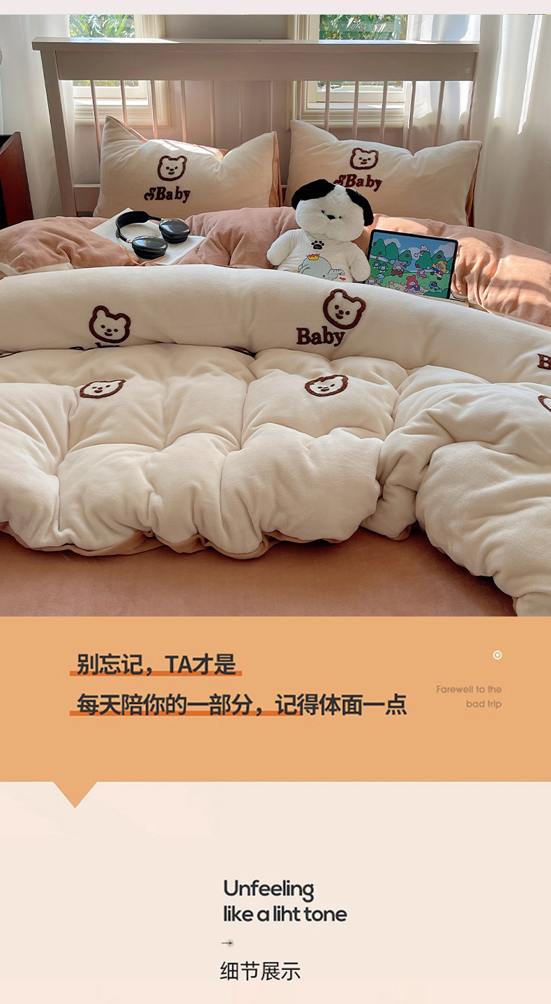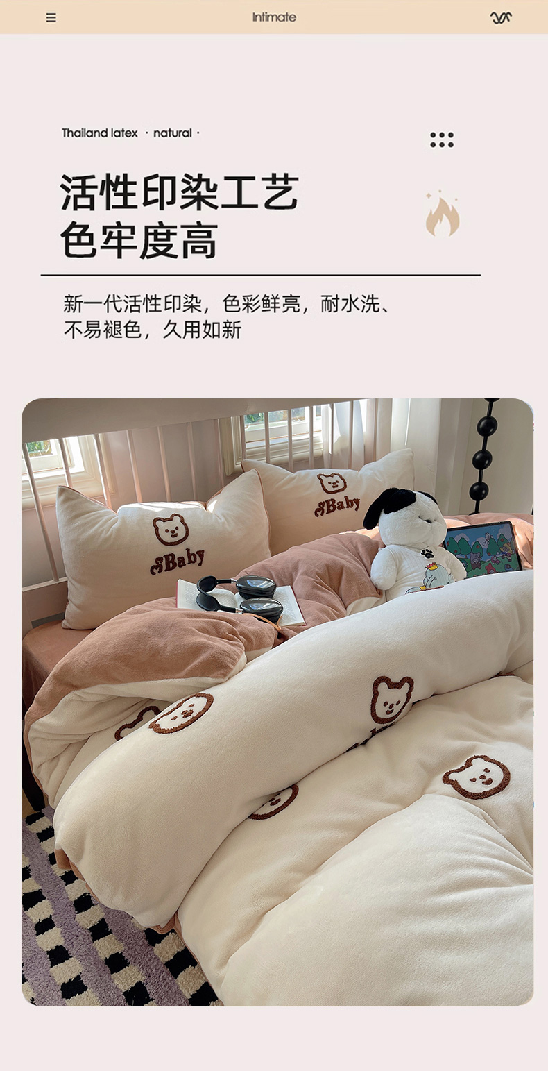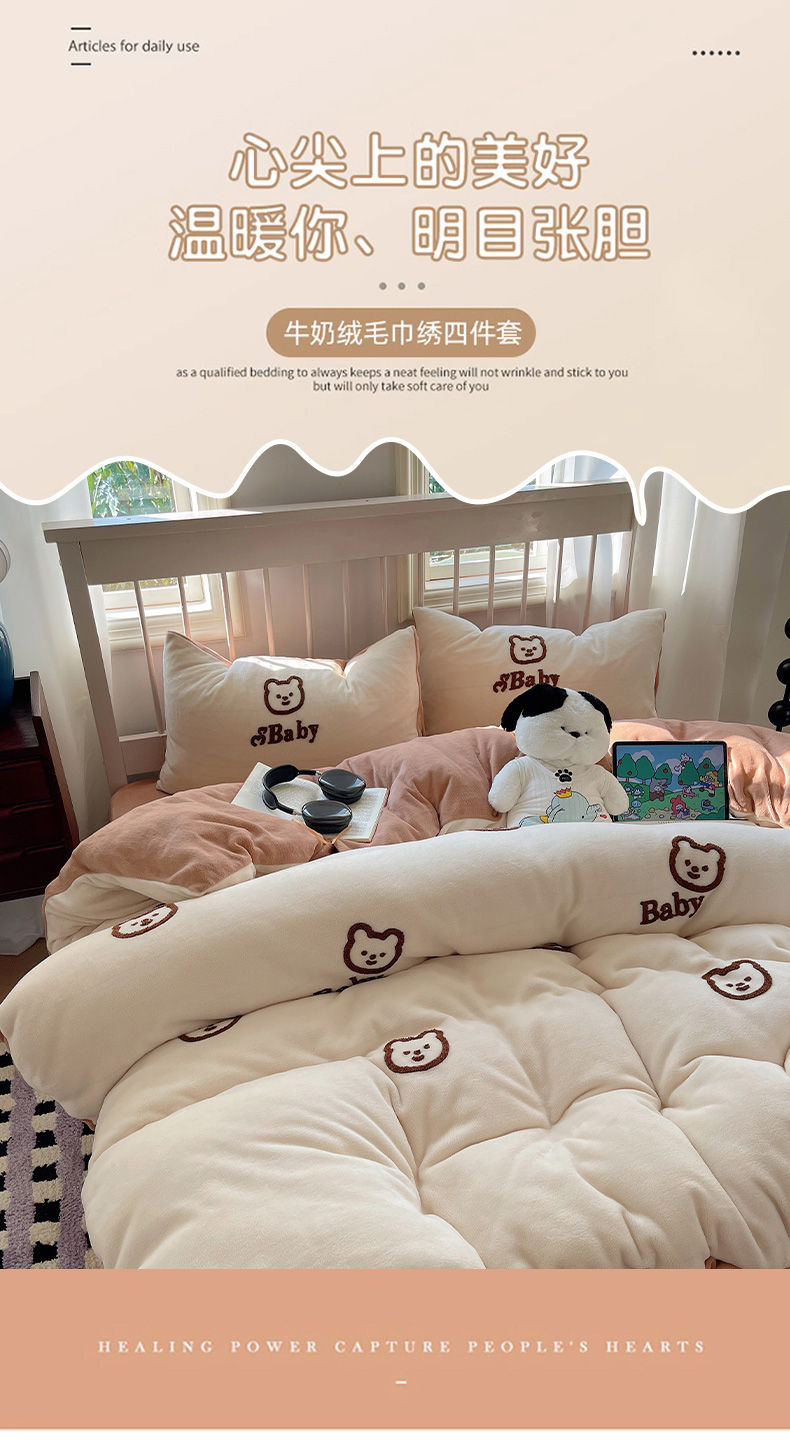 商品名称:红嘴企鹅 2025新款牛奶绒毛巾绣四件套 小熊白咖