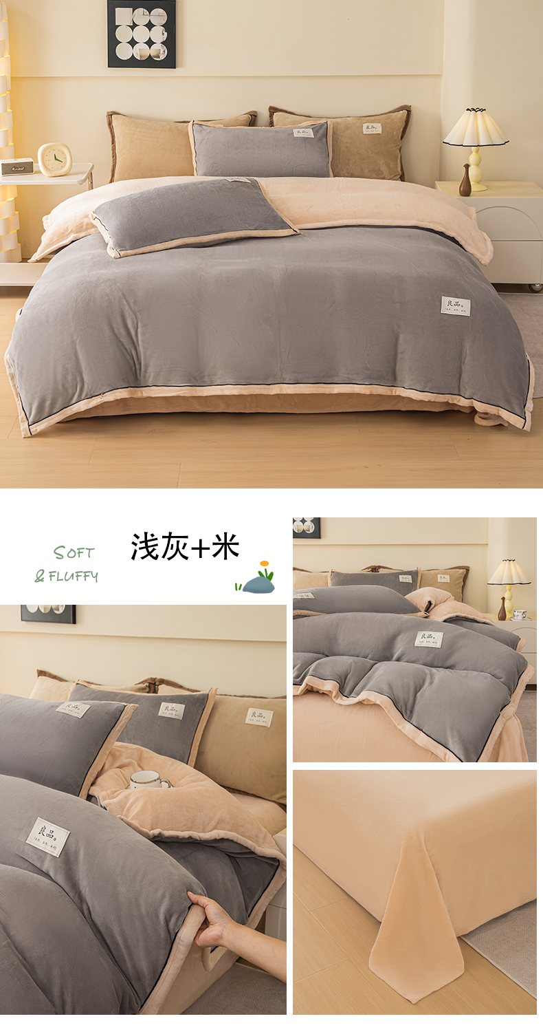 泳鹅羽绒 2024新款高克重双拼牛奶绒四件套 浅灰+米