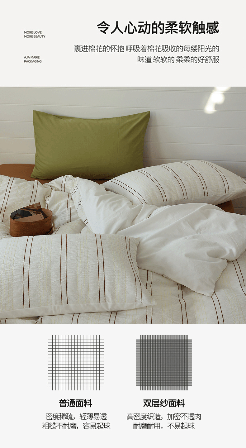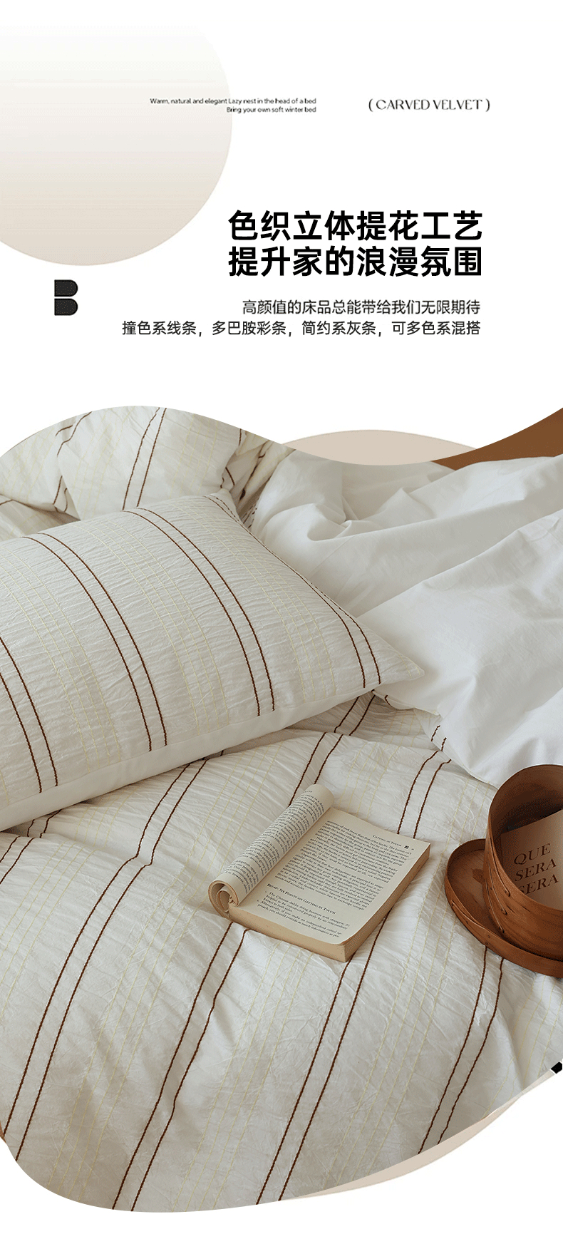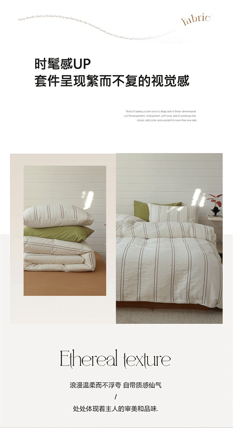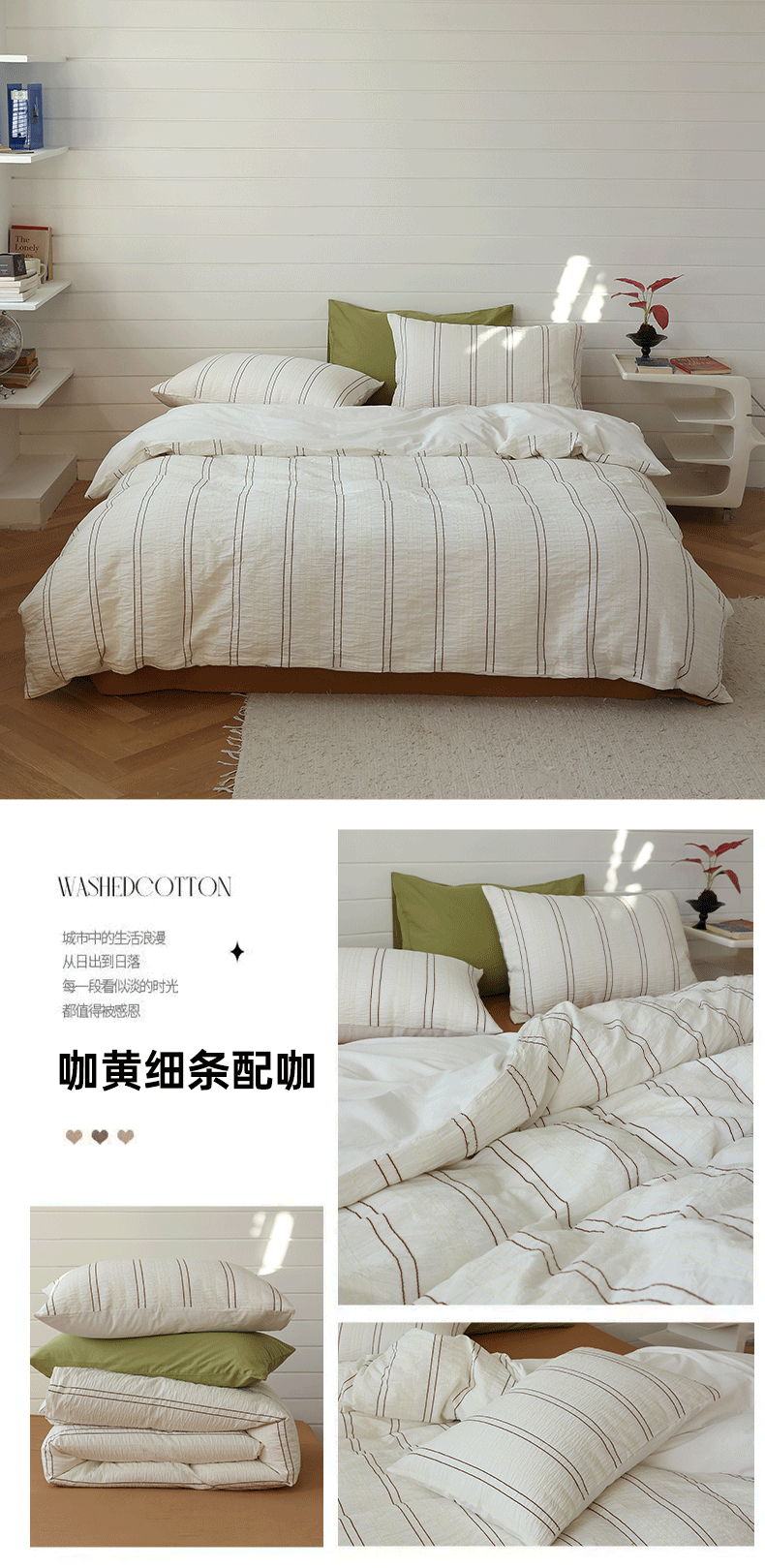 当前位置: 91家纺网 > 商品网购 > 床品套件 > 四件套 > 水洗棉四件套 > 棉眠 2024新款水洗皱皱纱色织提花线条混搭系列四件套 咖黄细条配咖