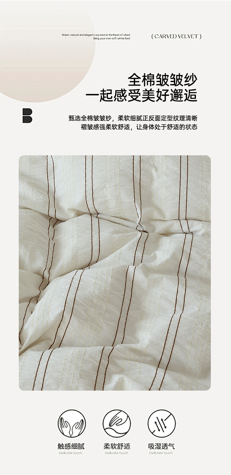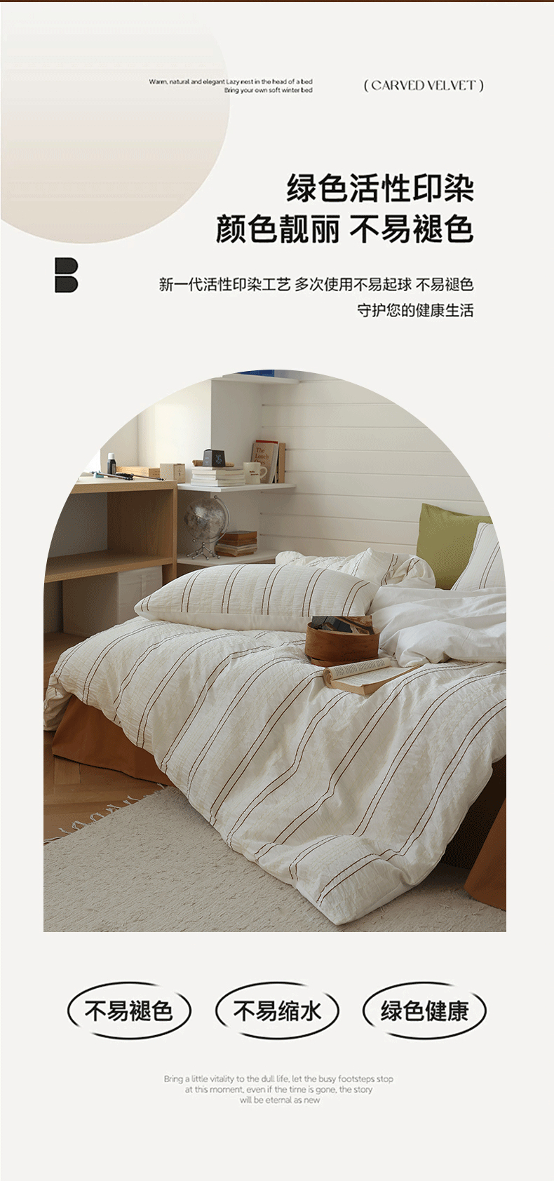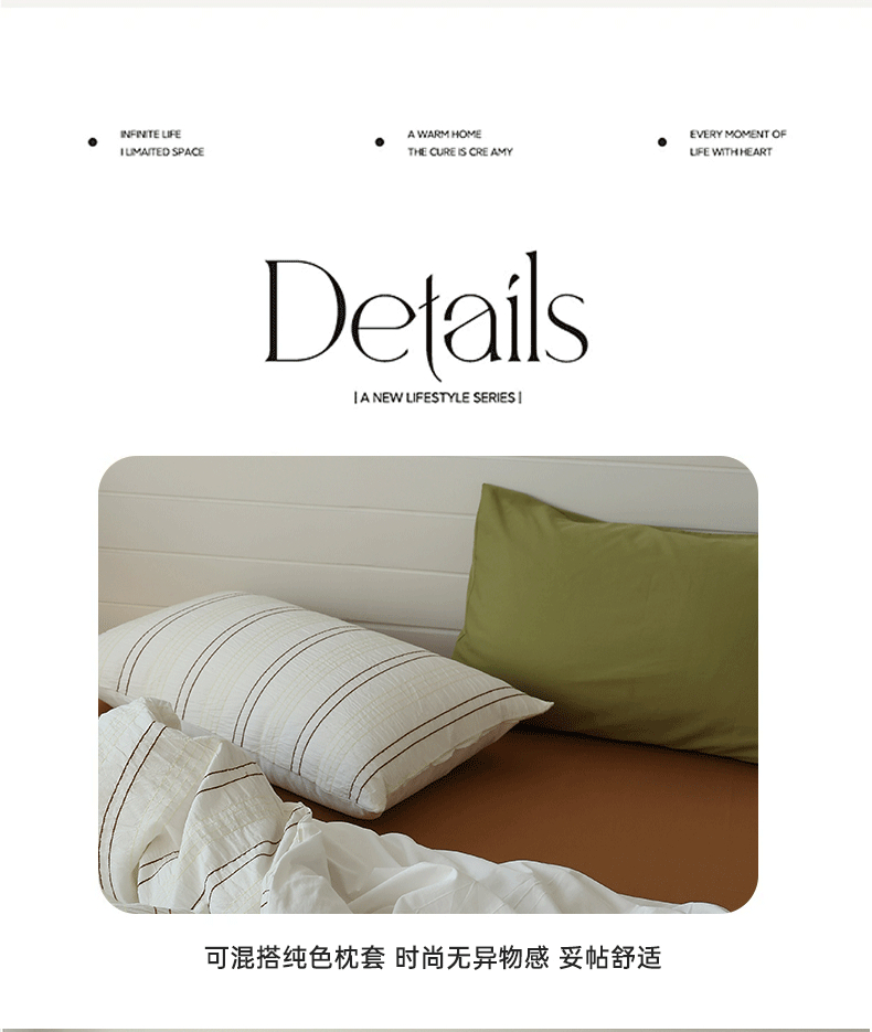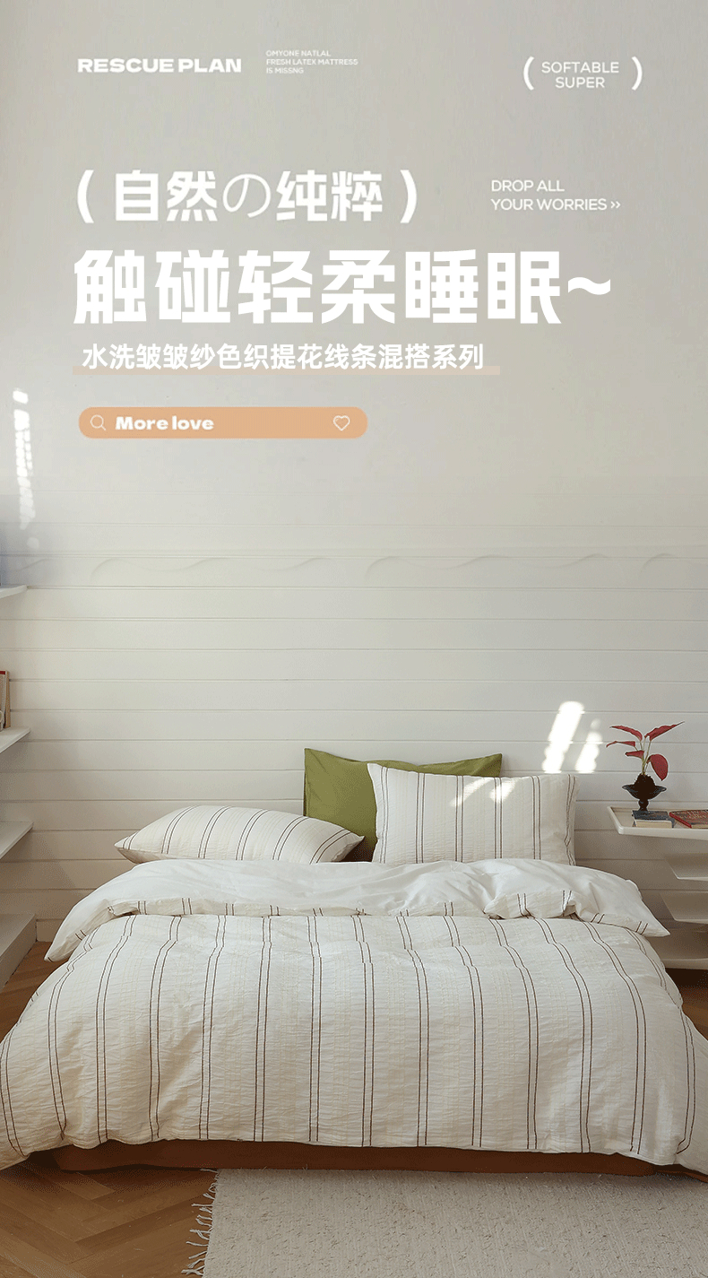 当前位置: 91家纺网 > 商品网购 > 床品套件 > 四件套 > 水洗棉四件套 > 棉眠 2024新款水洗皱皱纱色织提花线条混搭系列四件套 咖黄细条配咖