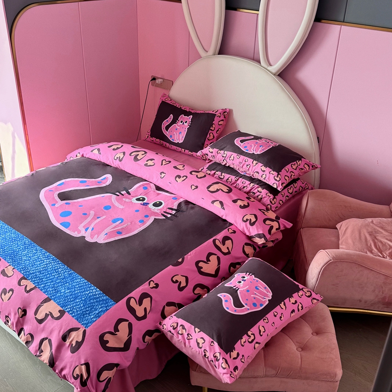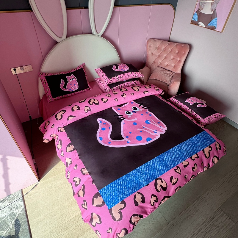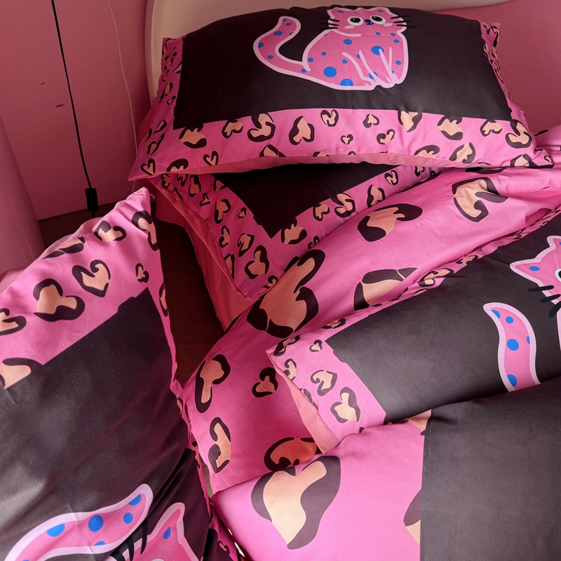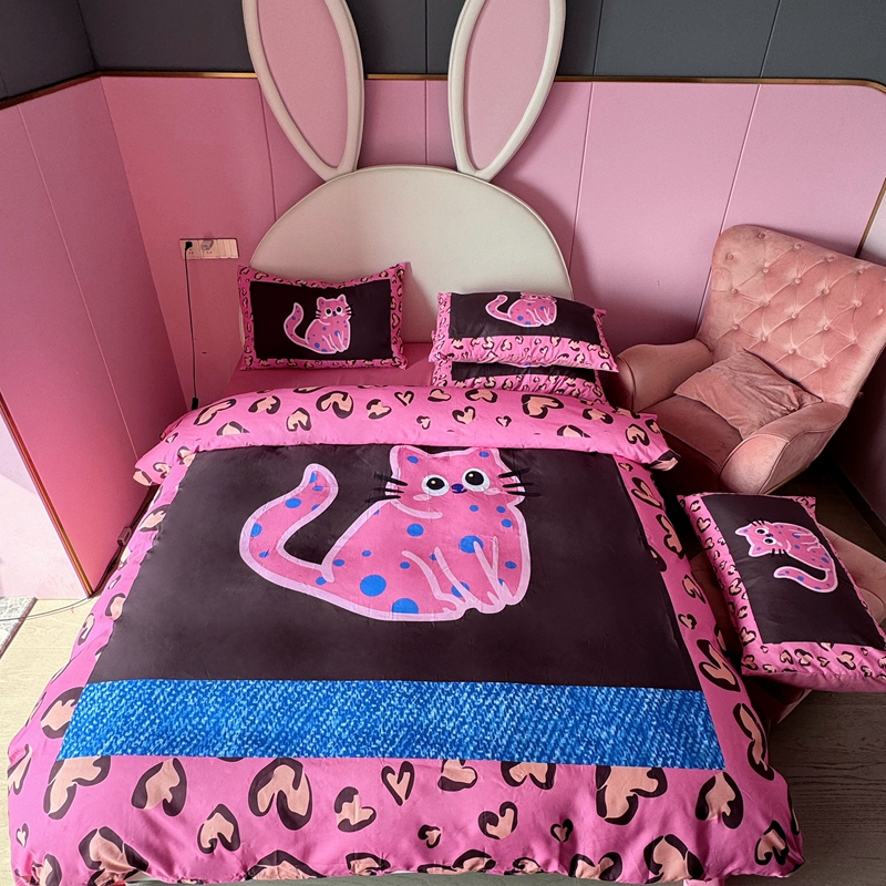 色鬼布艺 2024新款双面磨毛数码印花四件套 磨毛粉色小猫咪