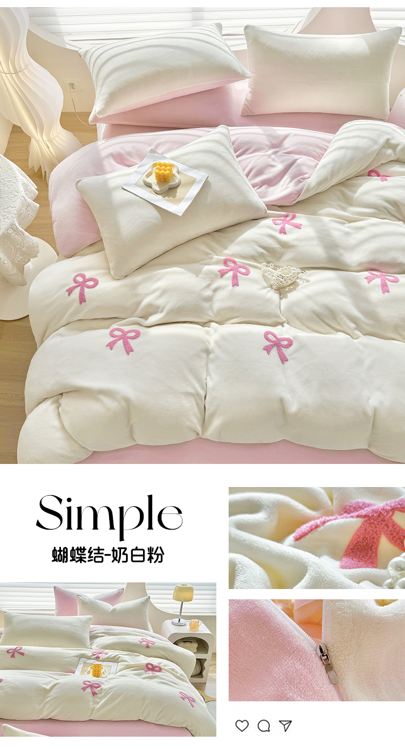 当前位置: 91家纺网 > 商品网购 > 床品套件 > 四件套 > 牛奶绒四件套 > 满羽家纺 2024爆款冬季加厚毛巾绣牛奶绒四件套蝴蝶结-奶白粉