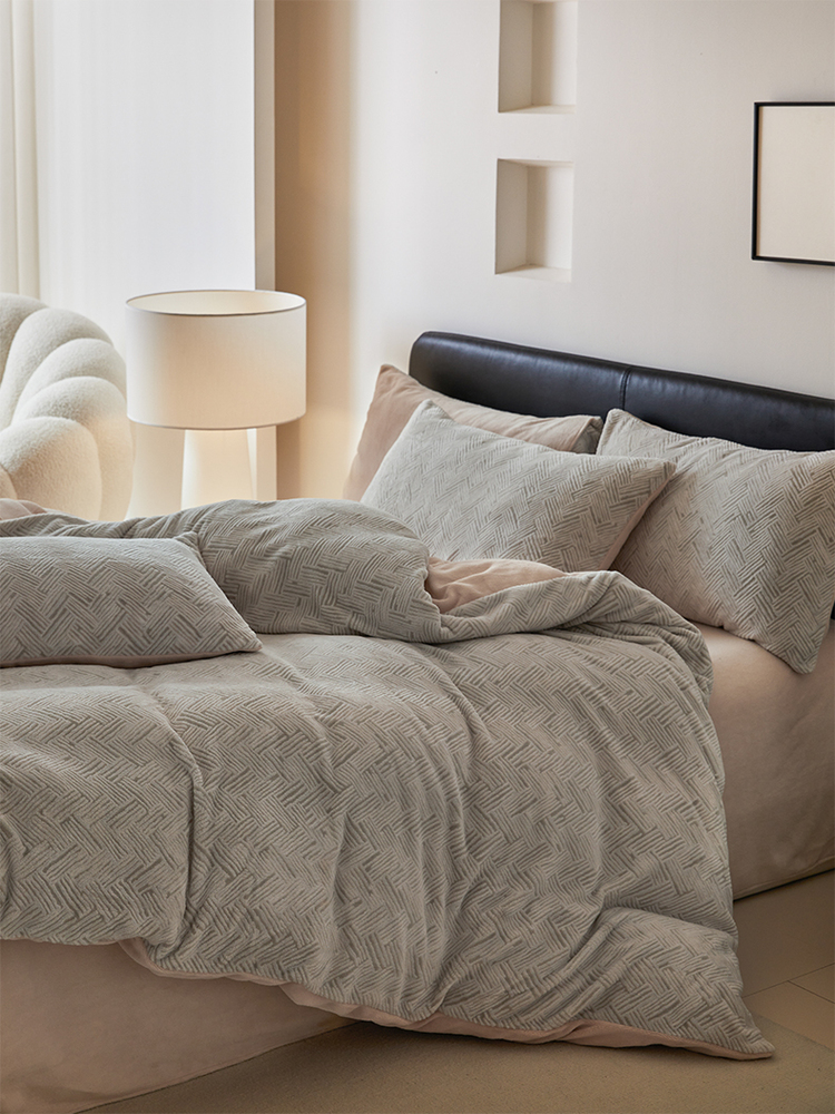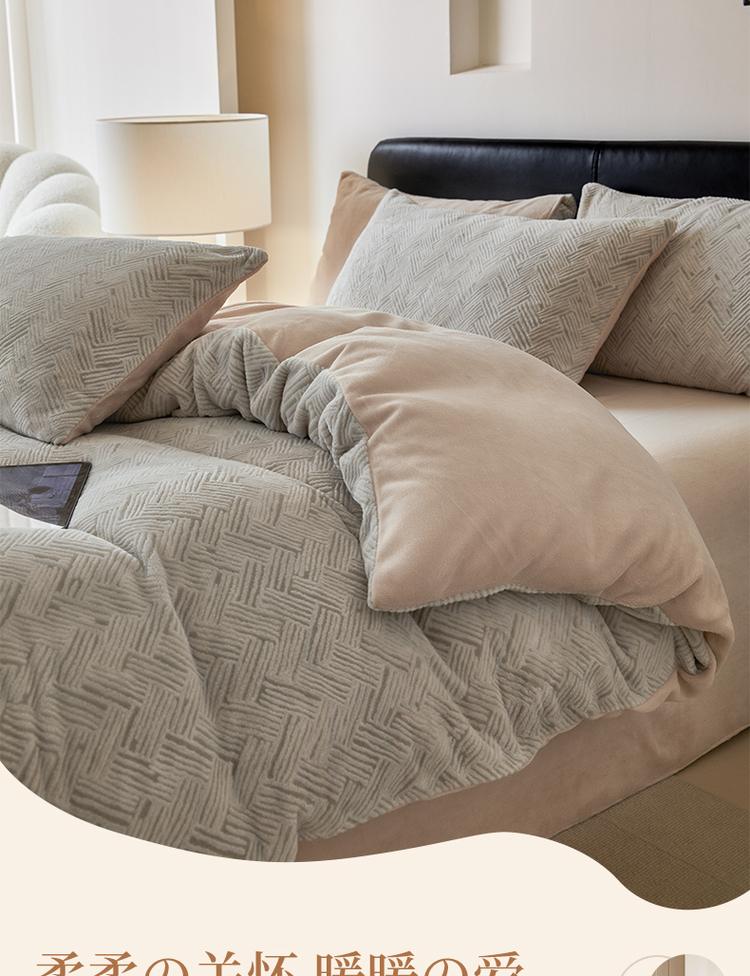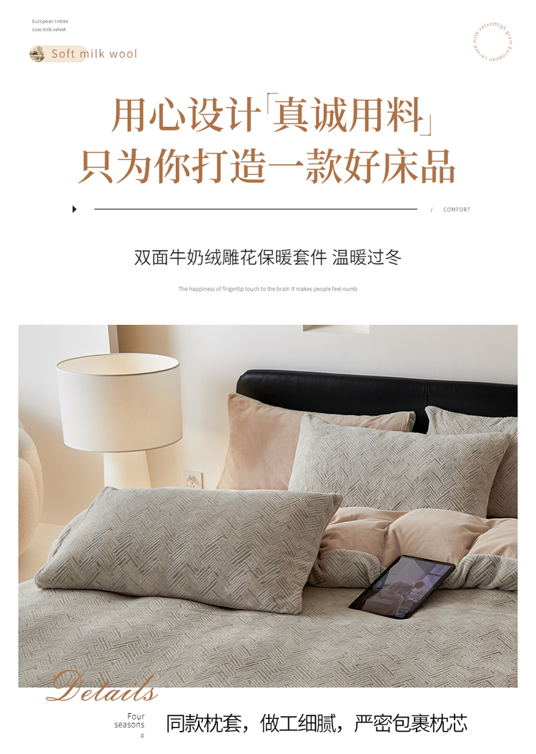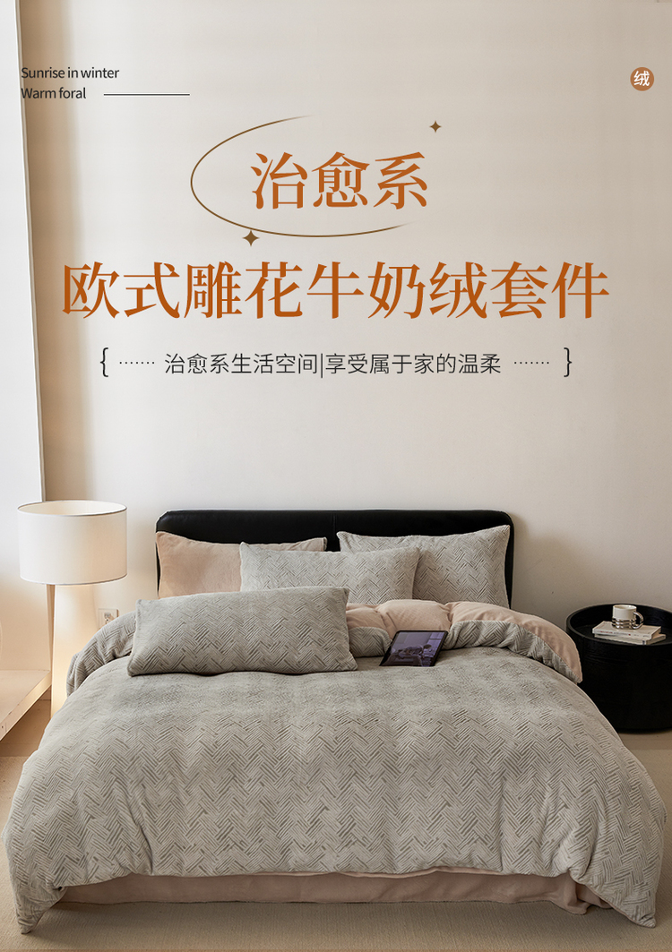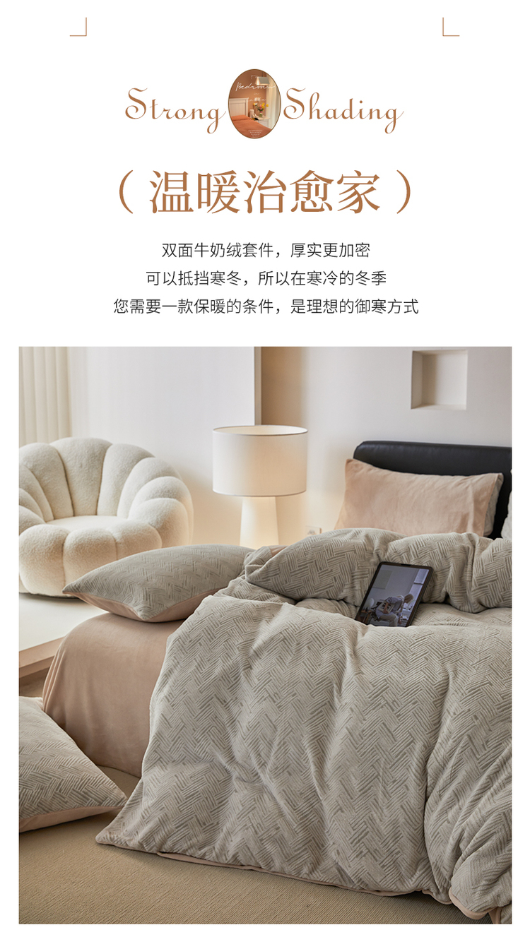 商品名称:(买家秀爆款不断货)A类母婴级牛奶雕花绒四件套珊瑚绒小香风牛奶绒四件套雪花绒四件套雕花牛奶绒四件套白 小几何-茶色