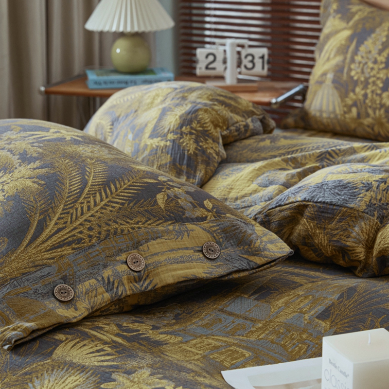 商品名称:鲁爱 2025新款全棉色织双层纱纽扣款四件套 玉树琼林-黑金