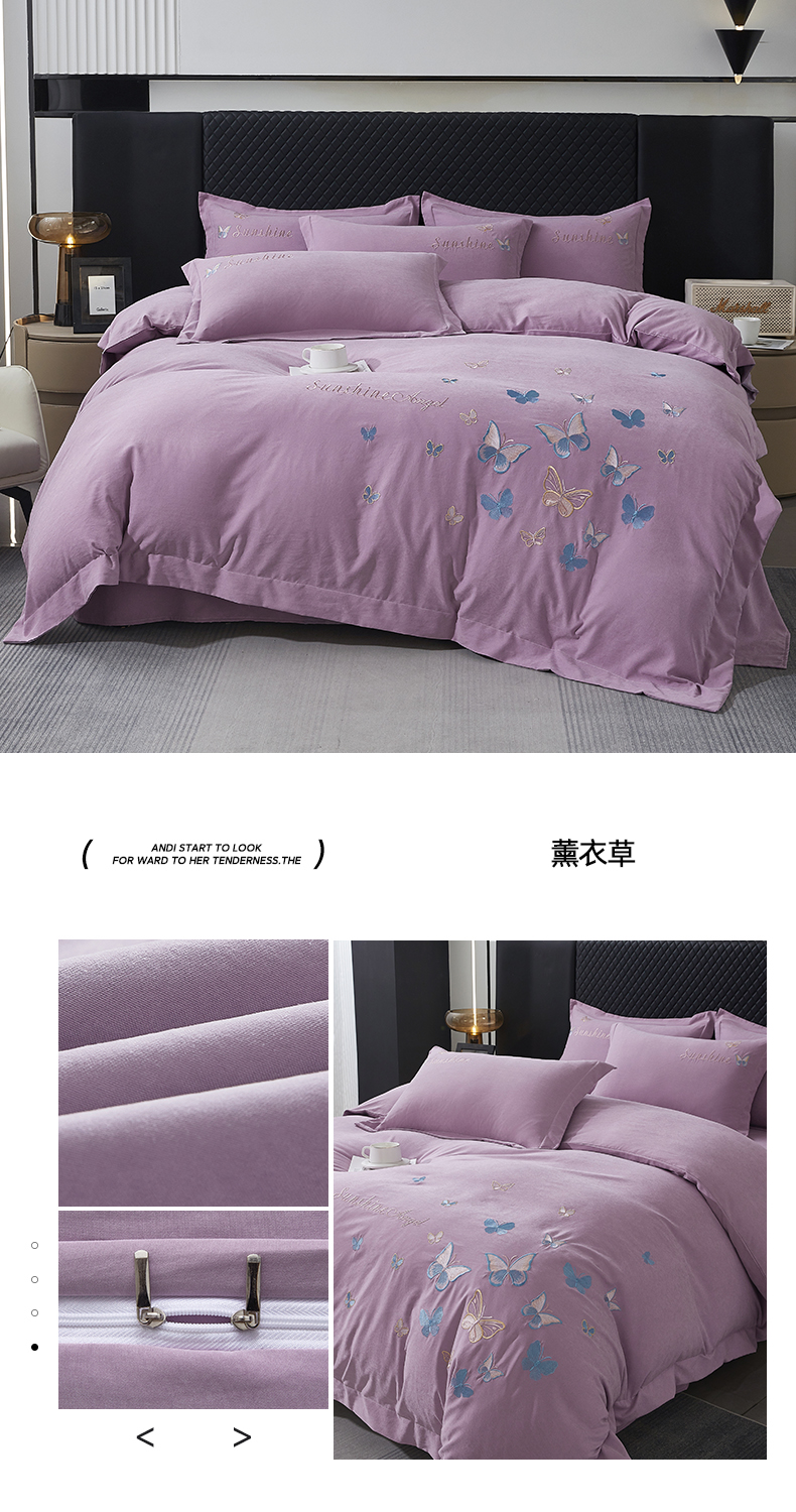 商品名称:莱越家纺 2025新款轻奢刺绣蝴蝶牛奶蛋白棉四件套高档纯色亲肤棉双拼床单被套床笠式 蝴蝶-薰衣草
