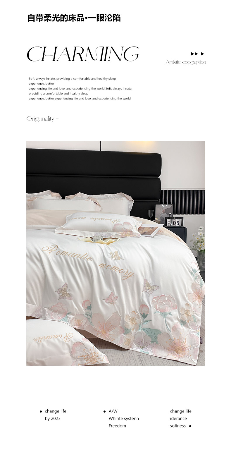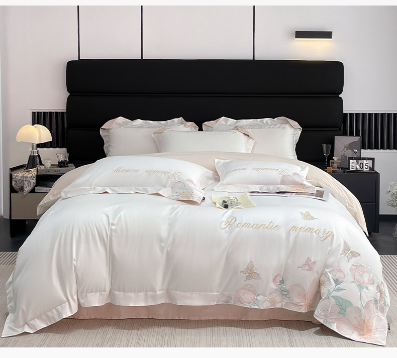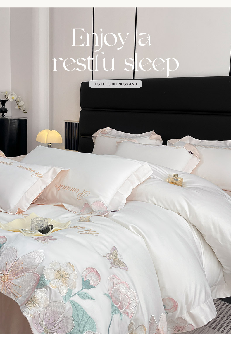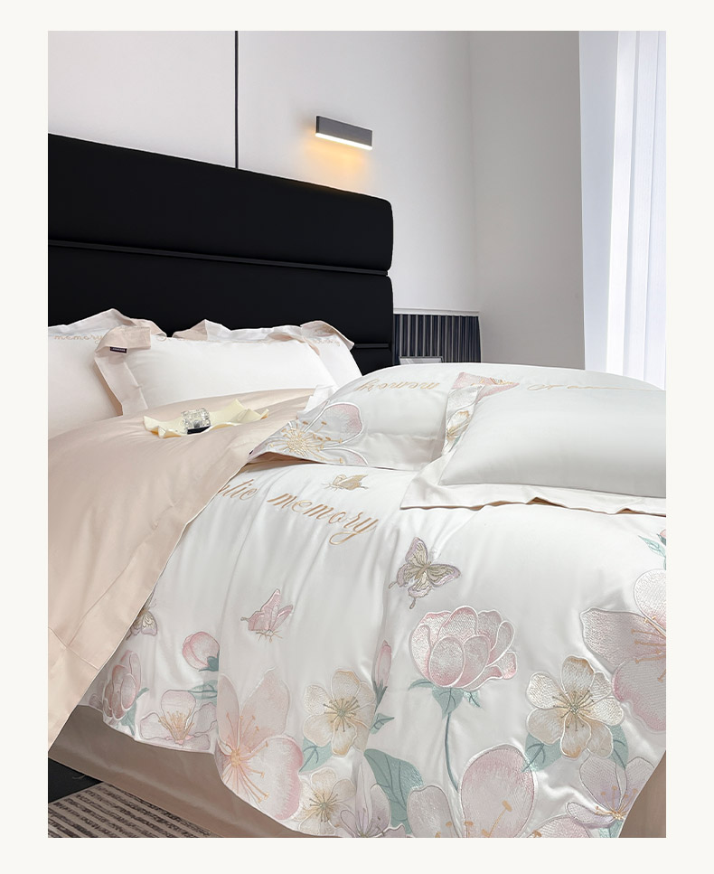商品名称:2025春夏A类100支长绒棉四件套纯棉全棉轻奢风床单被套重工刺绣床上用品-花漫屿 花漫屿-白粉