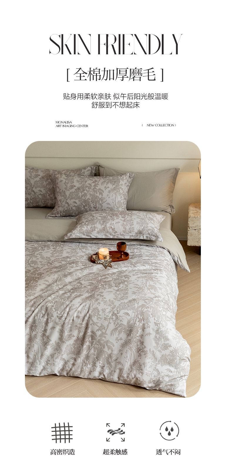 (买家秀爆款花色不断货)A类母婴级纯棉磨毛四件套简约纯棉全棉磨毛四件套纯棉四件套全棉四件套磨毛三件套 竹生空野-灰