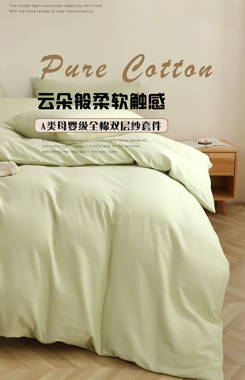 当前位置: 91家纺网 > 商品网购 > 床品套件 > 四件套 > 双层纱四件套 > 晶缦家纺 2025新款纯棉纯色全棉双层纱四件套 觅琳-浅春绿