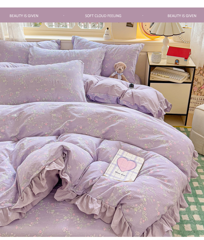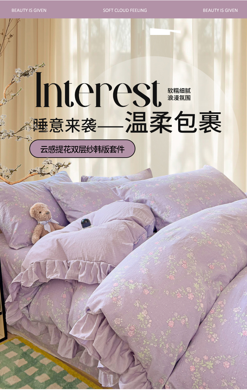 当前位置: 91家纺网 > 商品网购 > 床品套件 > 四件套 > 化纤普通四件套 > 纽缦家纺 2025新款云感提花双层纱韩版四件套 恋如青柠香