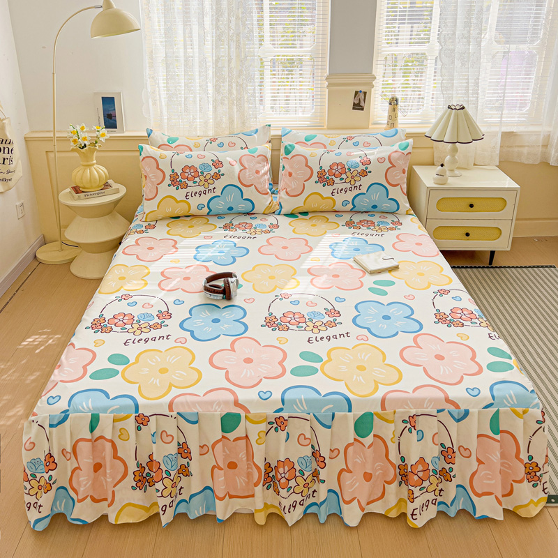 极梦家纺(支持定制) 2025新款春秋130克加厚植物羊绒磨毛印花单床裙三件套 甜蜜桔朵