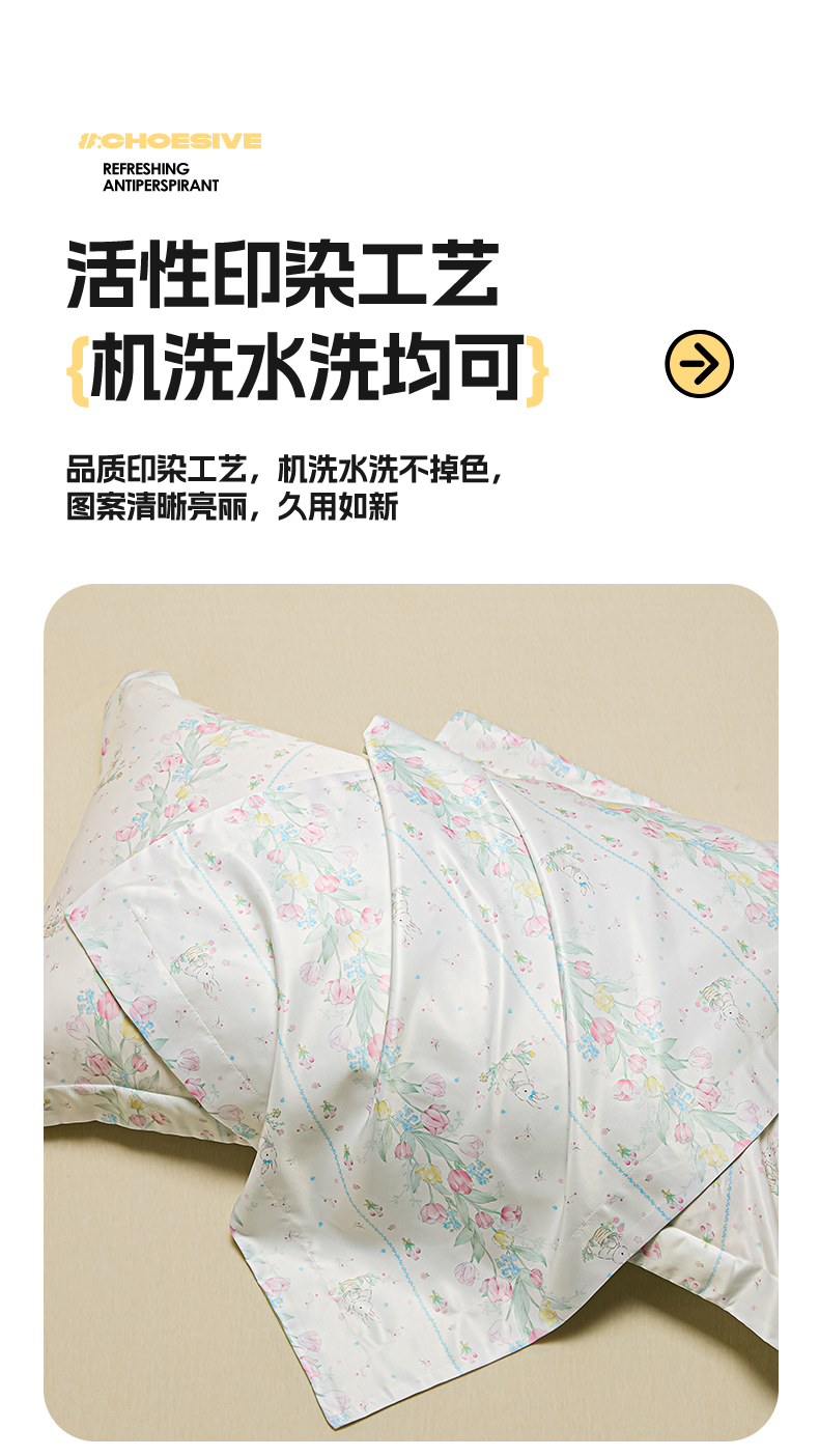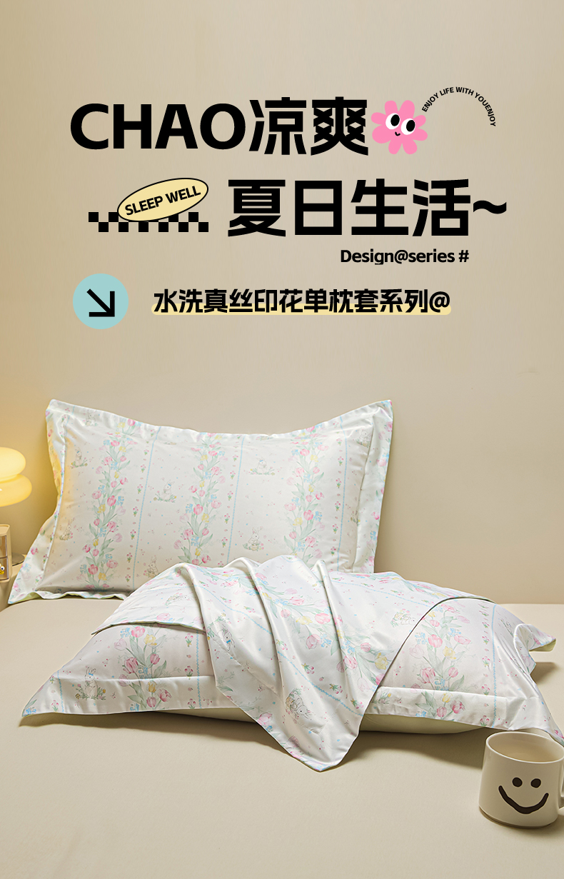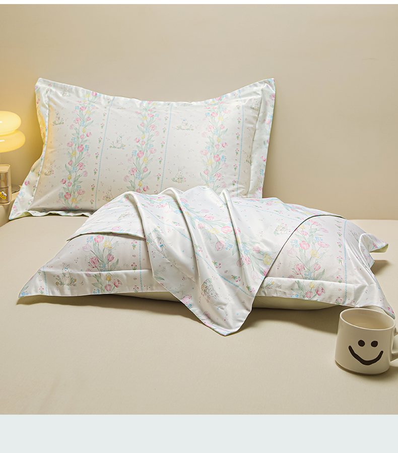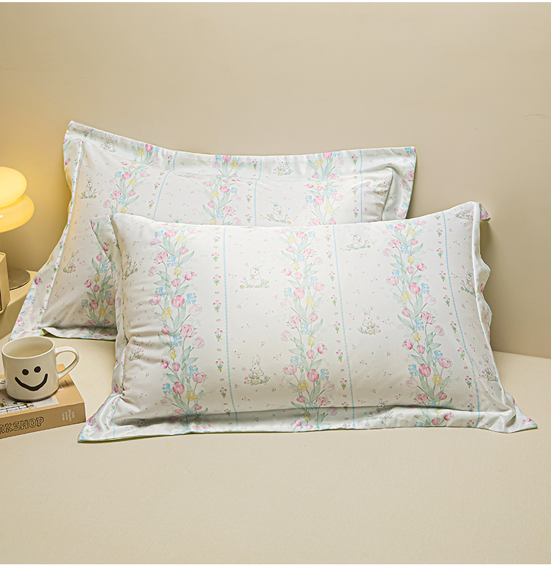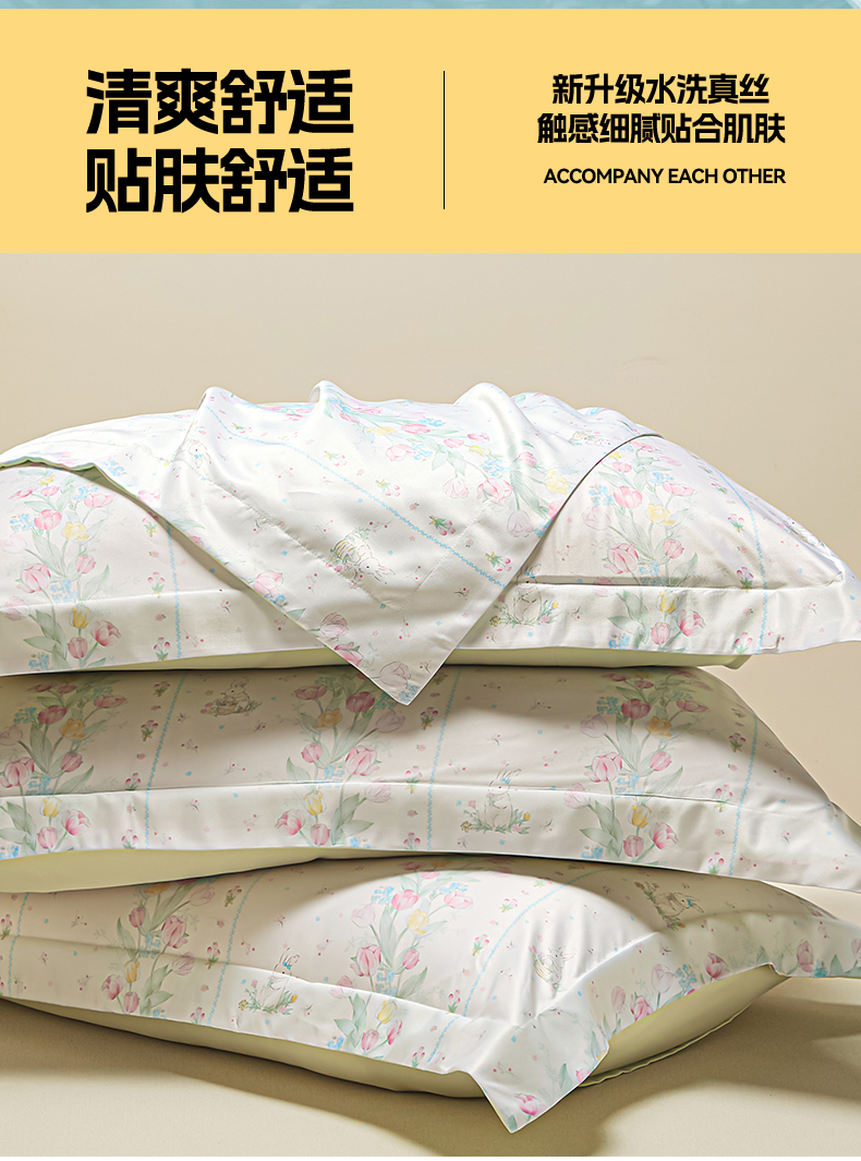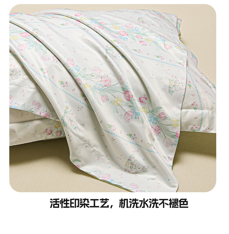 笙意家纺 2025新款水洗真丝数码印花卡通枕套 花丛小兔