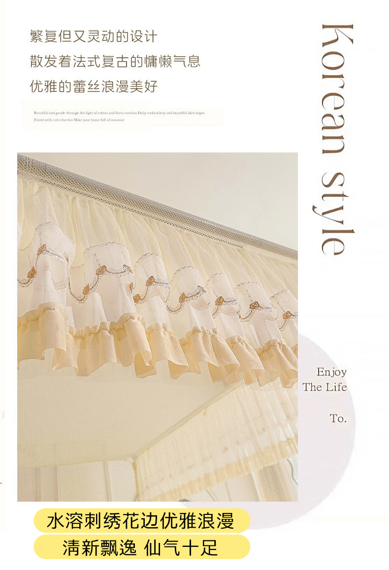 (总)2025新款双层花边全包围床笠款三开门蚊帐-幽梦星辰,奶黄,藕玉,颜淡蓝