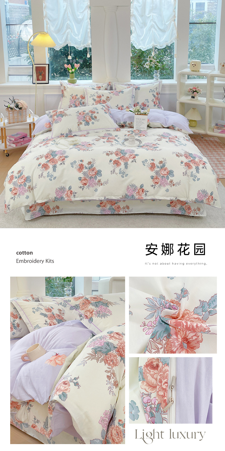 商品名称:铭博家纺 新款直播爆款网红全棉四件套13070印花吊边一字绣纯棉被套工艺款 安娜花园