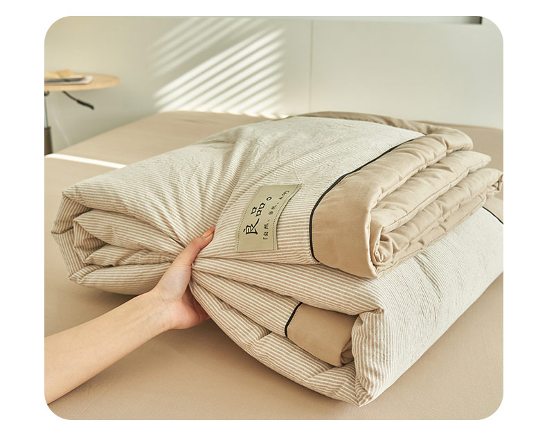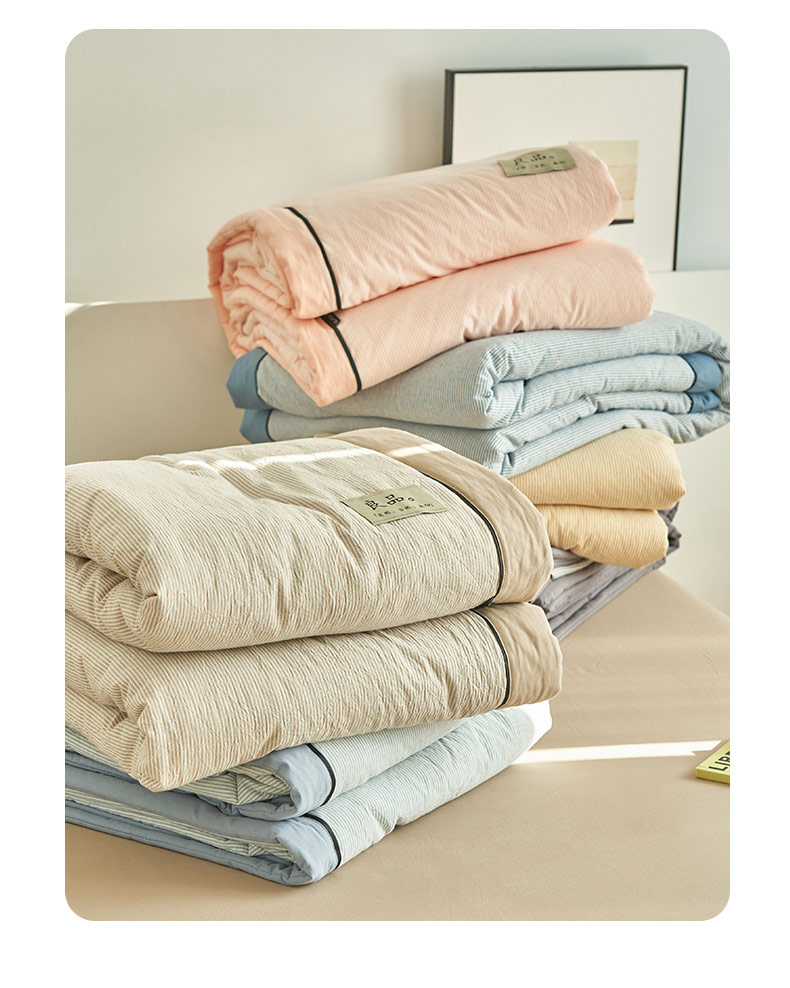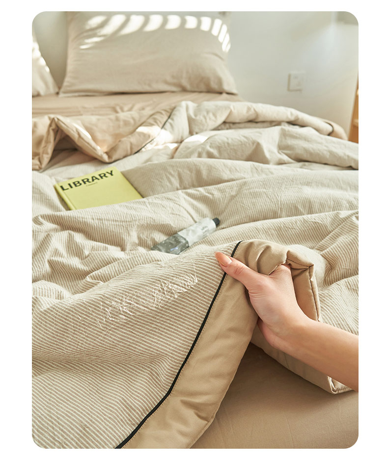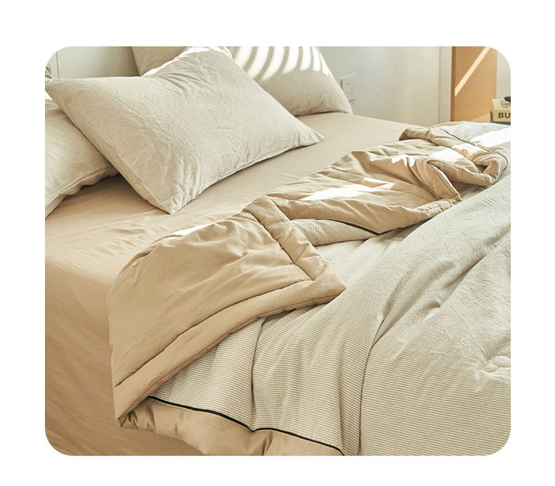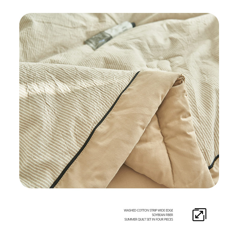 • 91家纺网 家纺一手货源 找家纺 寐绸家纺 2025新款纯棉水洗棉细条宽边大豆纤维夏被四件套 密条-浅驼