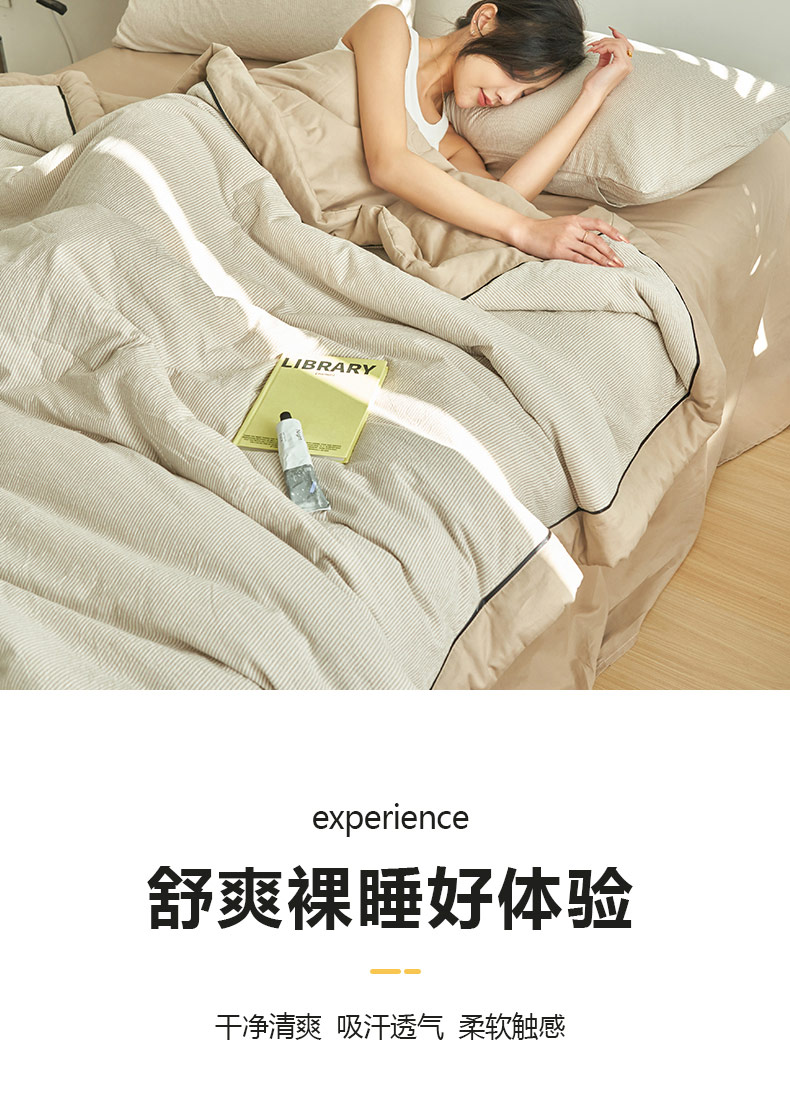 寐绸家纺 2025新款纯棉水洗棉细条宽边大豆纤维夏被四件套 密条-浅驼