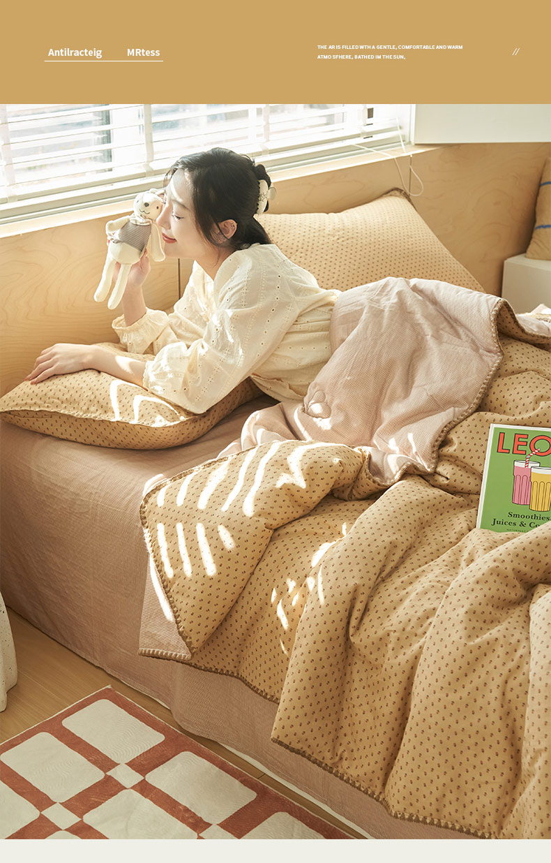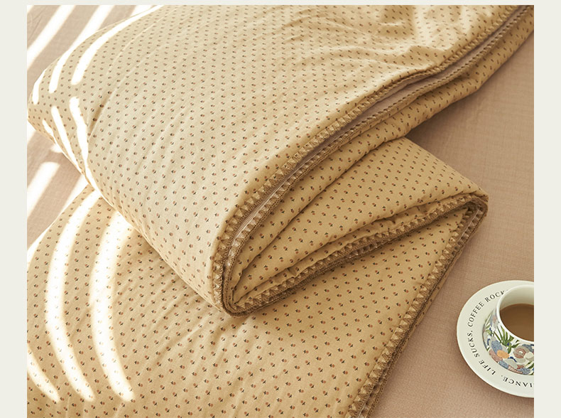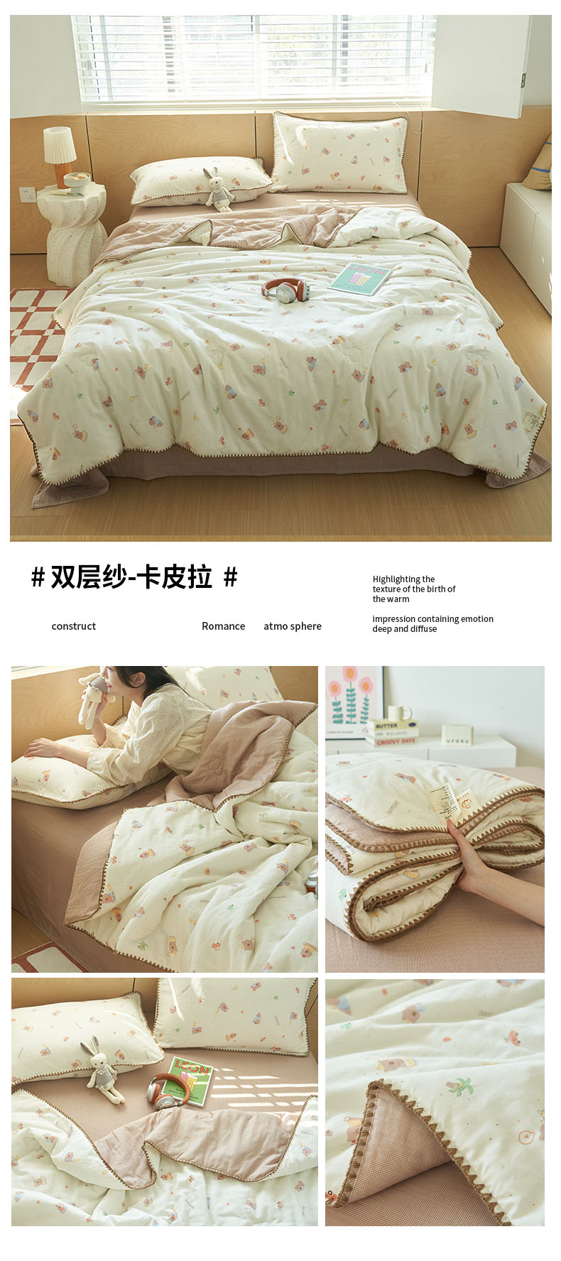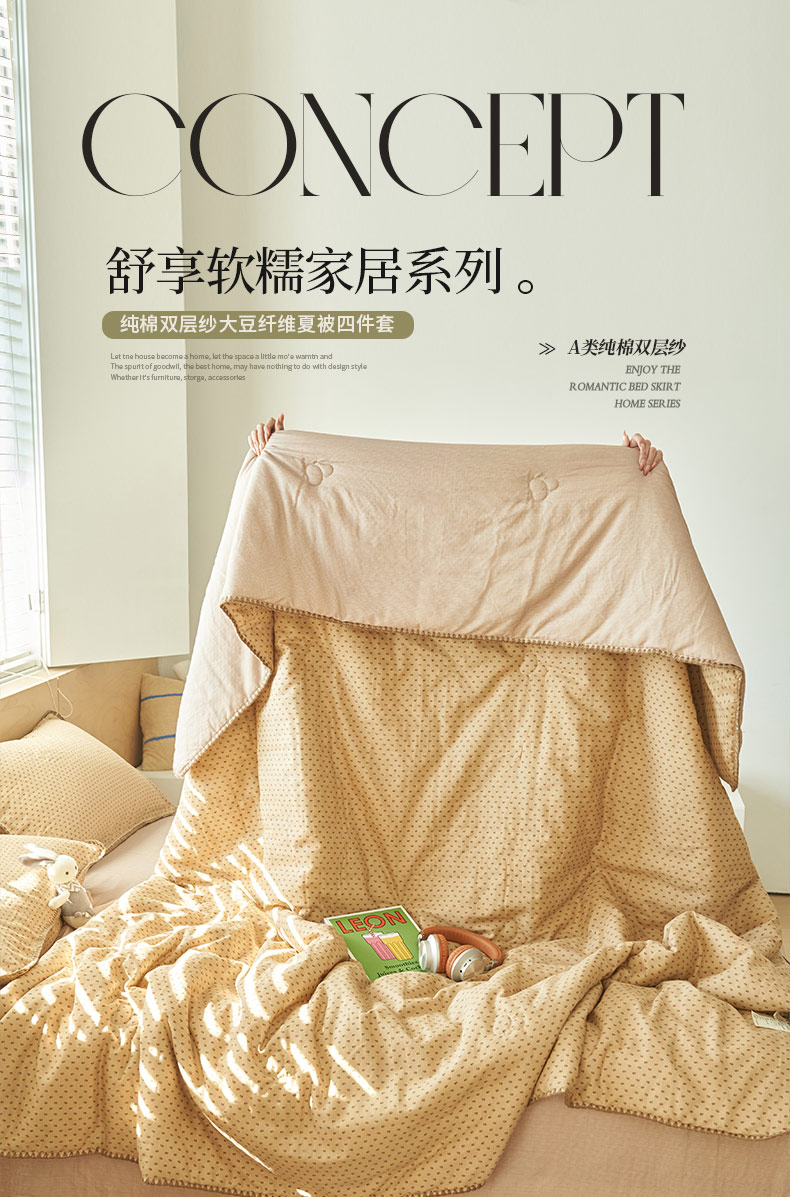 • 91家纺网 家纺一手货源 找家纺 寐绸家纺 2025新款纯棉双层纱印花大豆纤维夏被四件套 双层纱-小红花