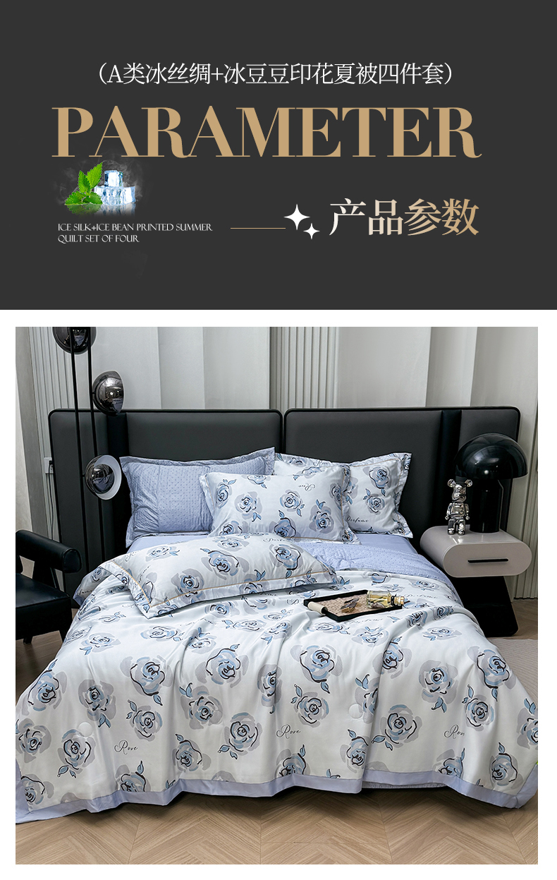 (总)满羽家纺 2025热款冰丝绸冰豆豆被夏被四件套凉感空调被(踩棉工艺)(吊边床单)-印花