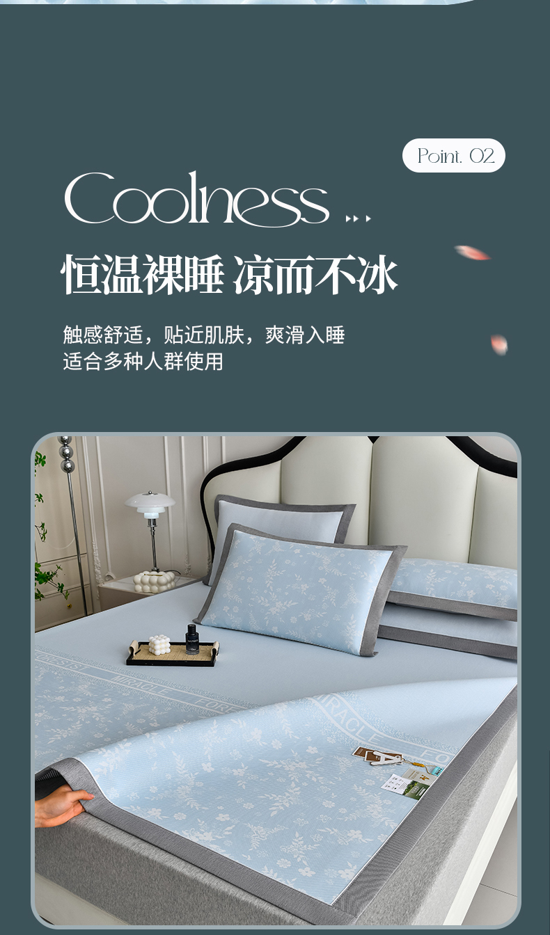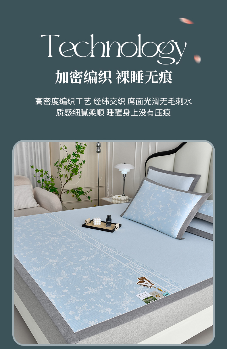 商品名称:小牛席业 2025新款半定位小提花凉感冰丝席系列凉席藤席冰藤双面席冰丝席竹席凉席空调席草席三件套 蓝色