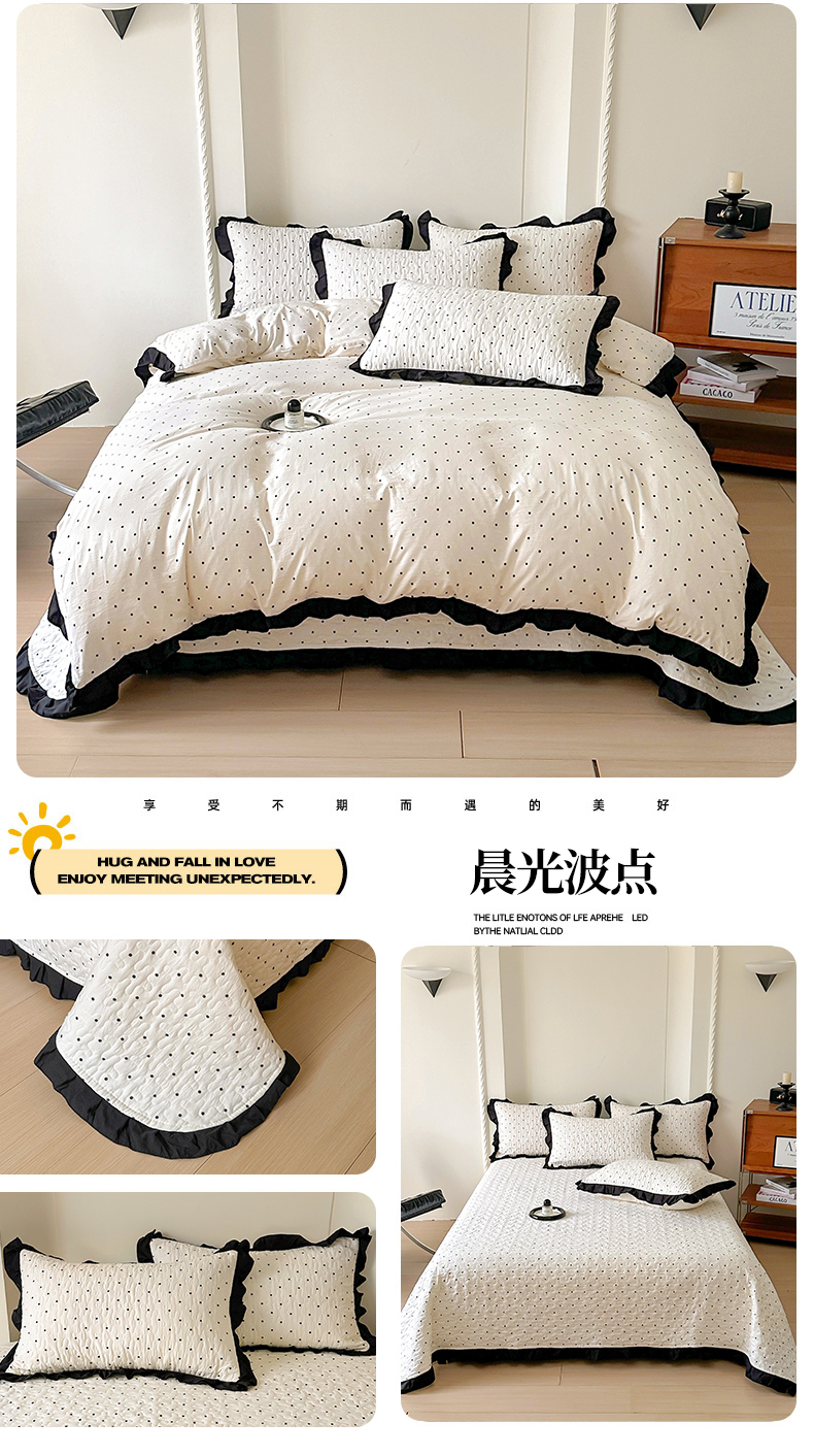 当前位置: 91家纺网 > 商品网购 > 床品套件 > 四件套 > 水洗棉四件套 > 满座家居 2025新款直播热款赫本风花边软糯水洗棉法式印花床盖床裙三件套四件套 晨光波点
