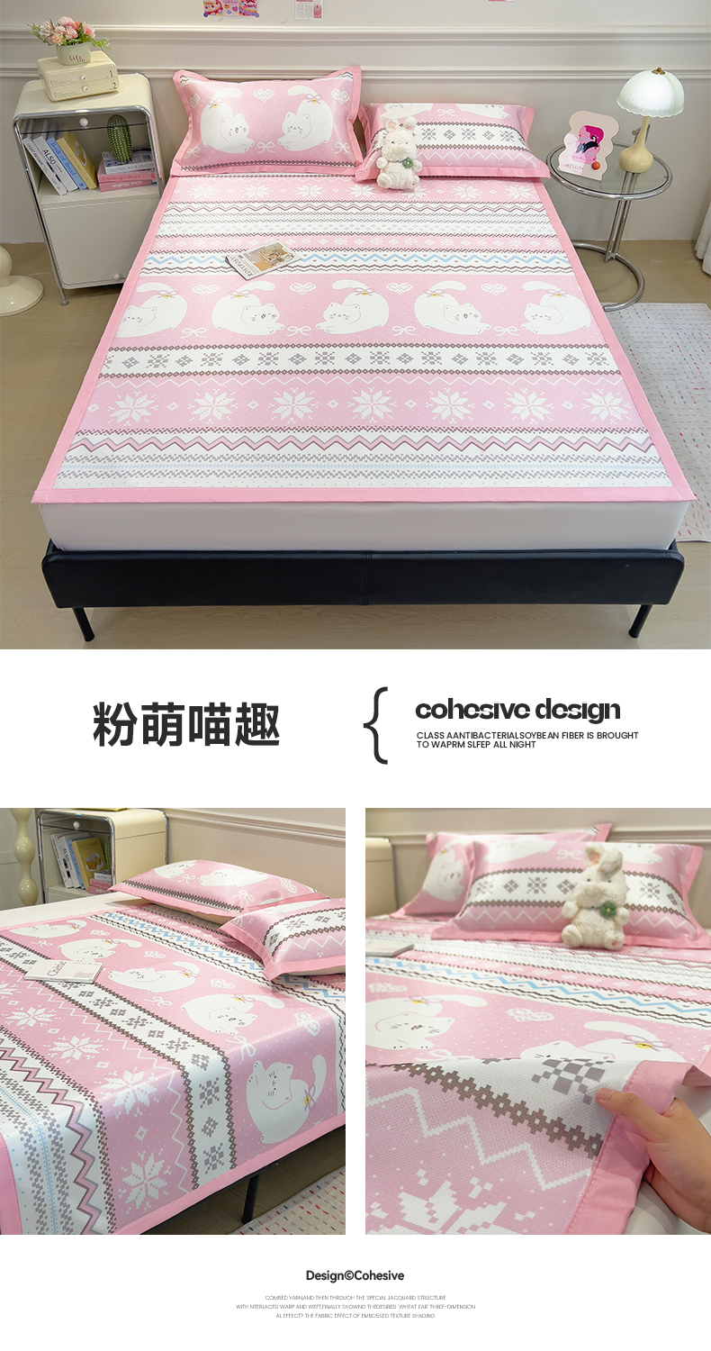 商品名称:摩妮卡 2025小清新数码冰丝席 碳光席三件套 粉萌喵趣