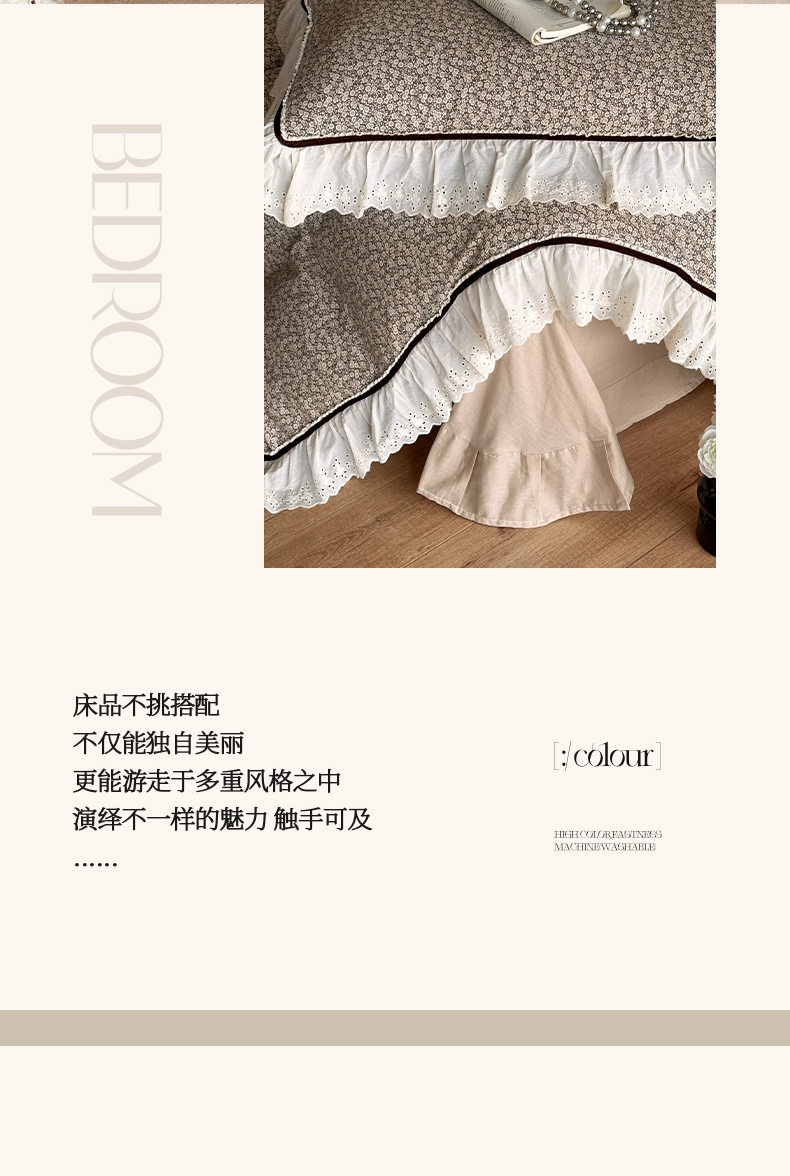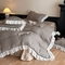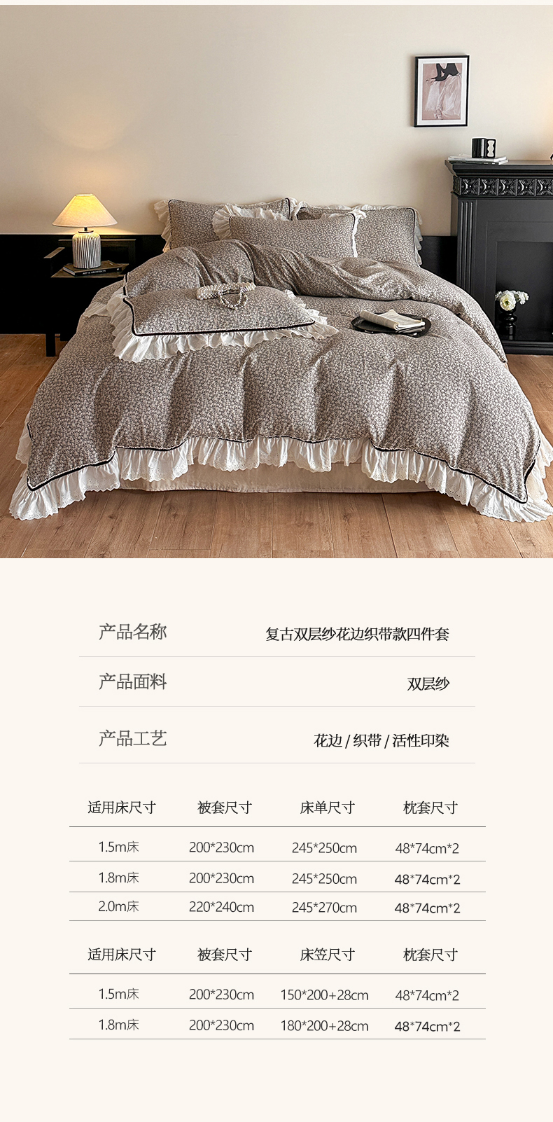 商品名称:蓝邻家纺 2025春夏新款全棉纯棉复古双层纱花边织带款四件套 莱茵茶桂