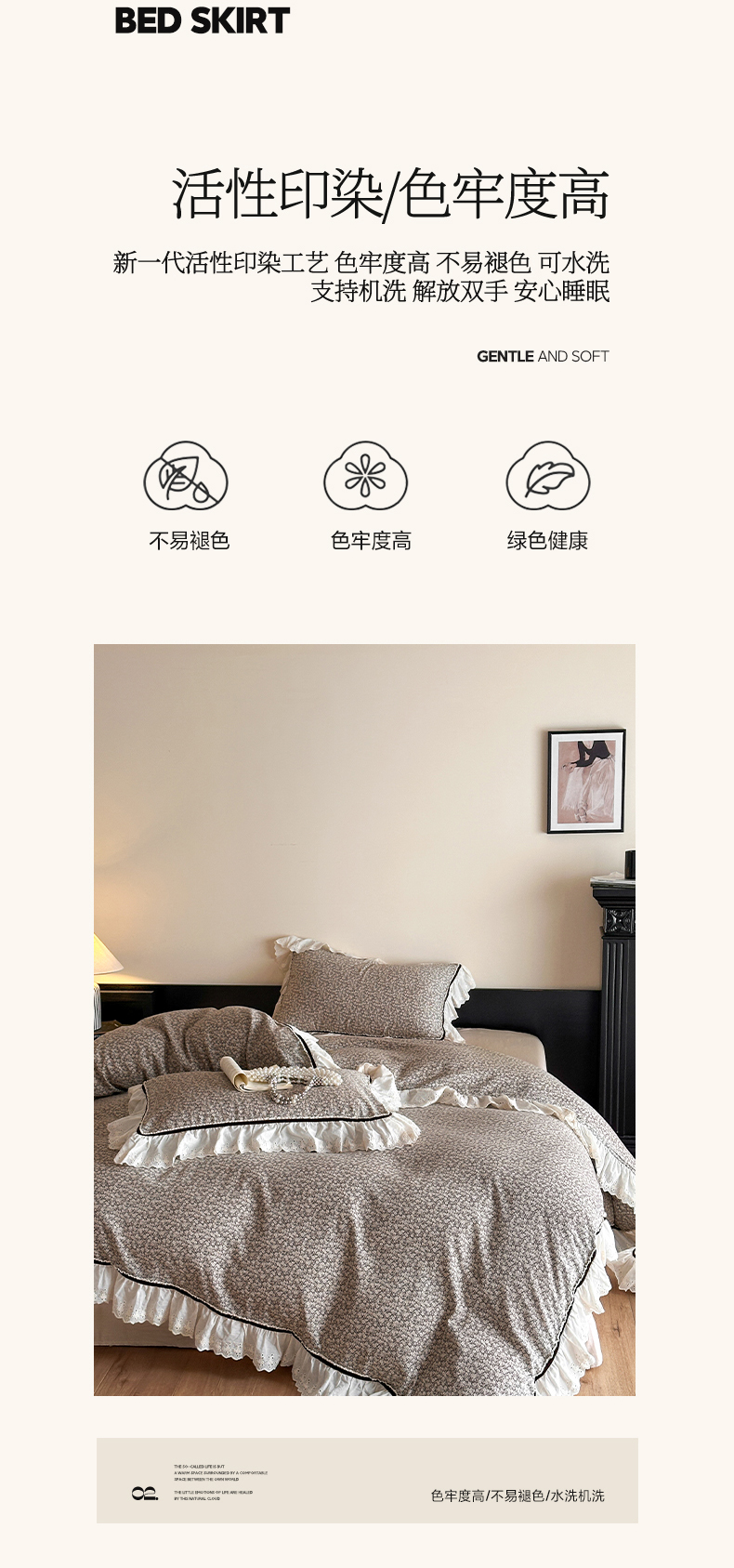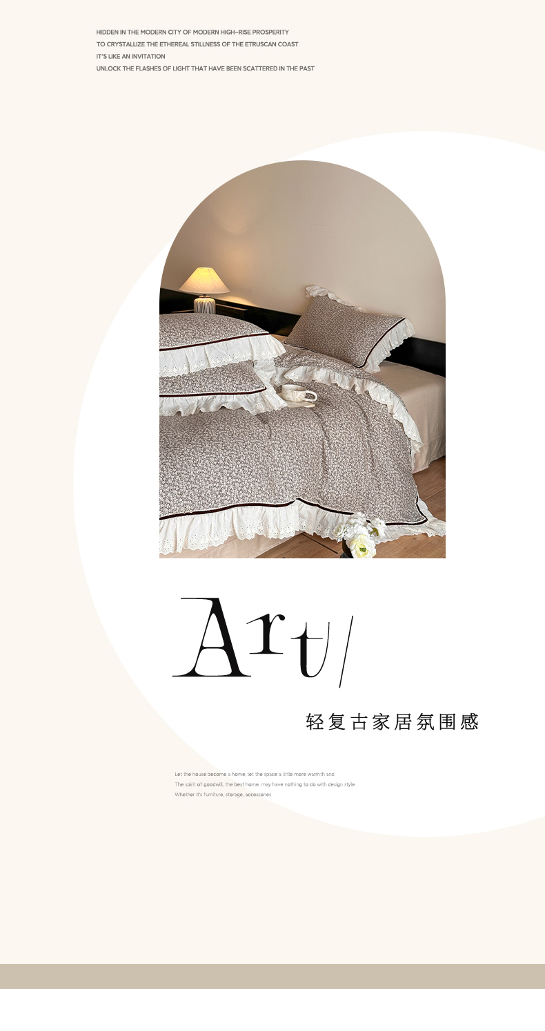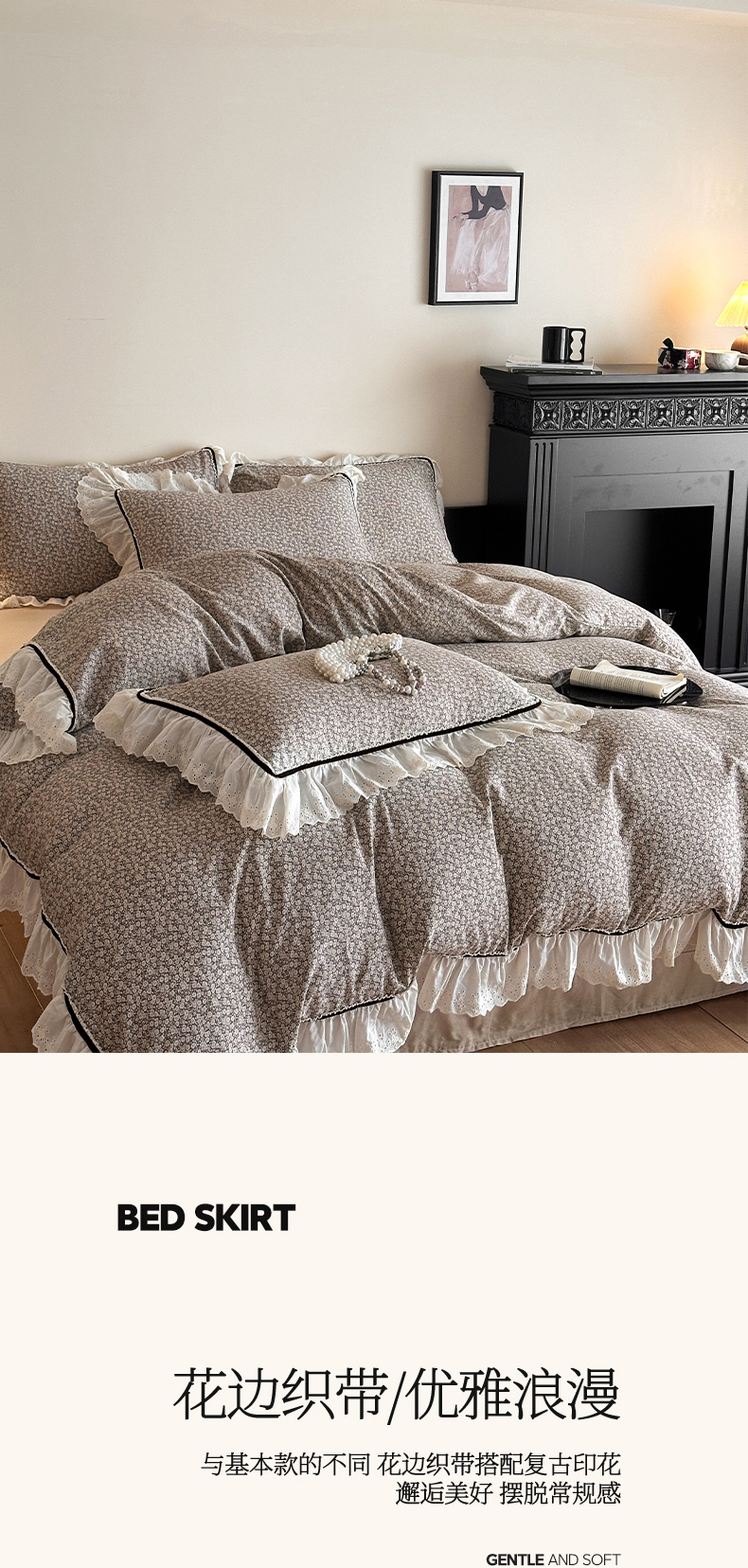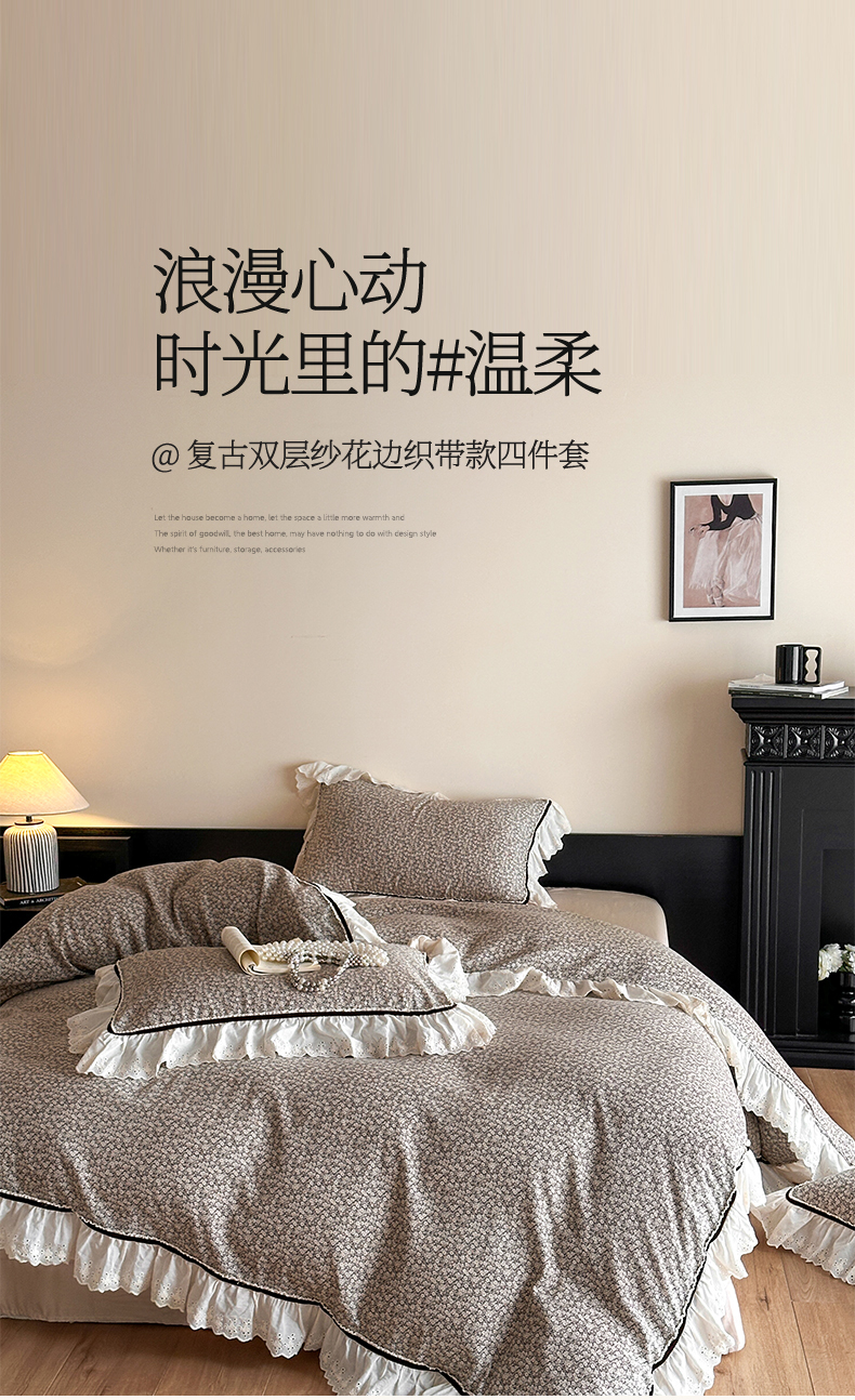 蓝邻家纺 2025春夏新款全棉纯棉复古双层纱花边织带款四件套 莱茵茶桂