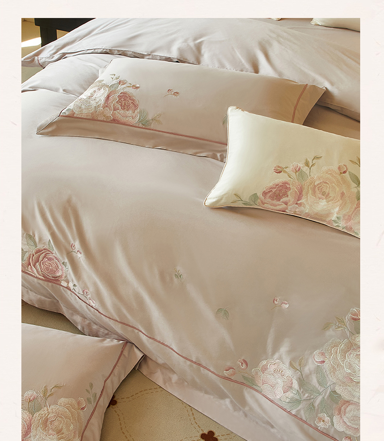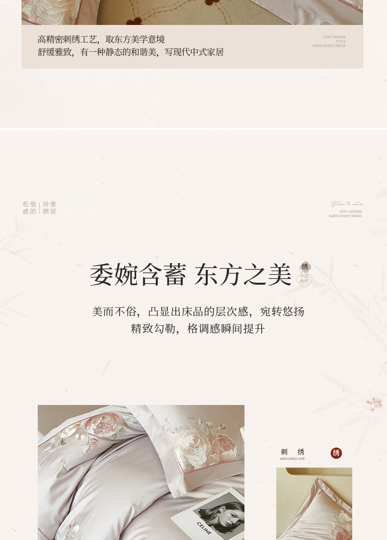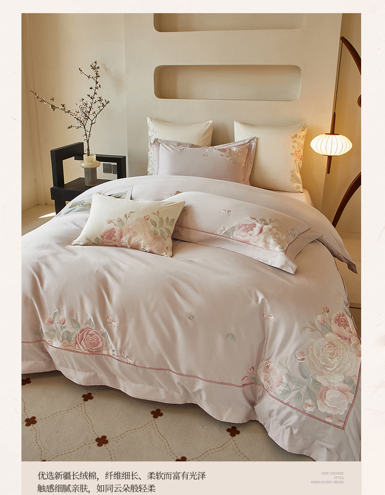 (总)50支50S长绒棉刺绣四件套新中式工艺款,荷塘月色粉 控价478-498元,荷塘月色玉 控价478-498元,翩翩起舞 控价478-498元,温馨满园粉玉 控价478-498元,温馨满园芋紫 控价478-498元,玉露清华 控价478-498元