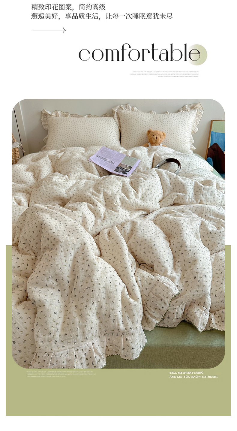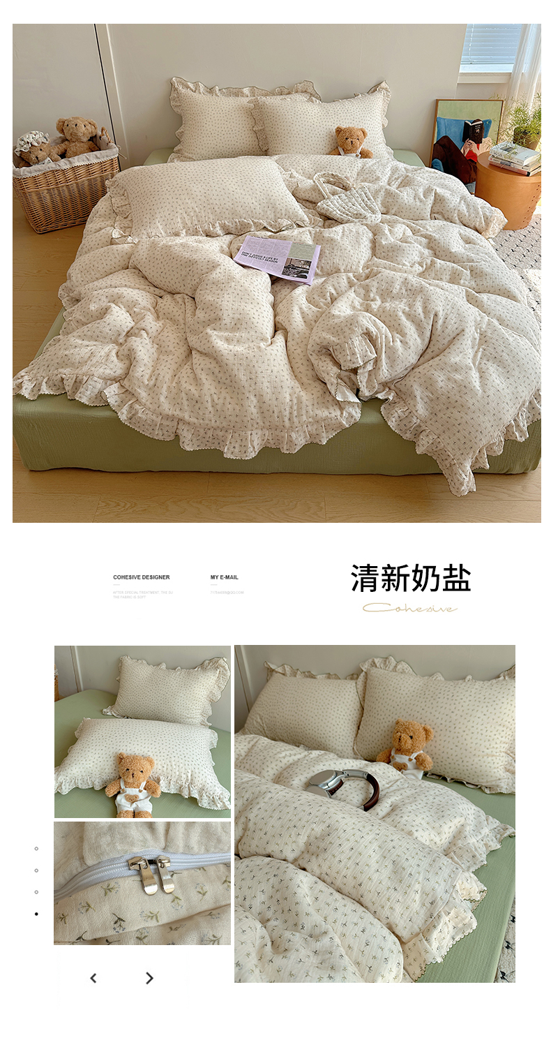 2025新韩版花边全棉双层皱皱纱布四件套 清新奶盐