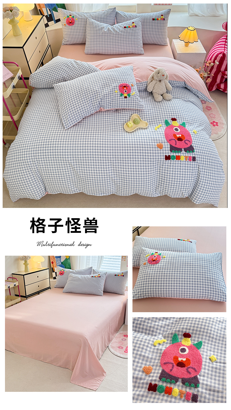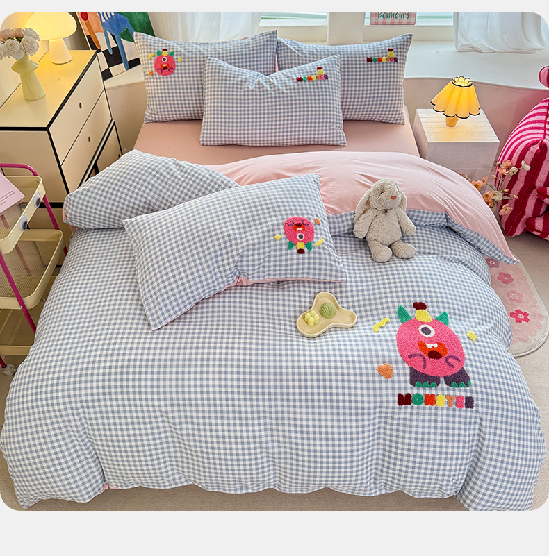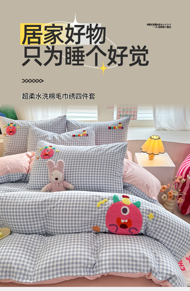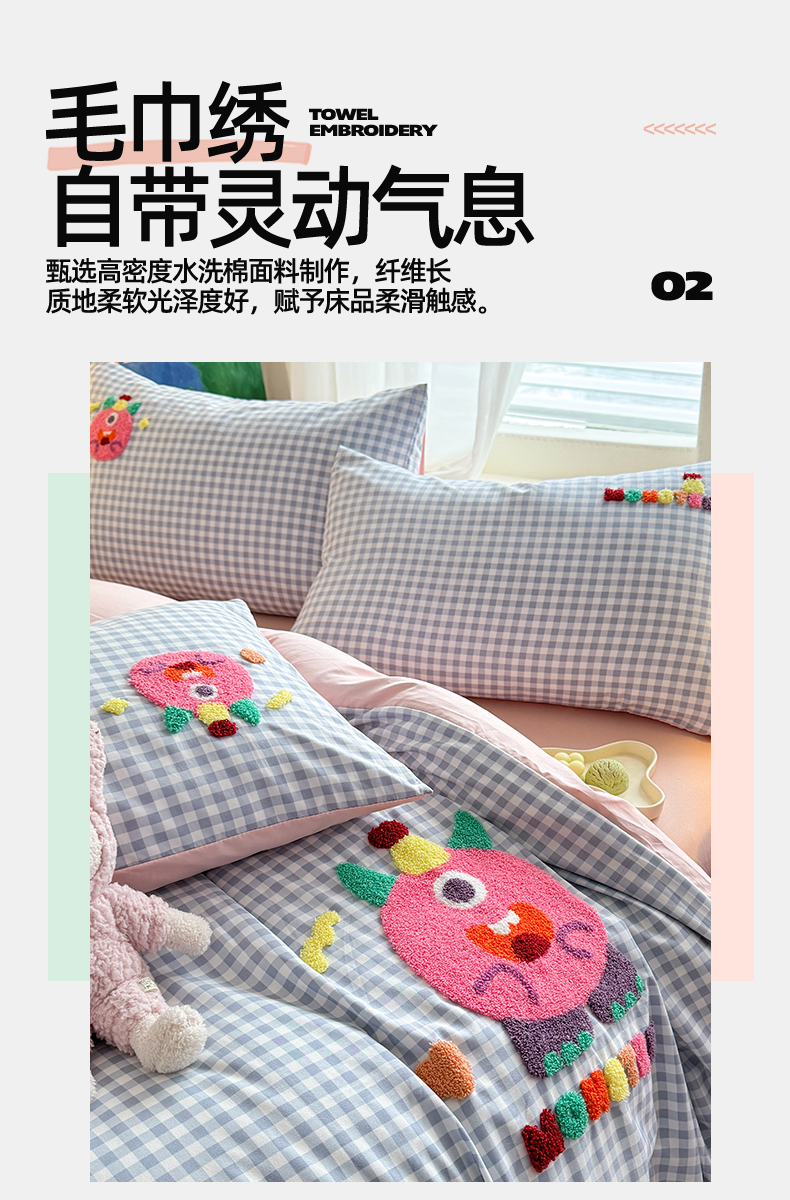 当前位置: 91家纺网 > 商品网购 > 床品套件 > 四件套 > 水洗棉四件套 > 多品 2025春夏新款水洗棉毛巾绣卡通系列四件套-系列二 格子怪兽