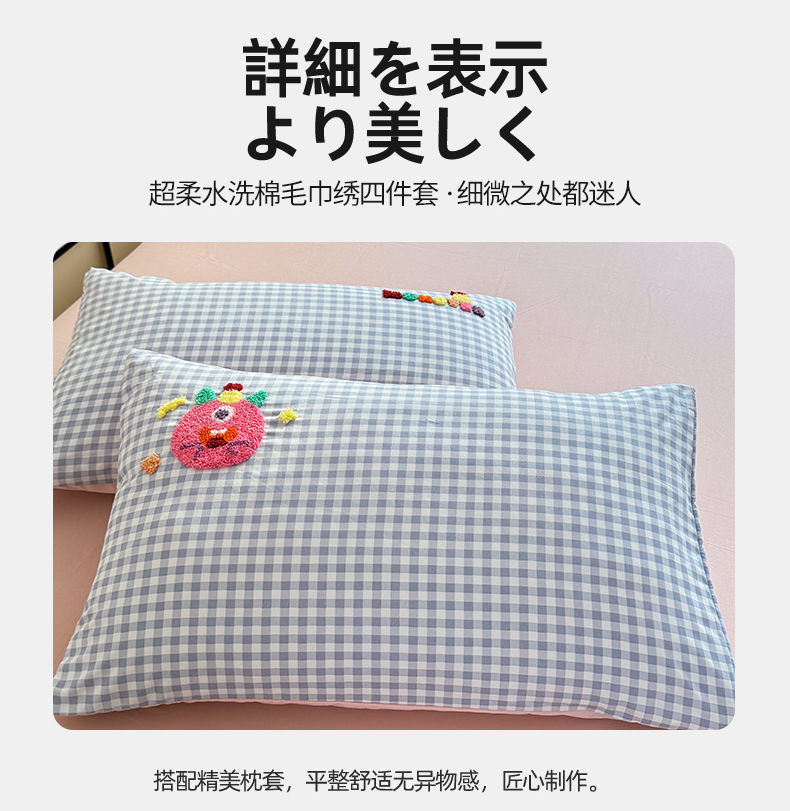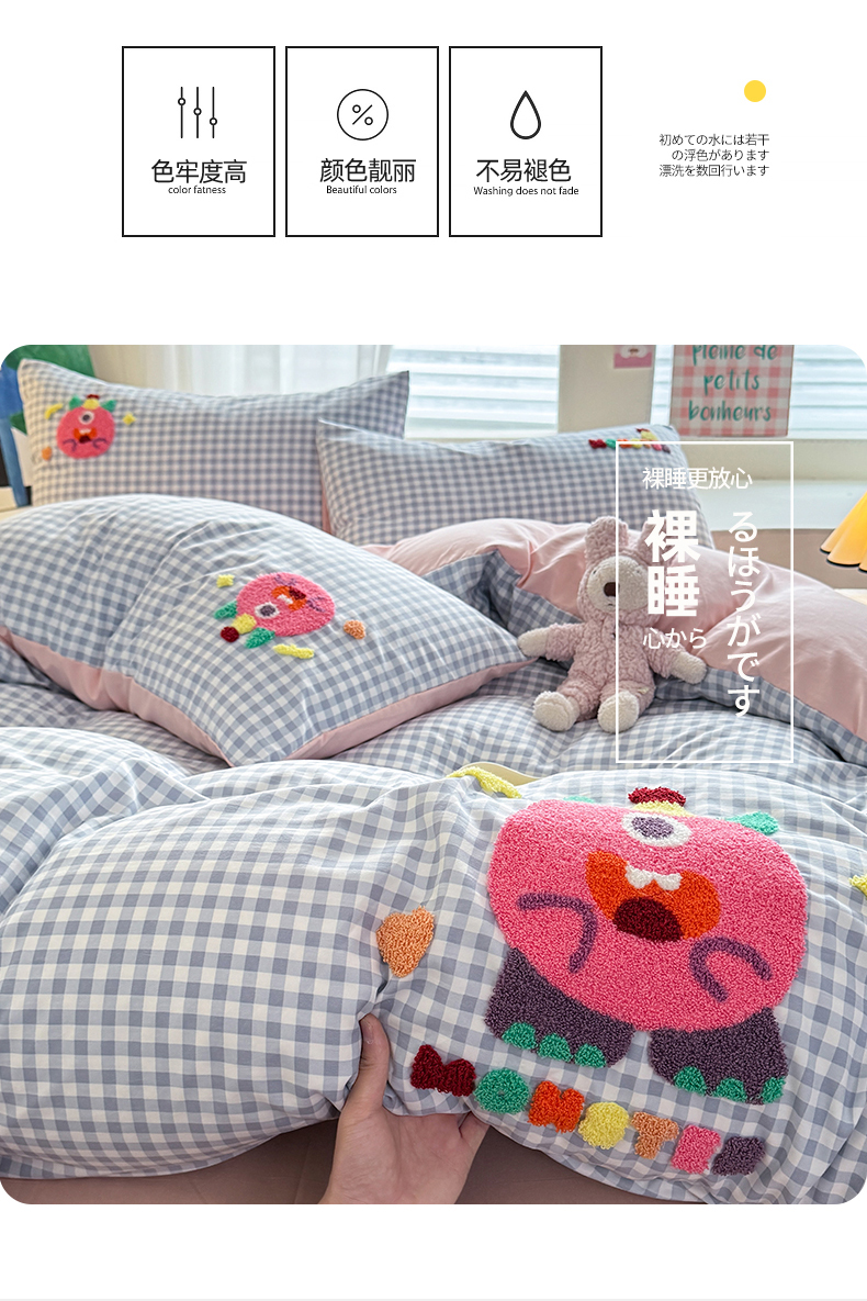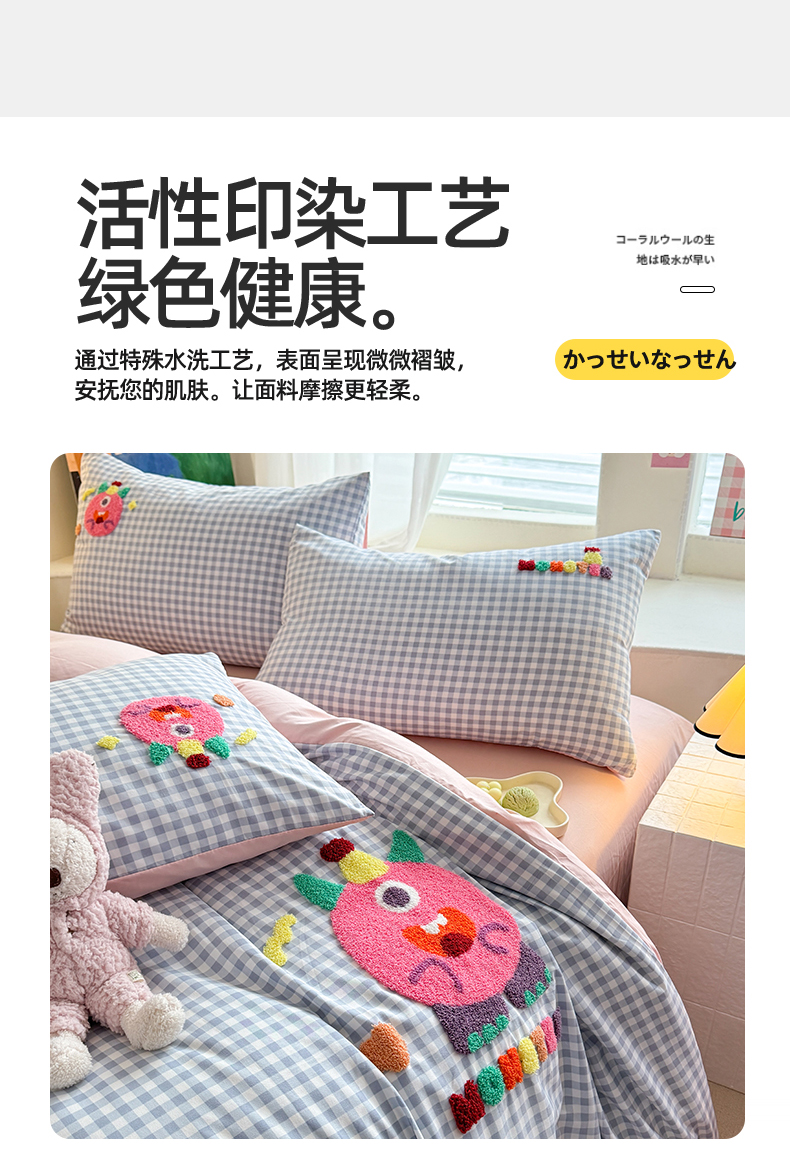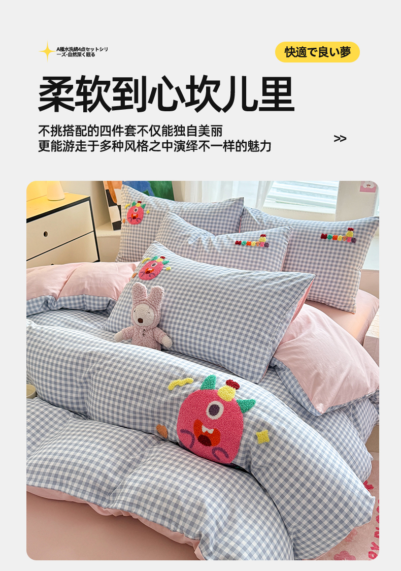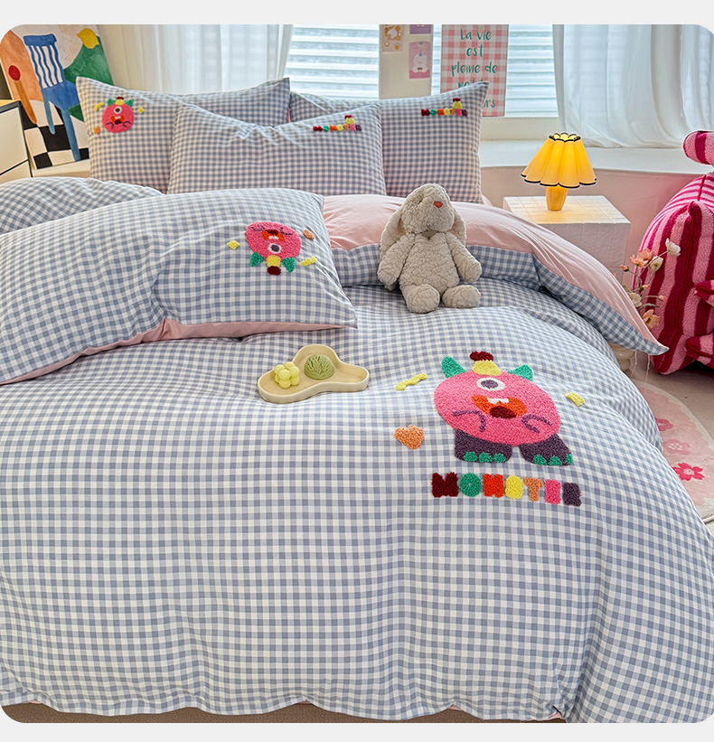 当前位置: 91家纺网 > 商品网购 > 床品套件 > 四件套 > 水洗棉四件套 > 多品 2025春夏新款水洗棉毛巾绣卡通系列四件套-系列二 格子怪兽