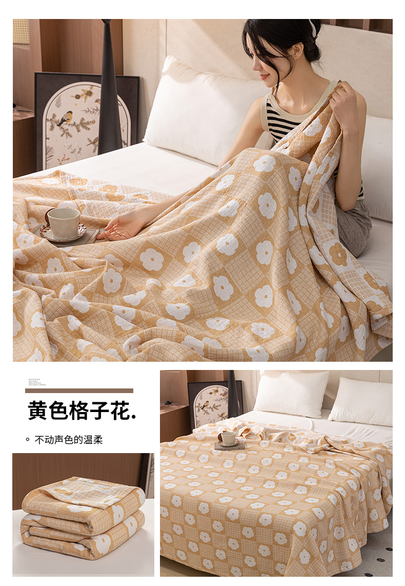商品名称:乐家毛巾被 2025春夏新款三层棉全棉纯棉毛巾被 黄色格子花